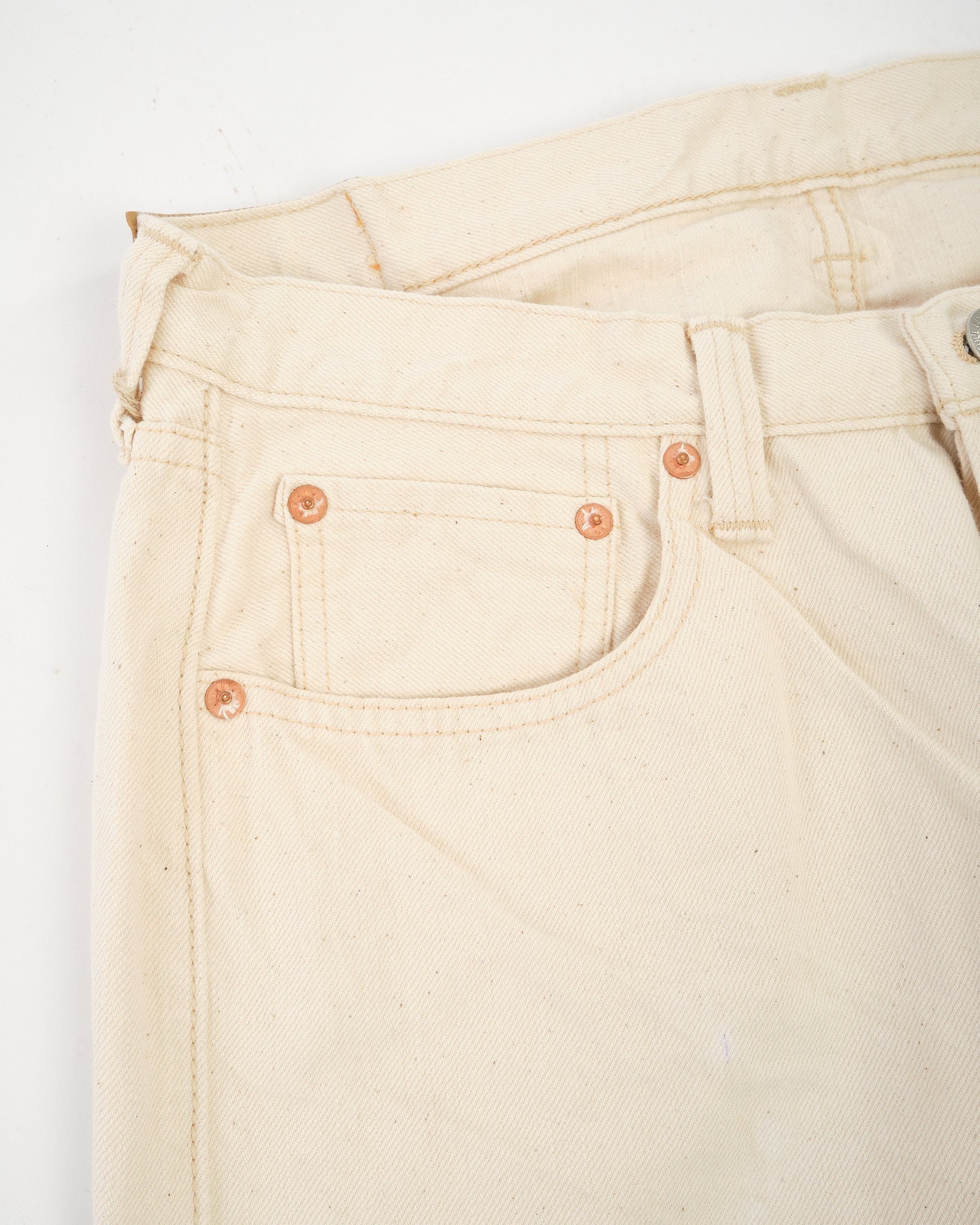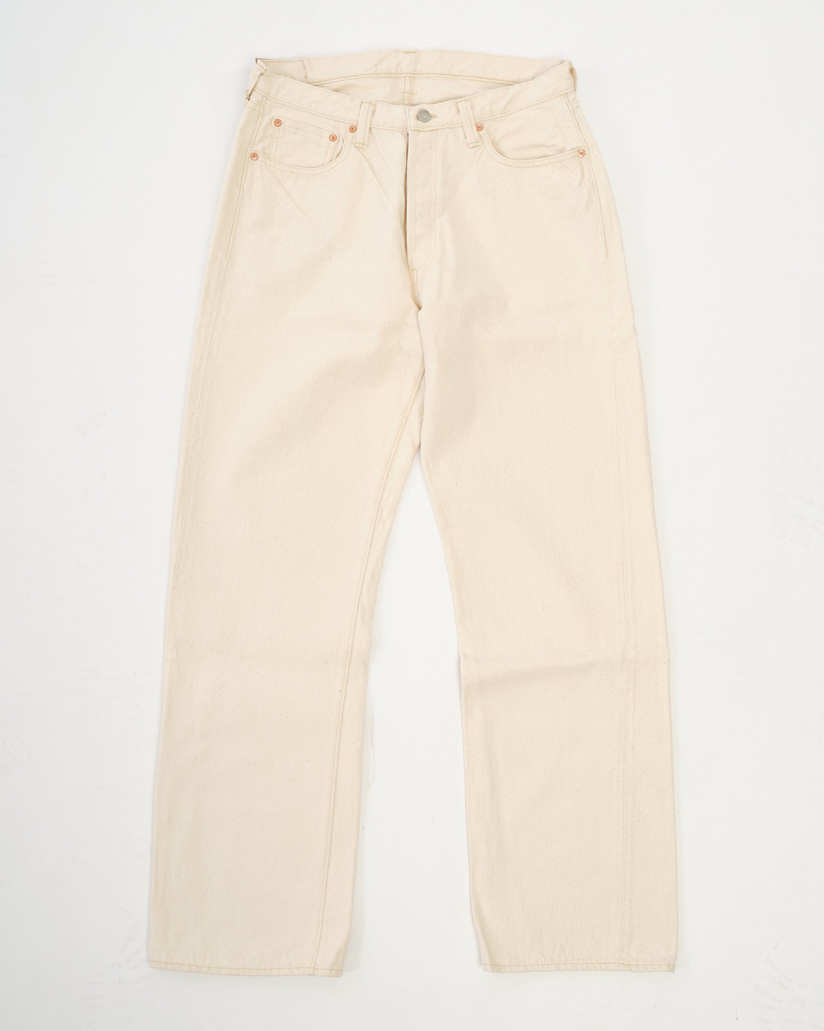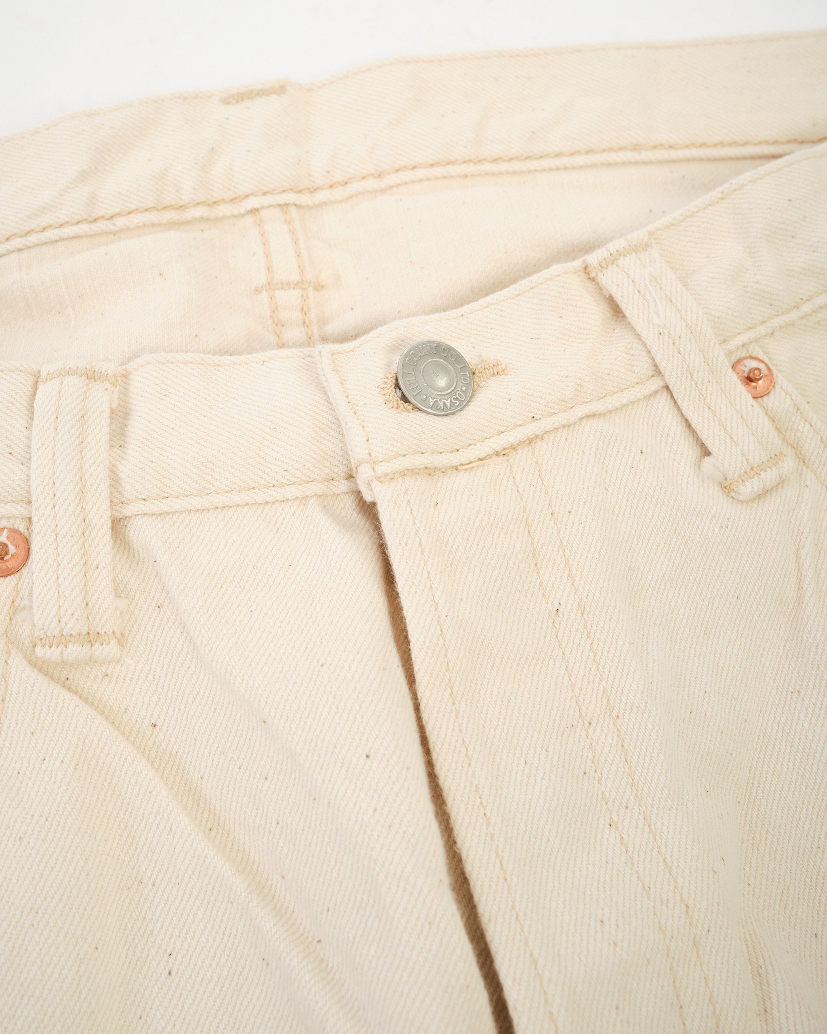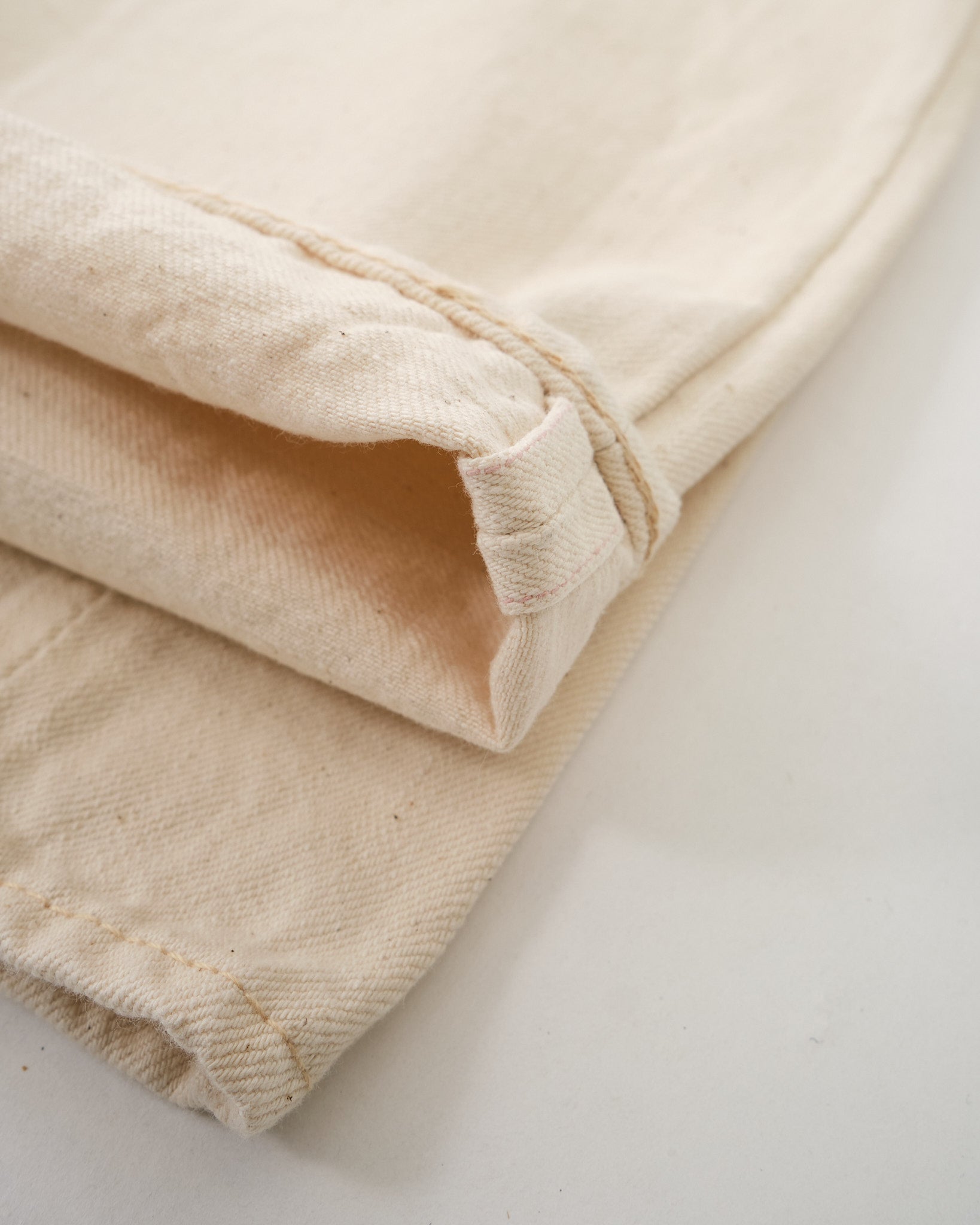 The Full Count 0105EC Wide Ecru Selvedge Denim celebrates Zimbabwean cotton in its purest form. Left completely undyed and unbleached, this 13.7oz selvedge fabric preserves the cotton’s natural tone and character, including subtle flecks of leaf and stem that add organic depth. With wear and washing, these fragments gradually fall away, revealing an even softer, beautifully textured surface.