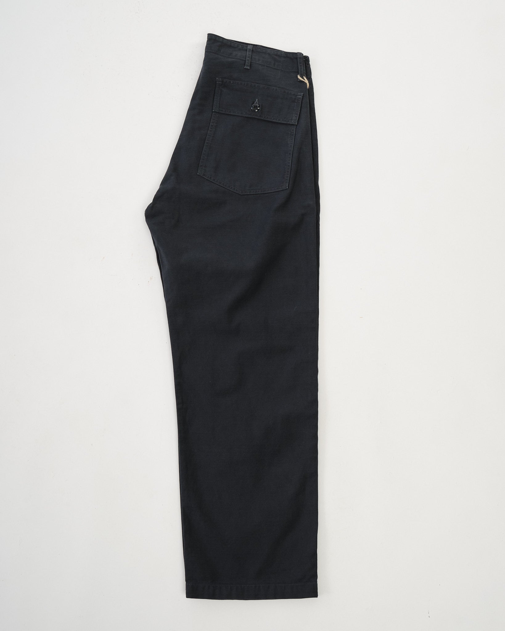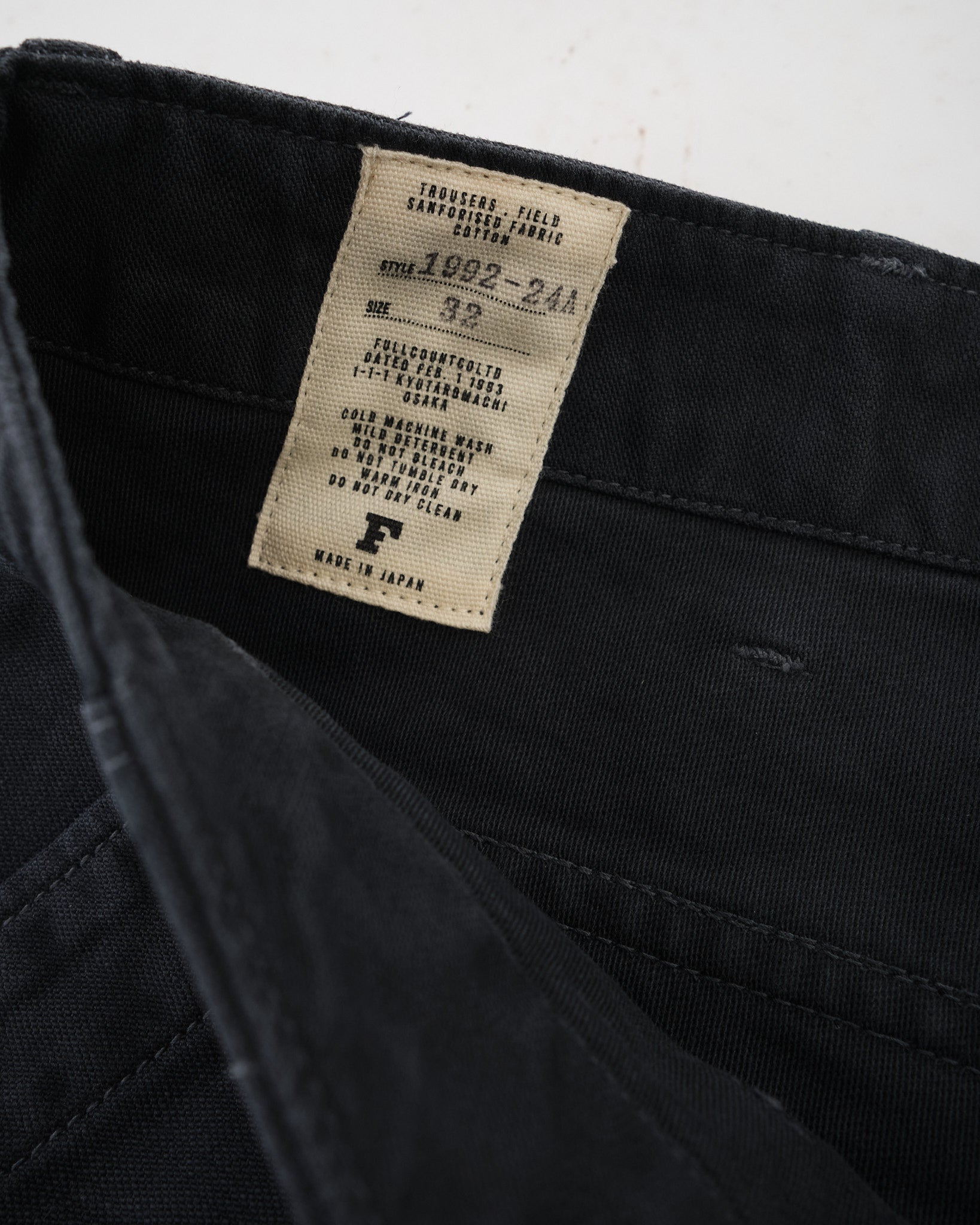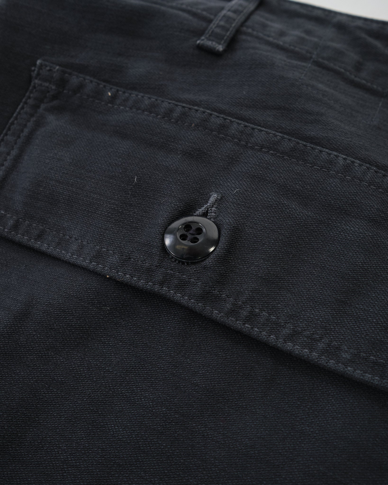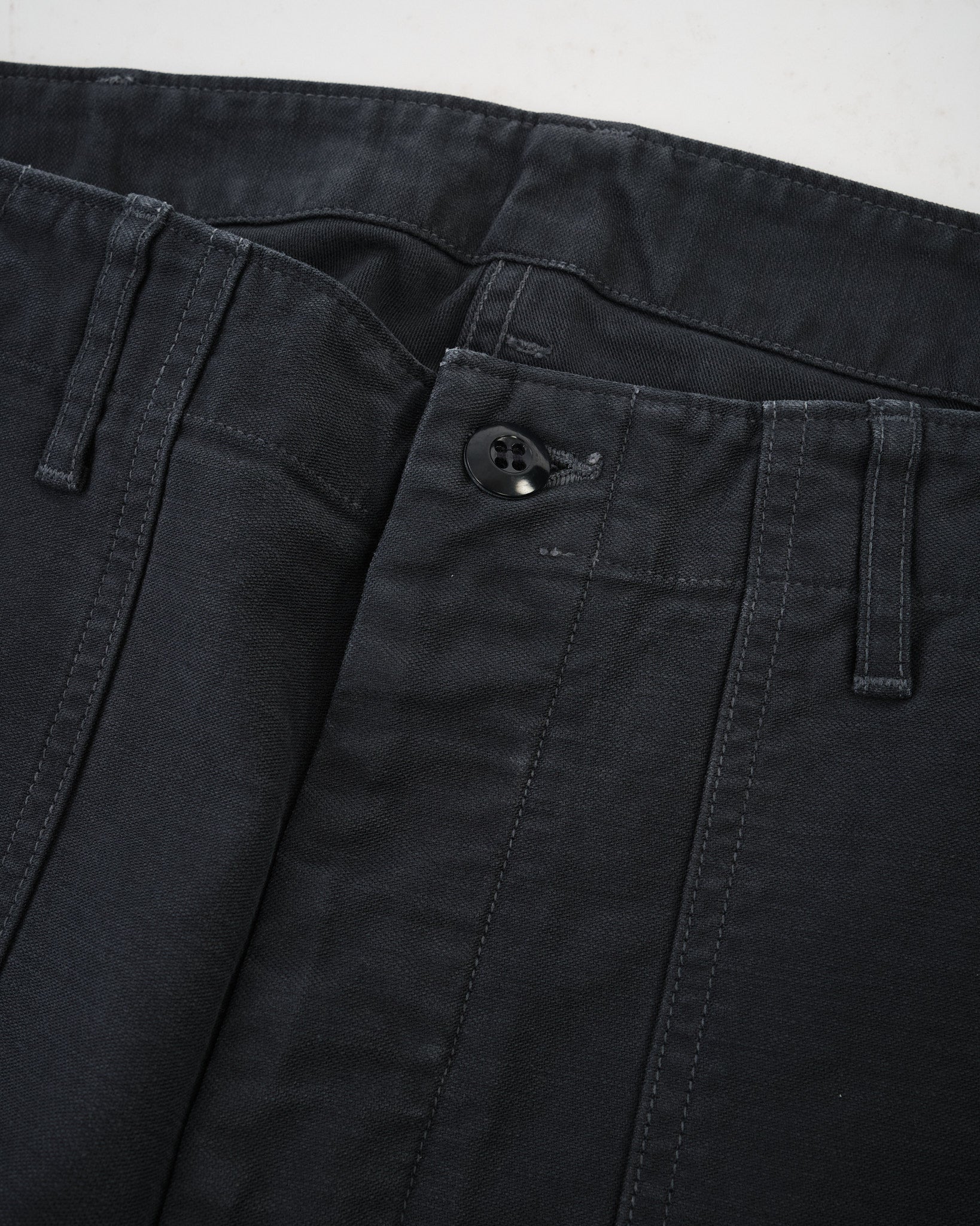Die FULL COUNT 1992-24A UTILITY TROUSERS in BLACK (1992-24A) sind eine moderne Interpretation der klassischen Baker-Hose, bekannt für ihr militärisches Erbe und funktionales Design. Nach Jahren der Forschung und Verfeinerung wurden diese Hosen perfektioniert, um die authentische Weichheit und Haltbarkeit von Vintage-Arbeitskleidung einzufangen. Hergestellt aus 100% Baumwolle Militär-Rückensatin, wurde der Stoff bis auf die Fasern sorgfältig analysiert, um das geschmeidige Gefühl der originalen Baker-Hosen zu replizieren. Der mit Schwefel gefärbte schwarze Stoff gewährleistet einen allmählichen Alterungsprozess, der mit der Zeit eine einzigartige Patina entwickelt. Zusätzlich verbessert eine Ozonbehandlung den eingetragenen Komfort und die Textur des Stoffs vom ersten Tragen an.