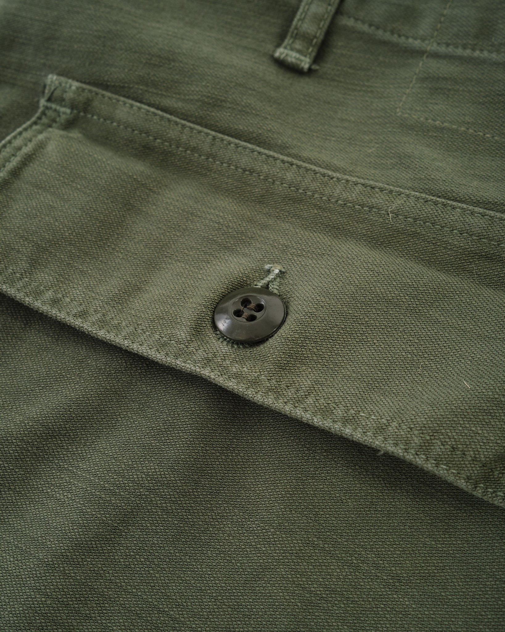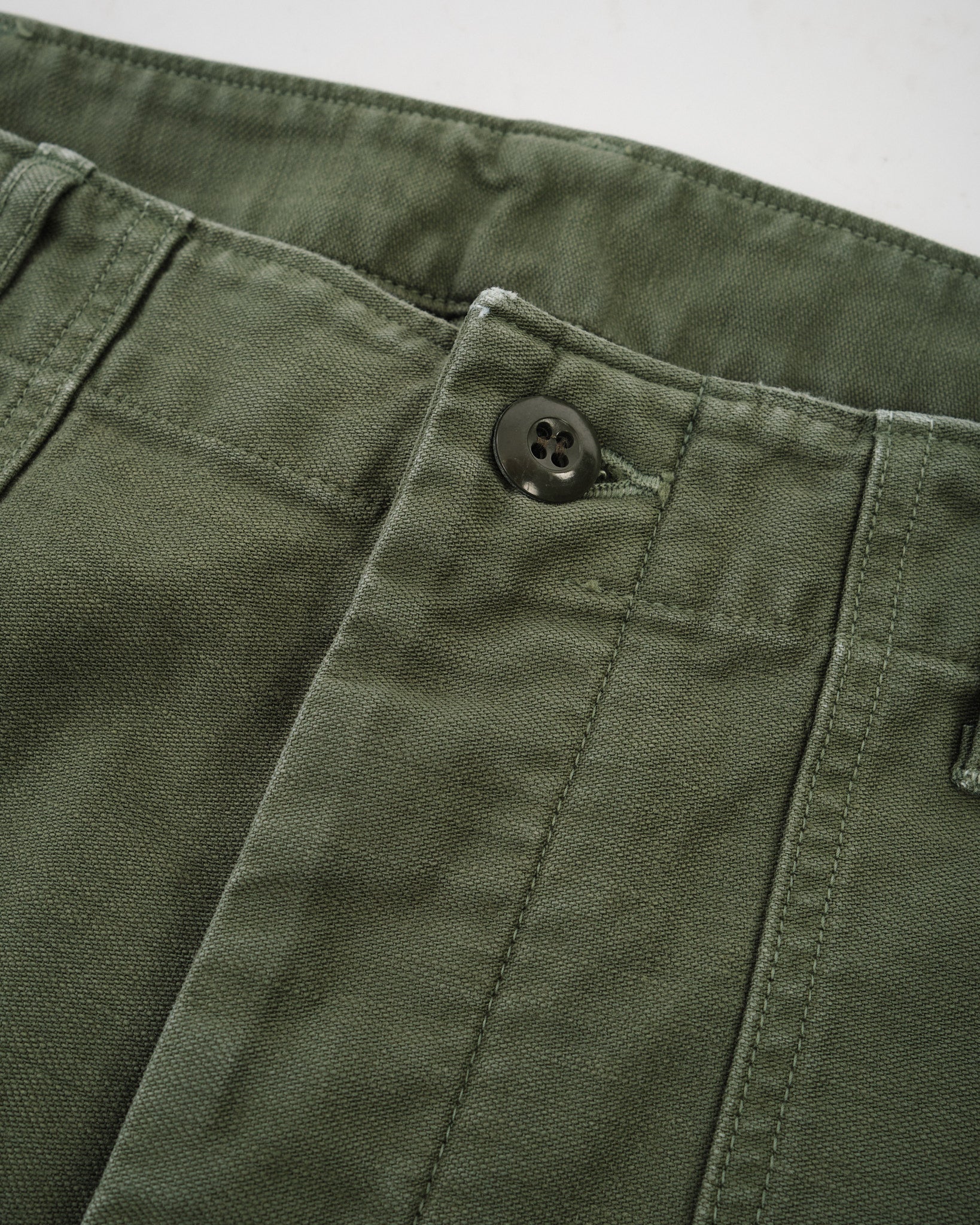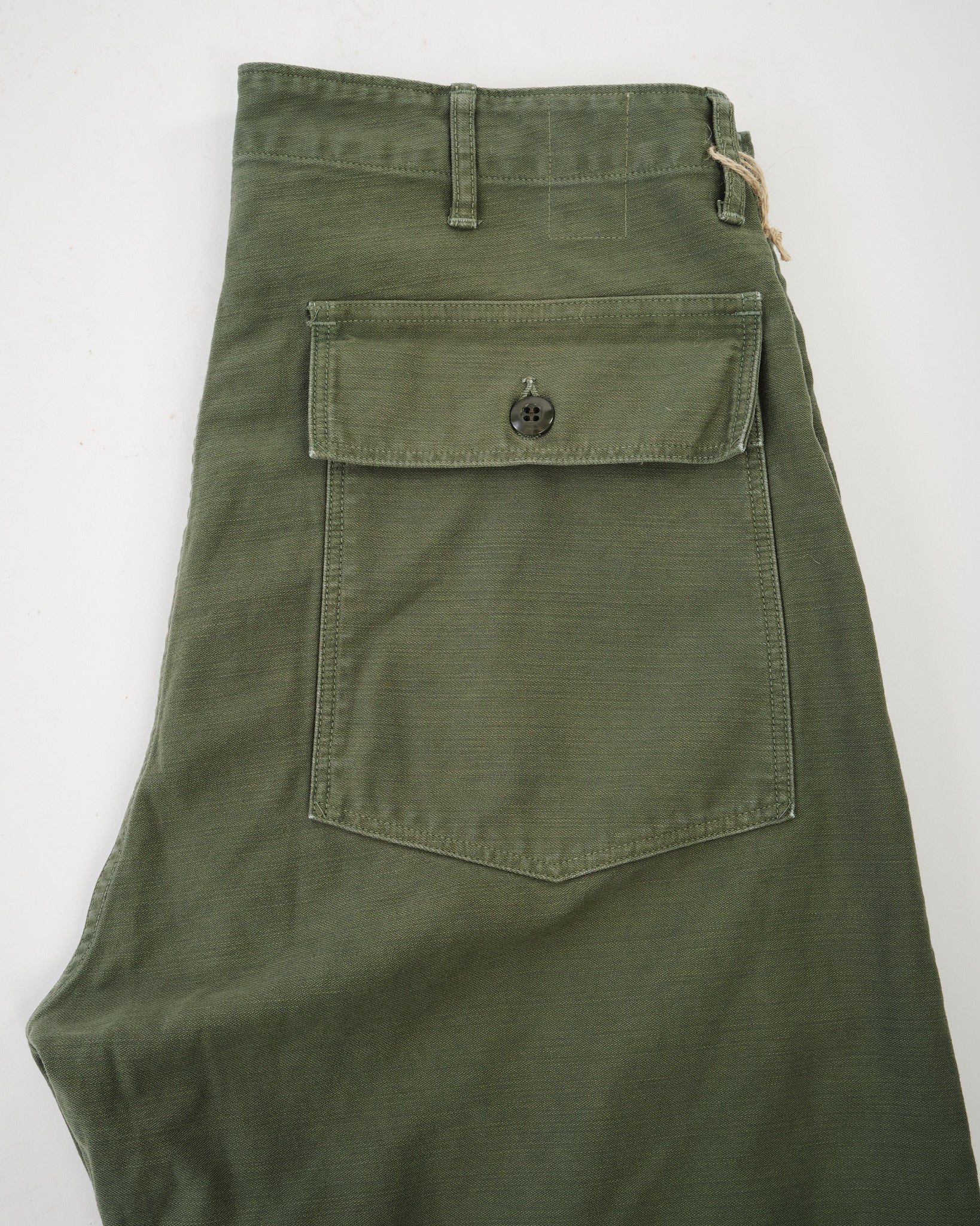 Die FULL COUNT 1992-24A UTILITY TROUSERS in OLIVE DRAB (1992-24A) sind eine Hommage an eines der ikonischsten militärischen Kleidungsstücke - Baker-Hosen. Nach Jahren sorgfältiger Forschung und Entwicklung sind diese Hosen nun ein fester Bestandteil der Full Count-Kollektion. Hergestellt aus 100% Baumwoll-Militär-Backsatin, wurde der Stoff bis zum Faden gründlich analysiert, um das geschmeidige Gefühl von Vintage-Baker-Hosen zu replizieren. Der mit Schwefel gefärbte Stoff sorgt dafür, dass die Farbe allmählich altert und mit der Zeit eine einzigartige Patina entwickelt. Zusätzlich wurde eine Ozonbehandlung angewendet, um die Weichheit und Textur von natürlich eingetragenen Kleidungsstücken zu erreichen, was diese Hosen vom ersten Tragen an bequem macht.