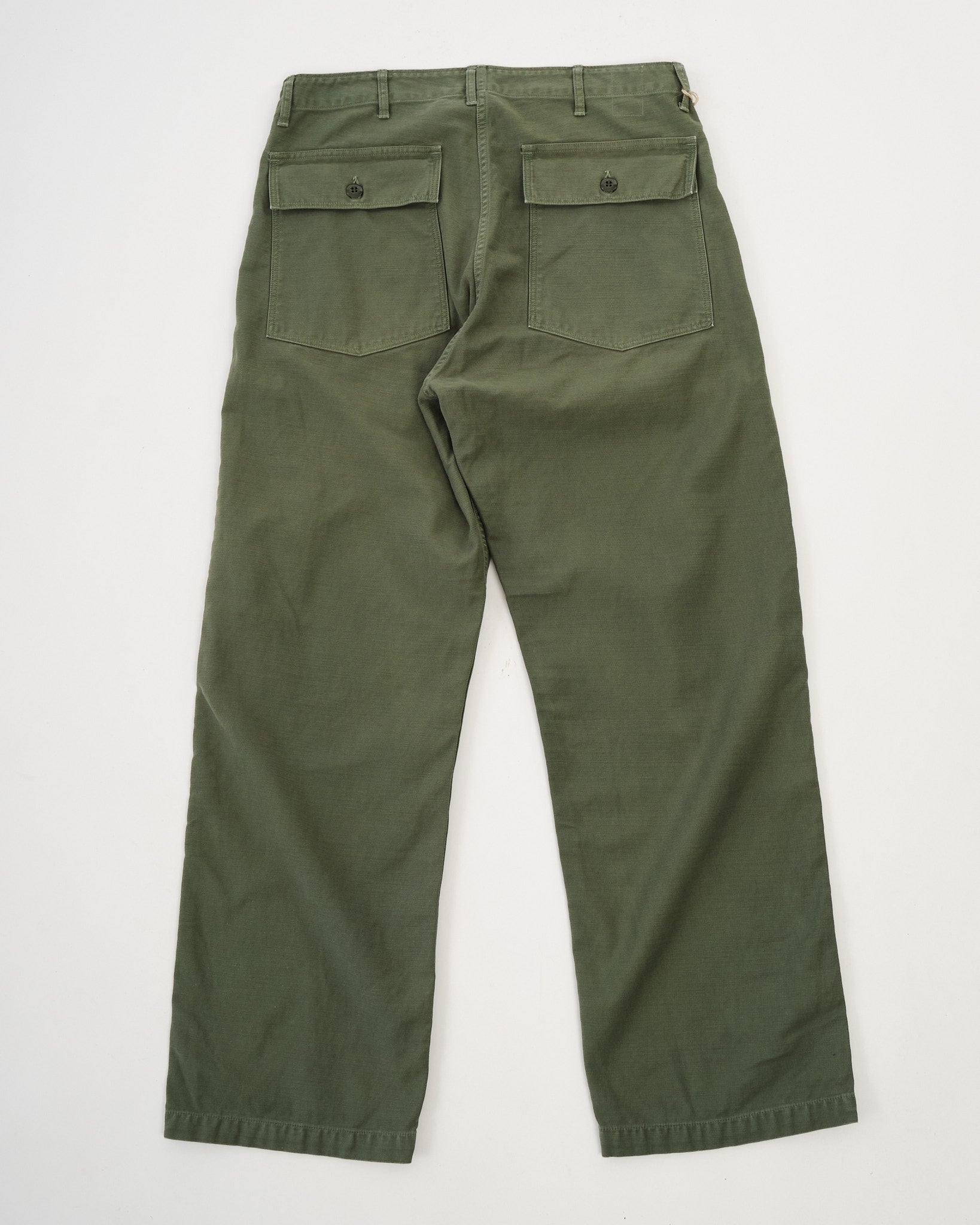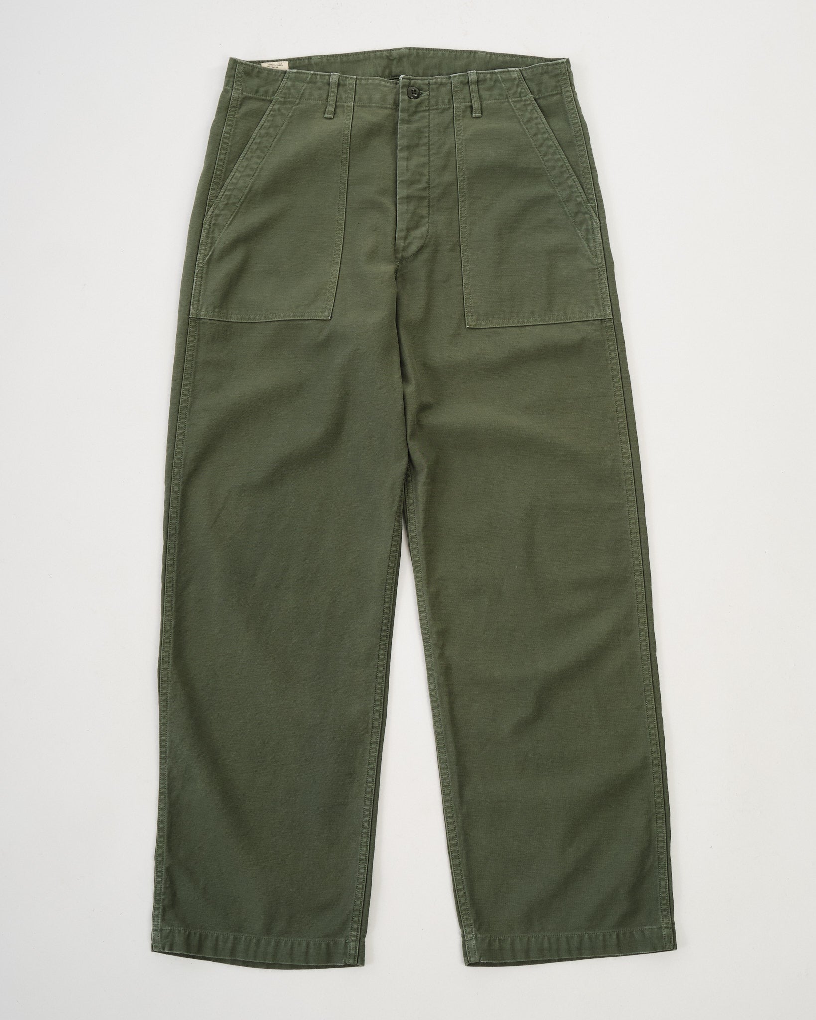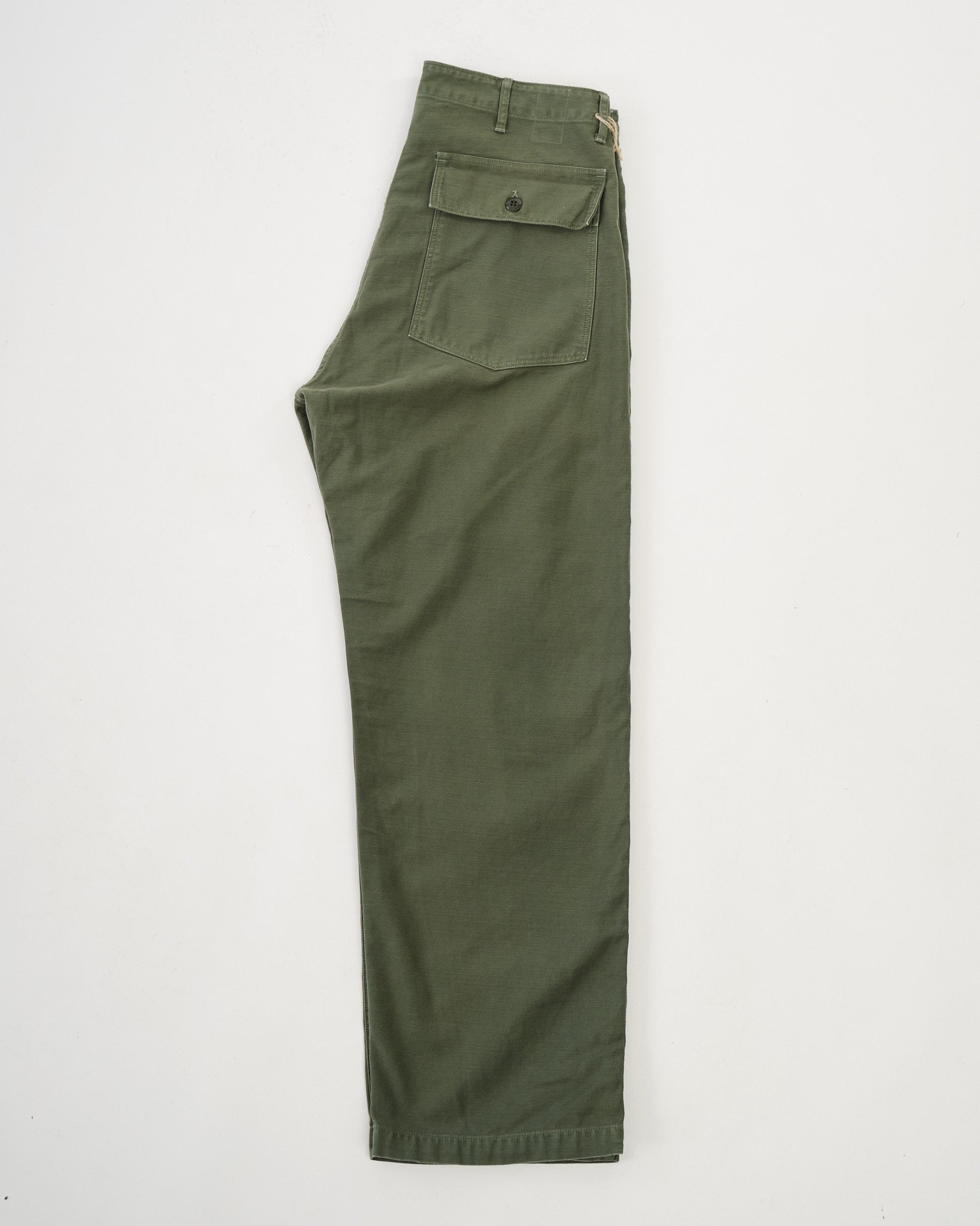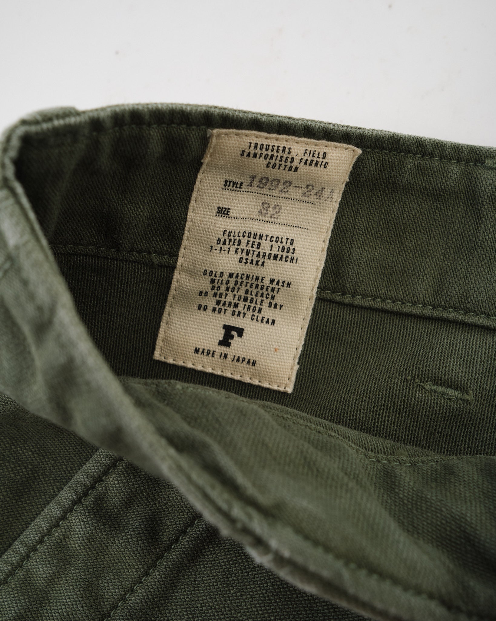 Die FULL COUNT 1992-24A UTILITY TROUSERS in OLIVE DRAB (1992-24A) sind eine Hommage an eines der ikonischsten militärischen Kleidungsstücke - Baker-Hosen. Nach Jahren sorgfältiger Forschung und Entwicklung sind diese Hosen nun ein fester Bestandteil der Full Count-Kollektion. Hergestellt aus 100% Baumwoll-Militär-Backsatin, wurde der Stoff bis zum Faden gründlich analysiert, um das geschmeidige Gefühl von Vintage-Baker-Hosen zu replizieren. Der mit Schwefel gefärbte Stoff sorgt dafür, dass die Farbe allmählich altert und mit der Zeit eine einzigartige Patina entwickelt. Zusätzlich wurde eine Ozonbehandlung angewendet, um die Weichheit und Textur von natürlich eingetragenen Kleidungsstücken zu erreichen, was diese Hosen vom ersten Tragen an bequem macht.