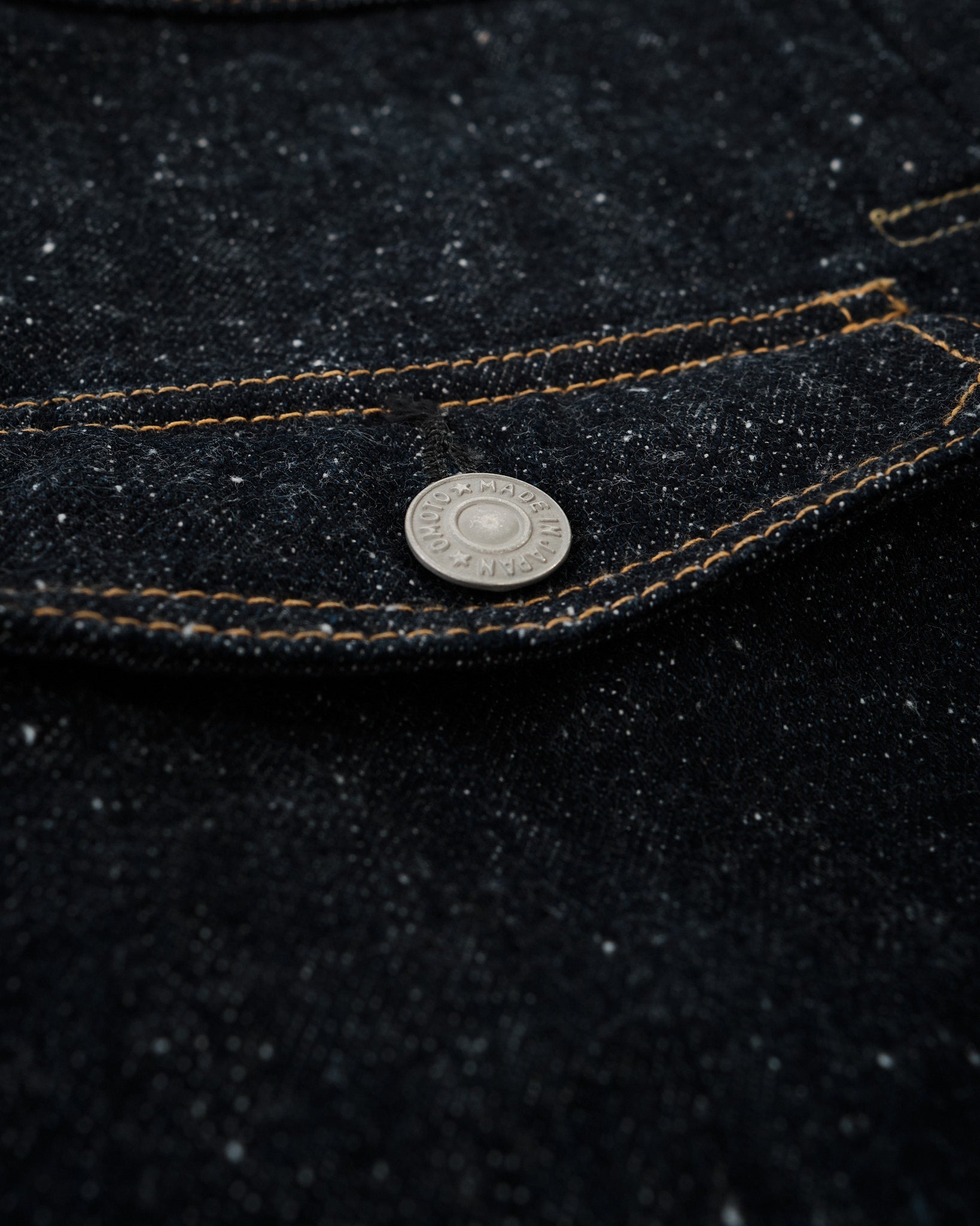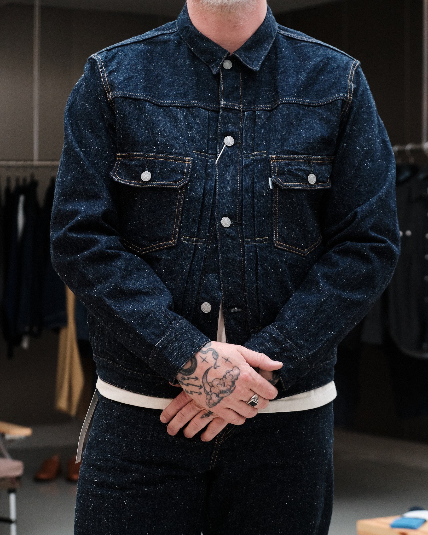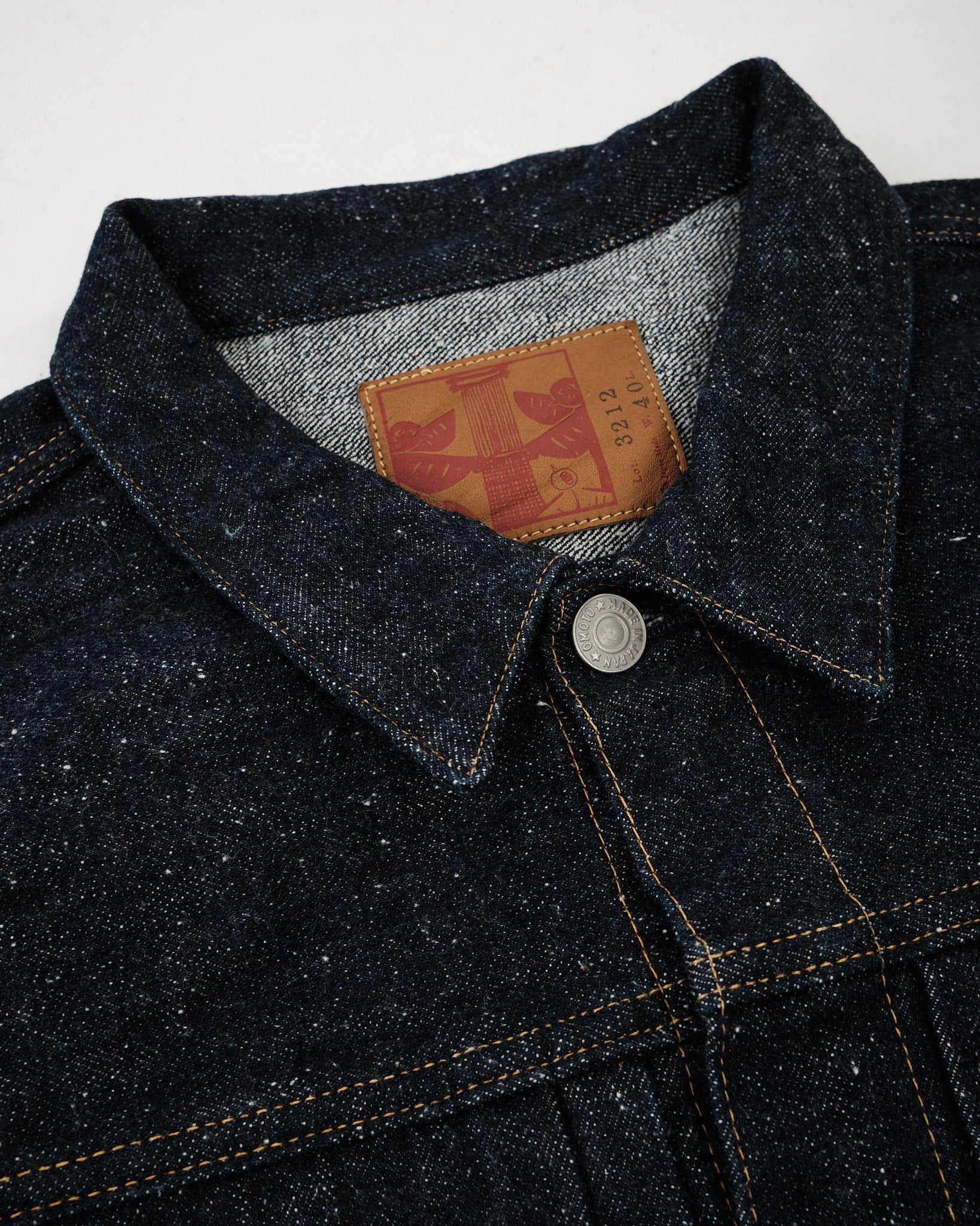 Die OMOTO 3212 2nd Type Denim Jacke ist eine moderne Hommage an klassische Arbeitskleidung, gefertigt aus 16oz Nep-Denim mit einer reichen, texturierten Oberfläche. Die Kettfäden beinhalten kurze Baumwollfasern (27mm oder weniger), was eine robuste, unebene Textur erzeugt, während die Schussfäden unter Verwendung der traditionellen "Gara-bo"-Technik gesponnen werden, was eine rustikale, handgesponnene Ästhetik mit einer atmungsaktiven, luftigen Struktur verleiht.