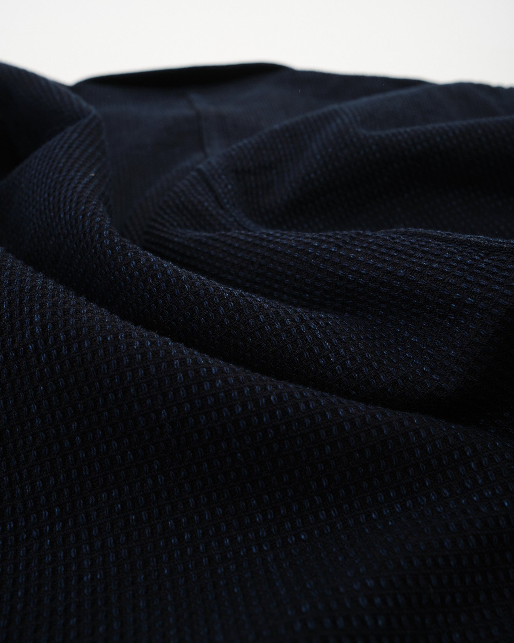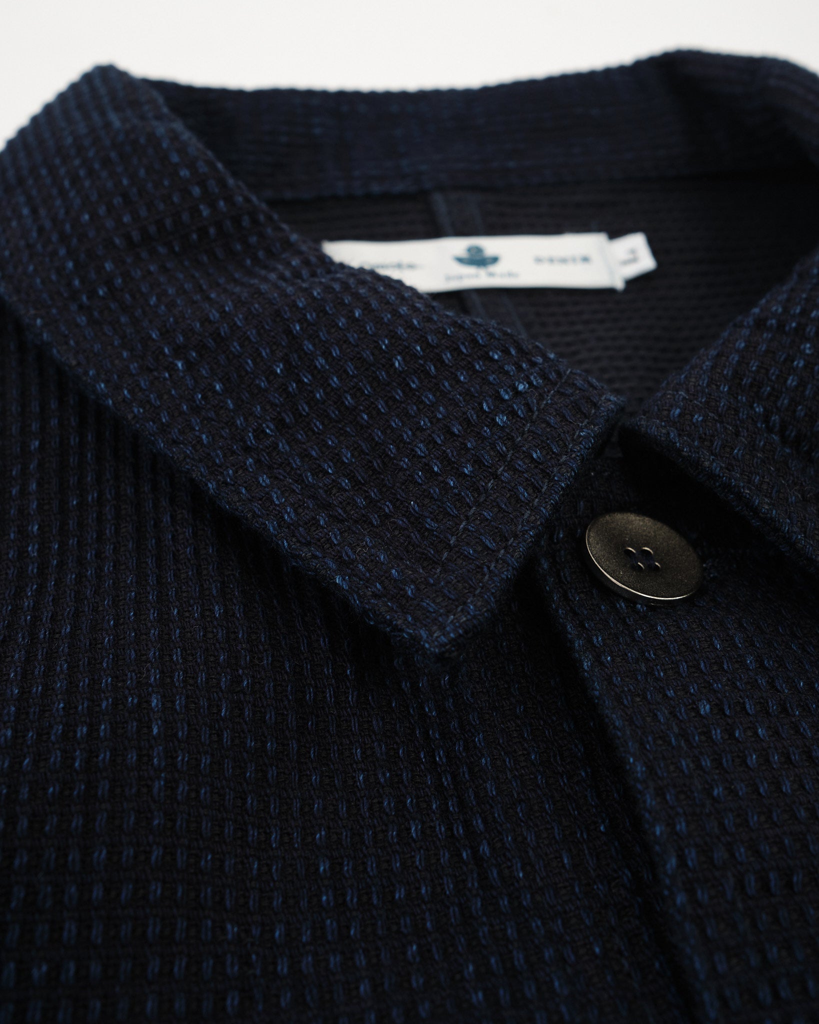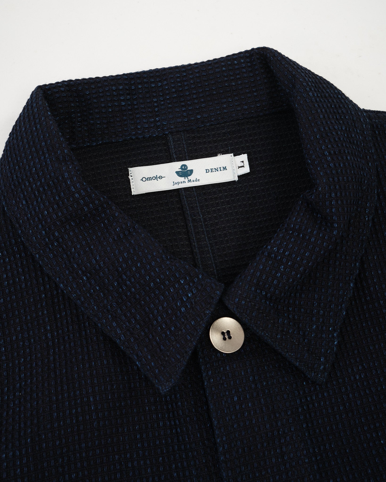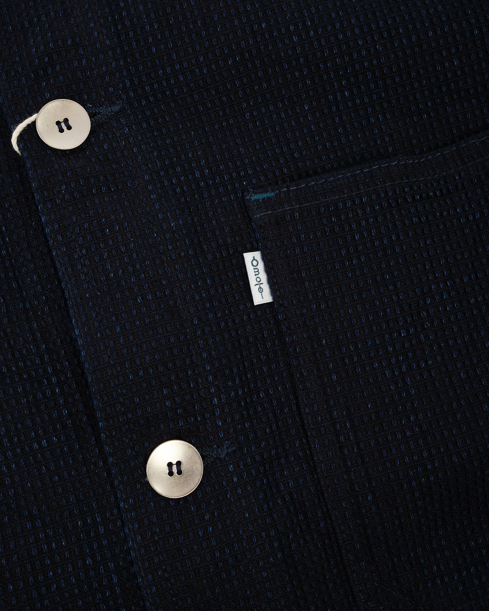 Stilnummer: 3720 12oz Cube Sashiko Denim mit einem reichen, texturierten Gefühl Inspiriert von traditionellen Sashiko-Stichen für Haltbarkeit & Erbe Handwerkskunst Gewebt mit Denim-Garnen, um ein historisches Textil für modernes Tragen neu zu interpretieren Indigo-gefärbt für tiefe, kontrastreiche Verblassungen über die Zeit OMOTO’s blau-grünes „MIMI“ Selvedge für ein authentisches Denim-Detail Benutzerdefiniertes Marken-Schafsleder-Patch für eine hochwertige Note Verstärkte Nähte & originale Metallknöpfe für langanhaltende Haltbarkeit Funktionale Brusttaschen & Sashiko-Texturdetails für einen zeitlosen Stil