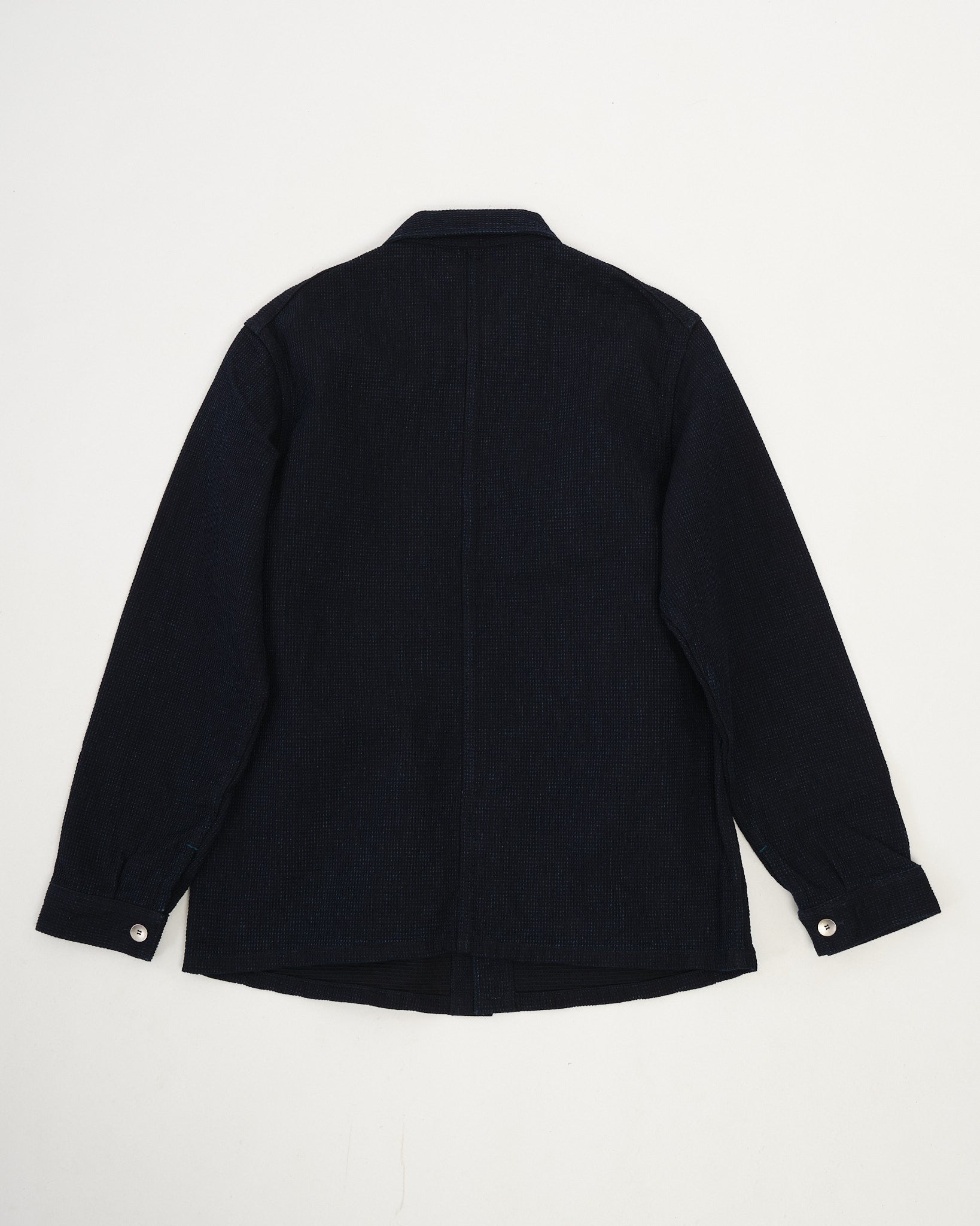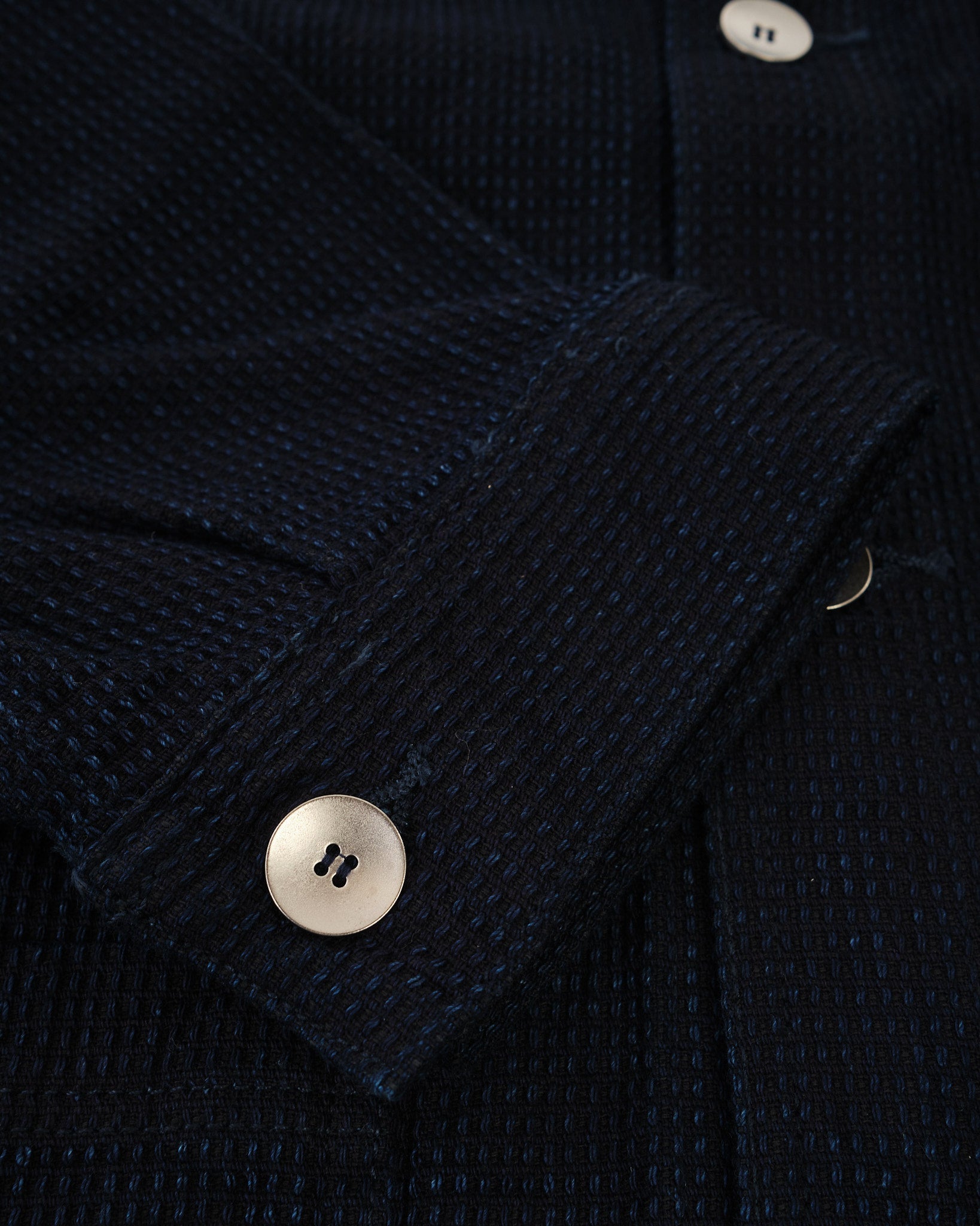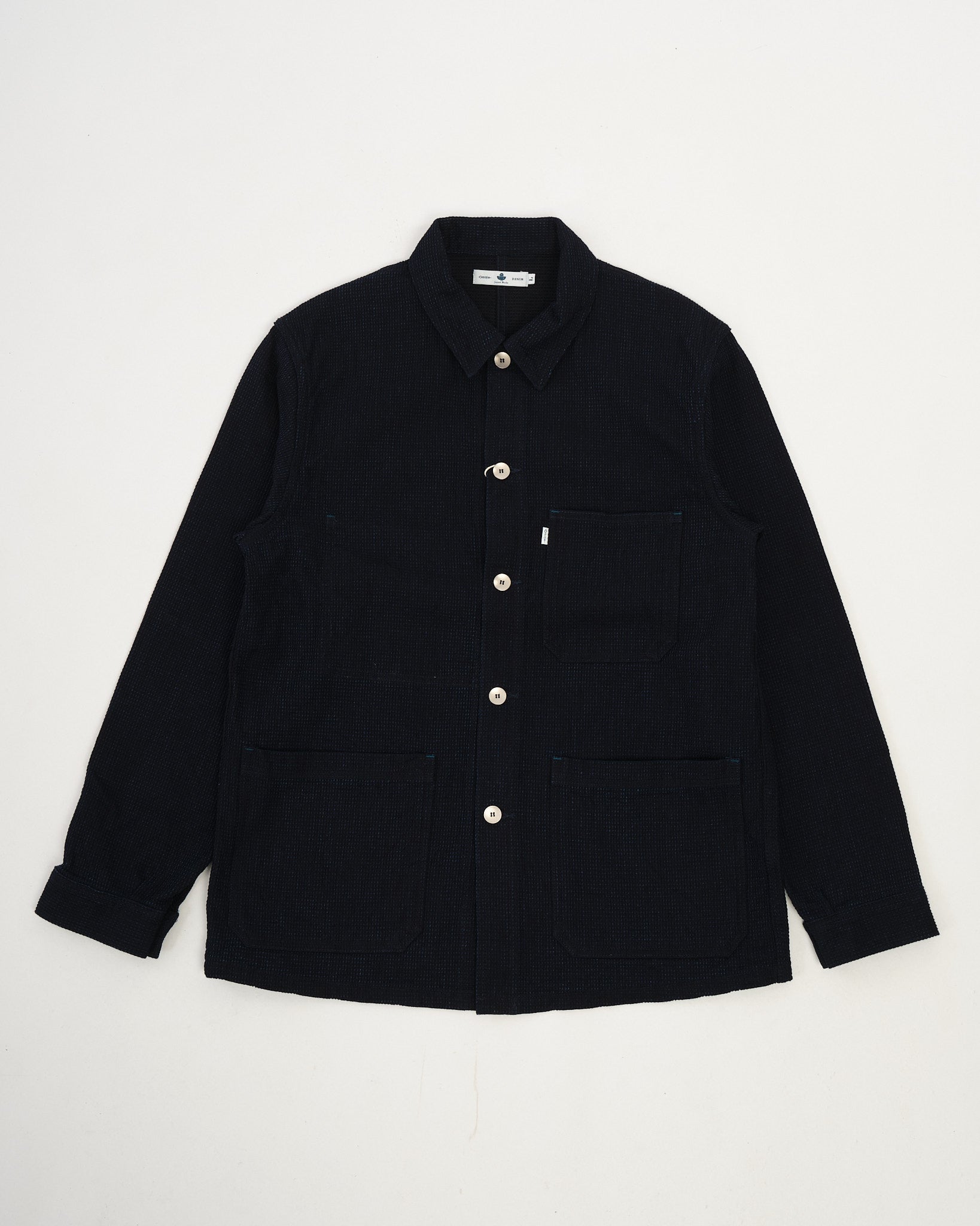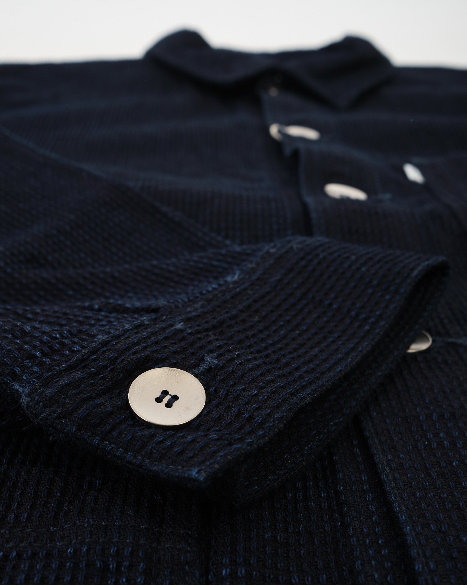 Gewebt für Haltbarkeit und dennoch atmungsaktiv und weich, ist der Stoff darauf ausgelegt, sich mit dem Tragen zu entwickeln und über die Zeit einen einzigartigen Charakter zu entwickeln. Das tiefe indigogefärbte Finish sorgt für atemberaubende, kontrastreiche Verblassungen, während die klassische Chore-Jacken-Silhouette eine strukturierte und dennoch bequeme Passform bietet.