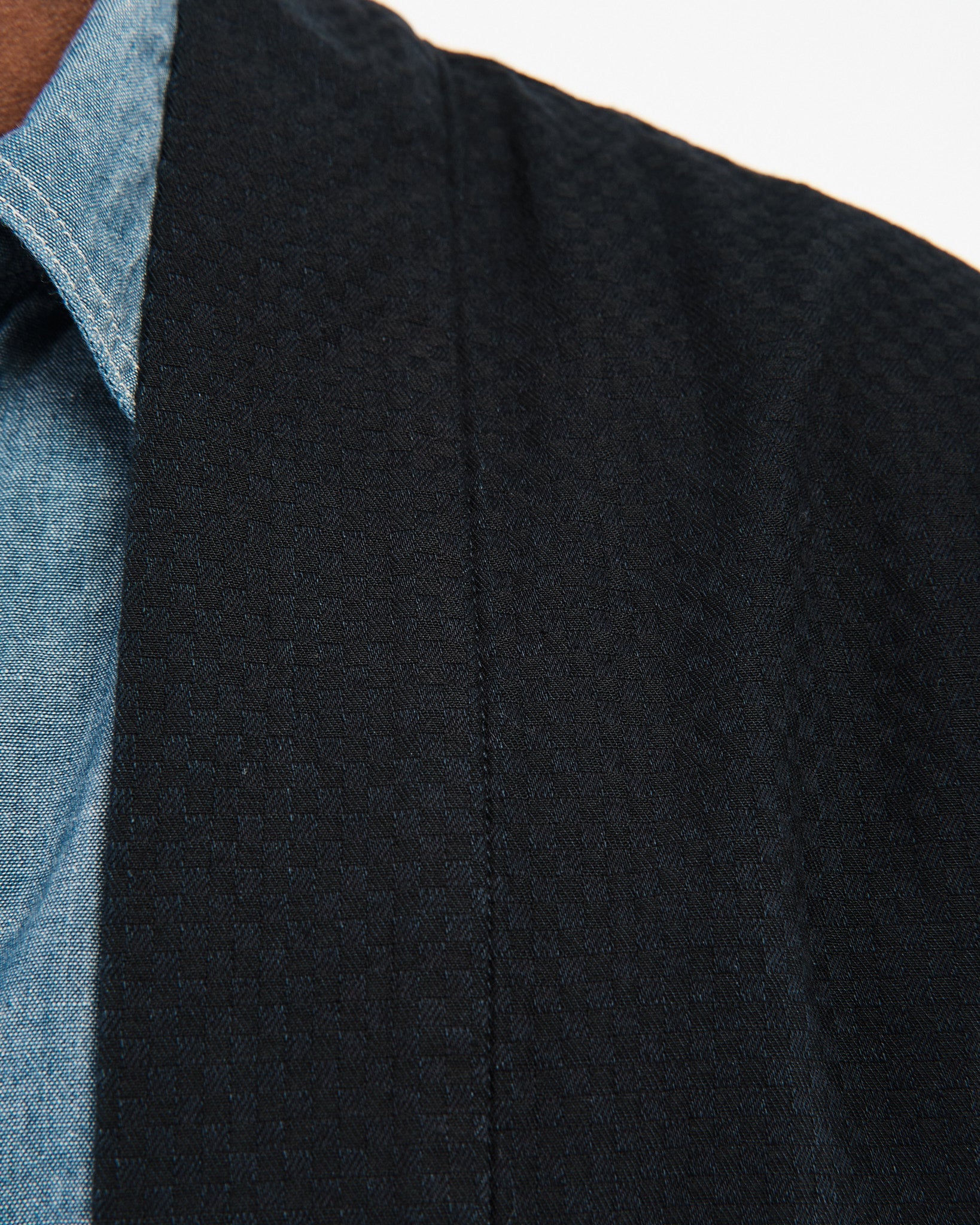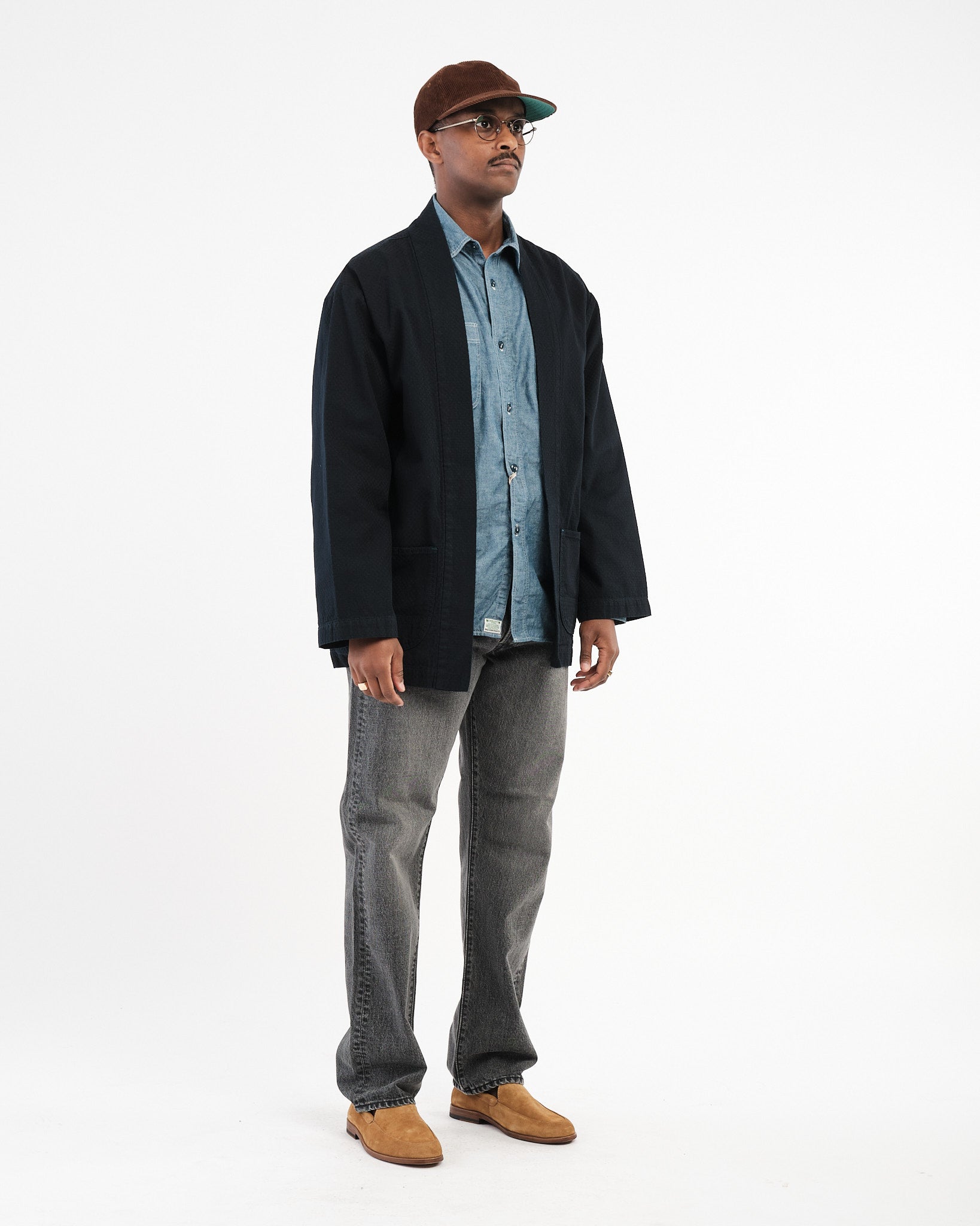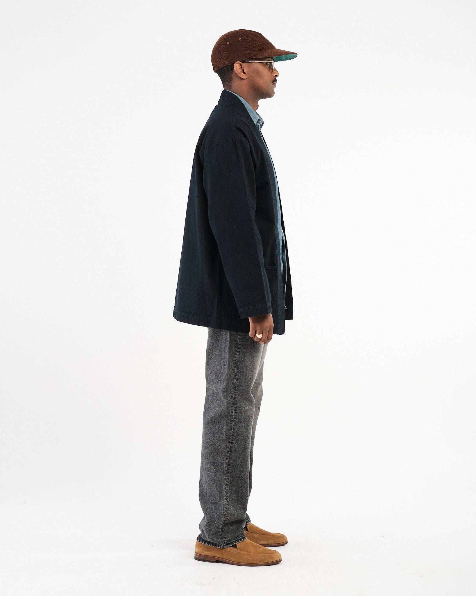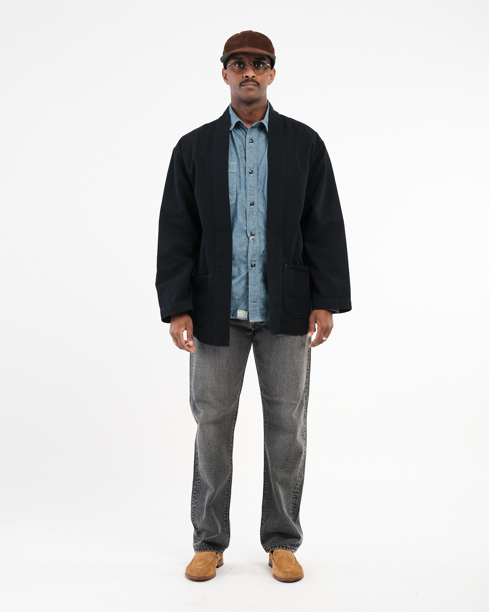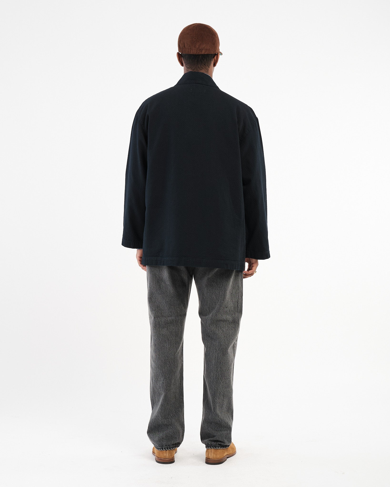 Abgeschlossen mit OMOTOS charakteristischem blau-grünem „MIMI“-Selvedge, einem speziell gebrandeten Schafsleder-Patch und traditioneller Happi-Stil-Konstruktion, überbrückt dieses Kleidungsstück Vergangenheit und Gegenwart und feiert das japanische Textilerbe in einer zeitgenössischen Form.