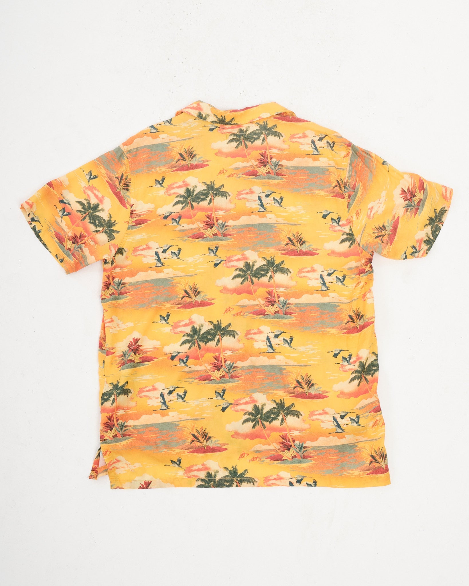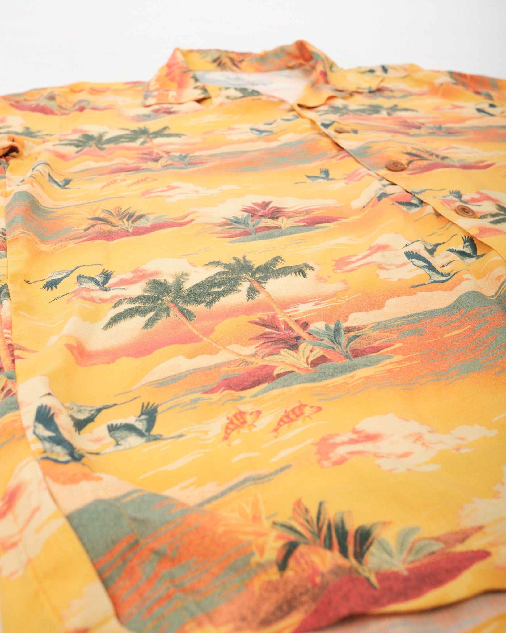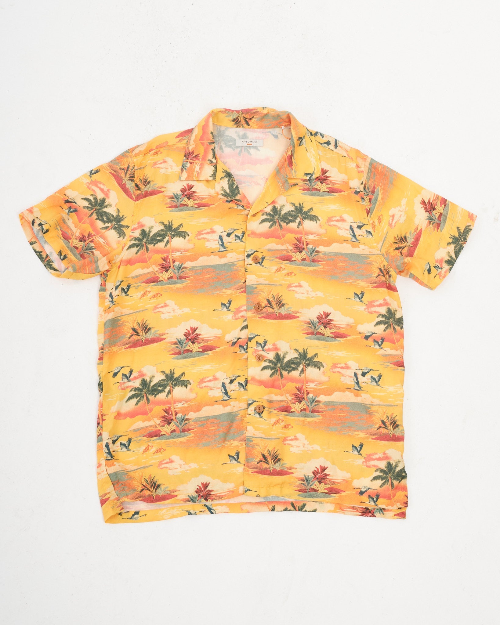 Ein fröhliches Sommer-Must-Have, das Arvid Hawaii Sunflower Shirt erstrahlt in einem lebendigen Allover-Druck von Palmen, exotischen Vögeln und fliegenden Fischen vor einem sonnigen Hintergrund. Gefertigt aus leichtem, fließendem TENCEL™ Lyocell, fühlt sich dieses Hemd weich und kühl an. Es verfügt über einen entspannten Camp-Kragen, geraden Saum mit Seitenschlitzen und Corozo-Knöpfe für ein langlebiges, vintage-inspiriertes Finish. Mit Fair-Trade- und Bio-Zertifizierungen spiegelt es das Engagement von Nudie Jeans für Nachhaltigkeit und ethische Produktion wider. Einfach im Badezimmer aufhängen, während man duscht, um es durch den Dampf zu entknittern – kein Bügeln nötig! Hergestellt in Indien mit Standards für einen existenzsichernden Lohn.