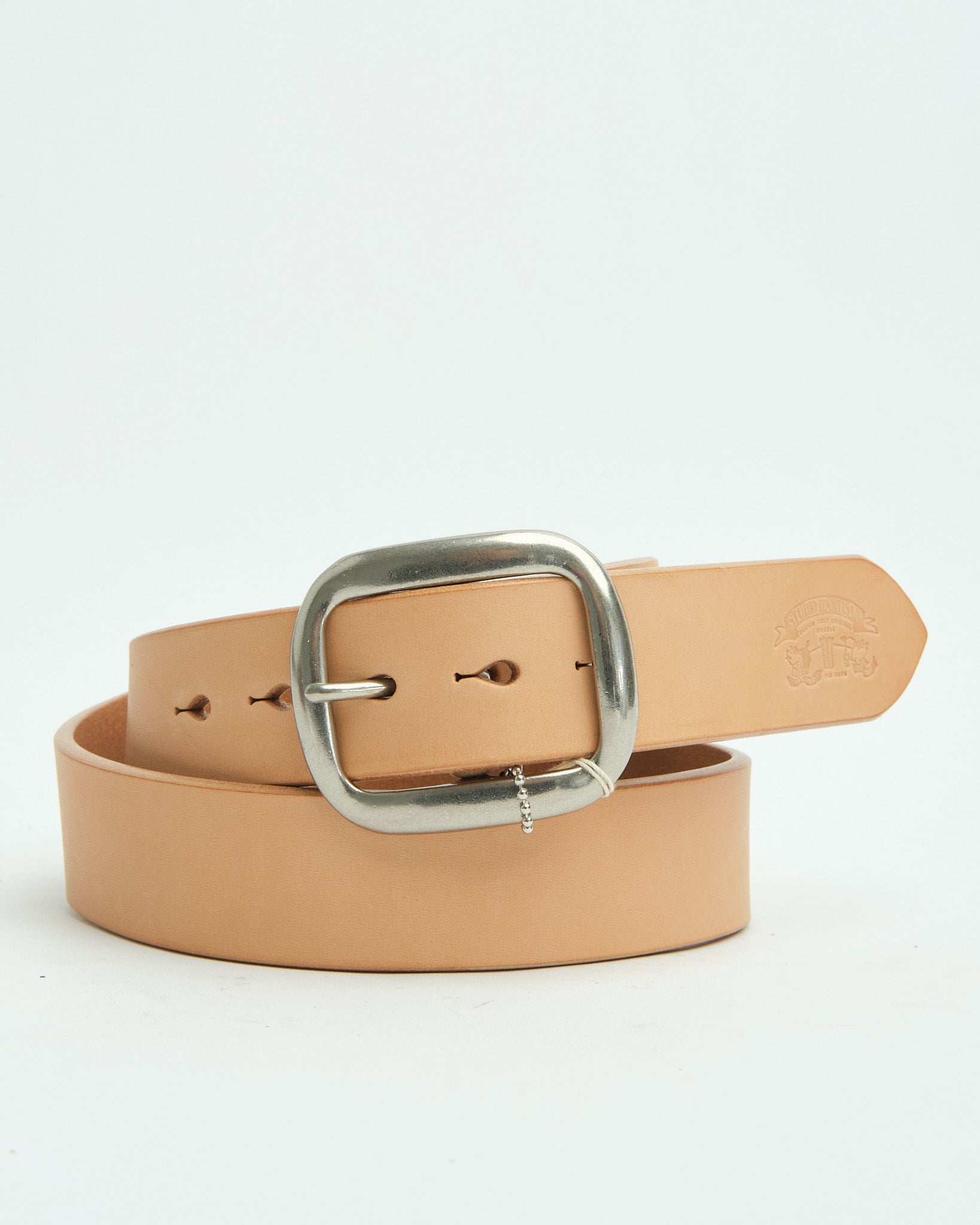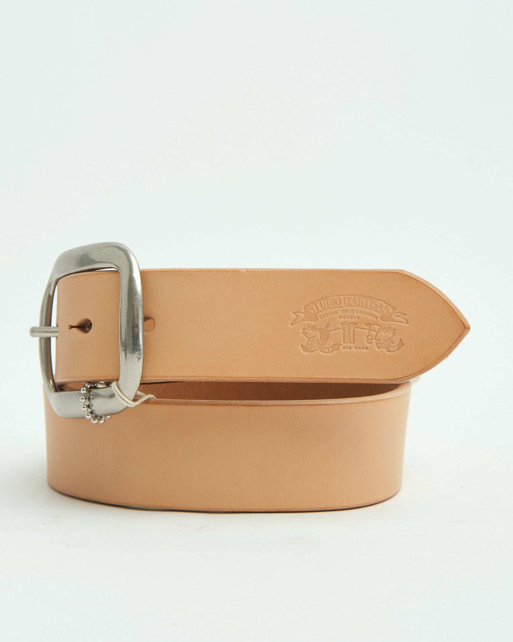 A vintage inspiration realized: the Studio D’Artisan B‑81 Leather Belt is crafted from thick, vegetable‑tanned cowhide leather about 4.5 mm in thickness, designed to stand the test of time. The strap spans roughly 1.5 inches (≈ 38 mm) in width—broad enough to be bold with denim, narrow enough to slide under tougher belt loops. Its five teardrop-shaped punch holes nod to workwear heritage, while a nickel‑plated oval buckle (often removable) adds both function and character. Polished, burnished edges smooth out its profile, and a subtle Studio D’Artisan logo debossed near the tail gives that heritage cred. Built in Japan, this belt is as rugged as it is refined—wear it for decades, let it age with you.