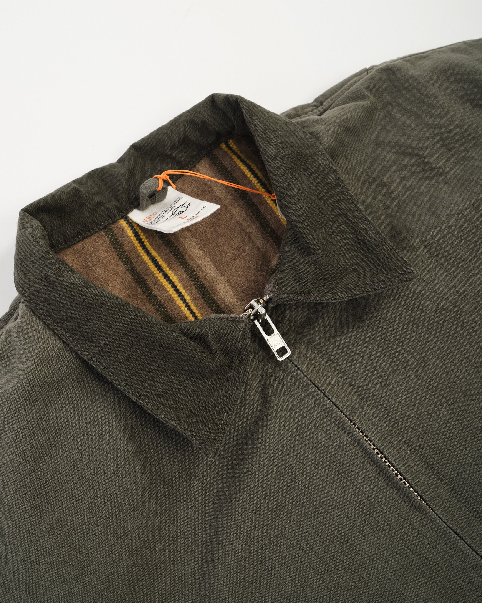 Der Körper ist mit einer Wollmischdecke gefüttert für Wärme, während die Ärmel mit einer Mischung aus Baumwolle und recyceltem Polyamid gefüttert sind, was die Bewegungsfreiheit sicherstellt. Ein kontrastierender tiefgrüner Duck Canvas Kragen erhöht seinen Vintage-Arbeitskleidungscharme. Zusätzliche Details umfassen tonale Nähte, gebogene Leistentaschennähte und einen stabilen Reißverschluss, was es zu einer vielseitigen Jacke macht, die ererbtes Handwerk mit praktischer Funktionalität verbindet.