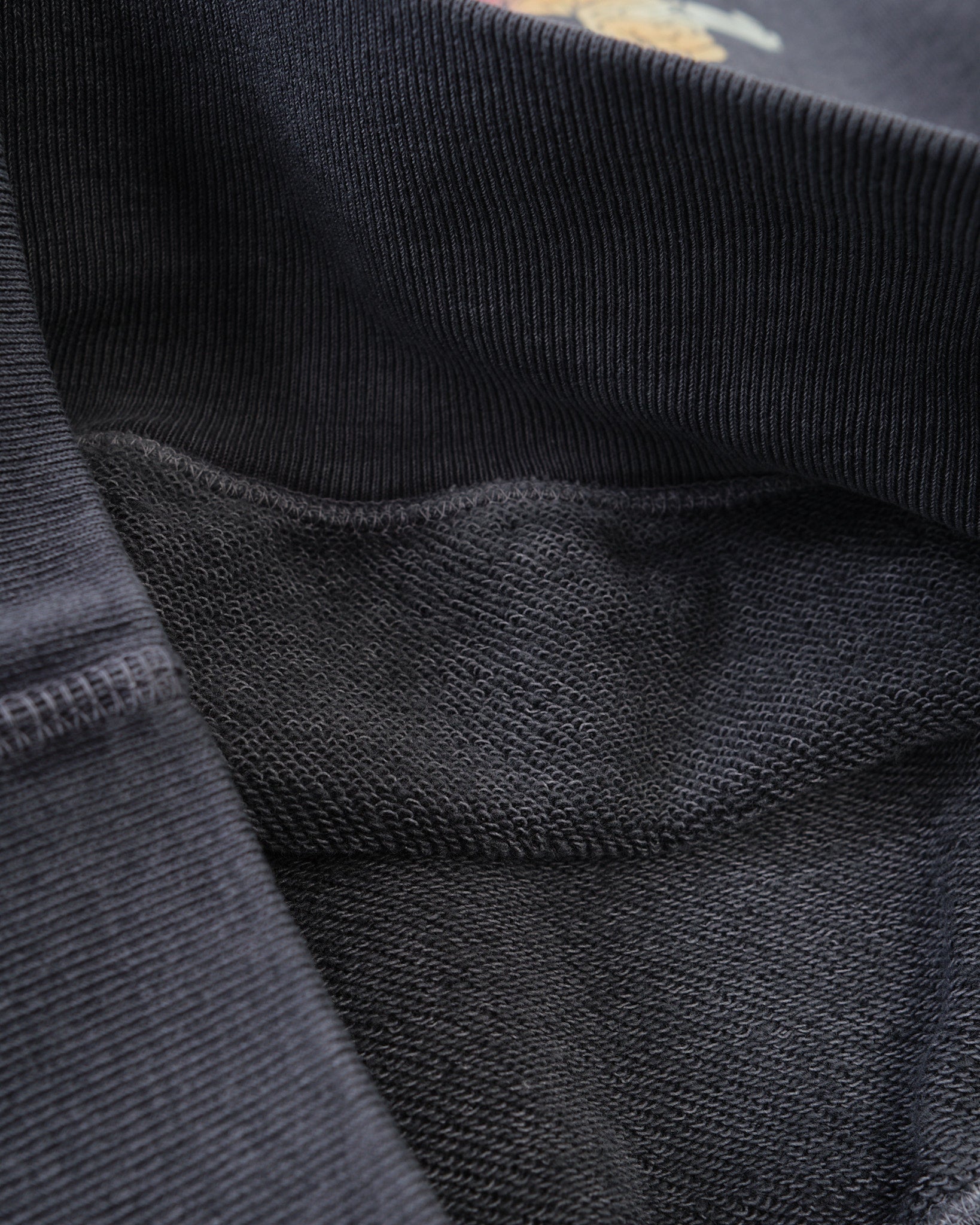 Its slim silhouette is a nod to athletic crewnecks of decades past, reimagined with modern finesse. The standout feature is the flocked print across the front, adding soft, tactile texture and retro personality.