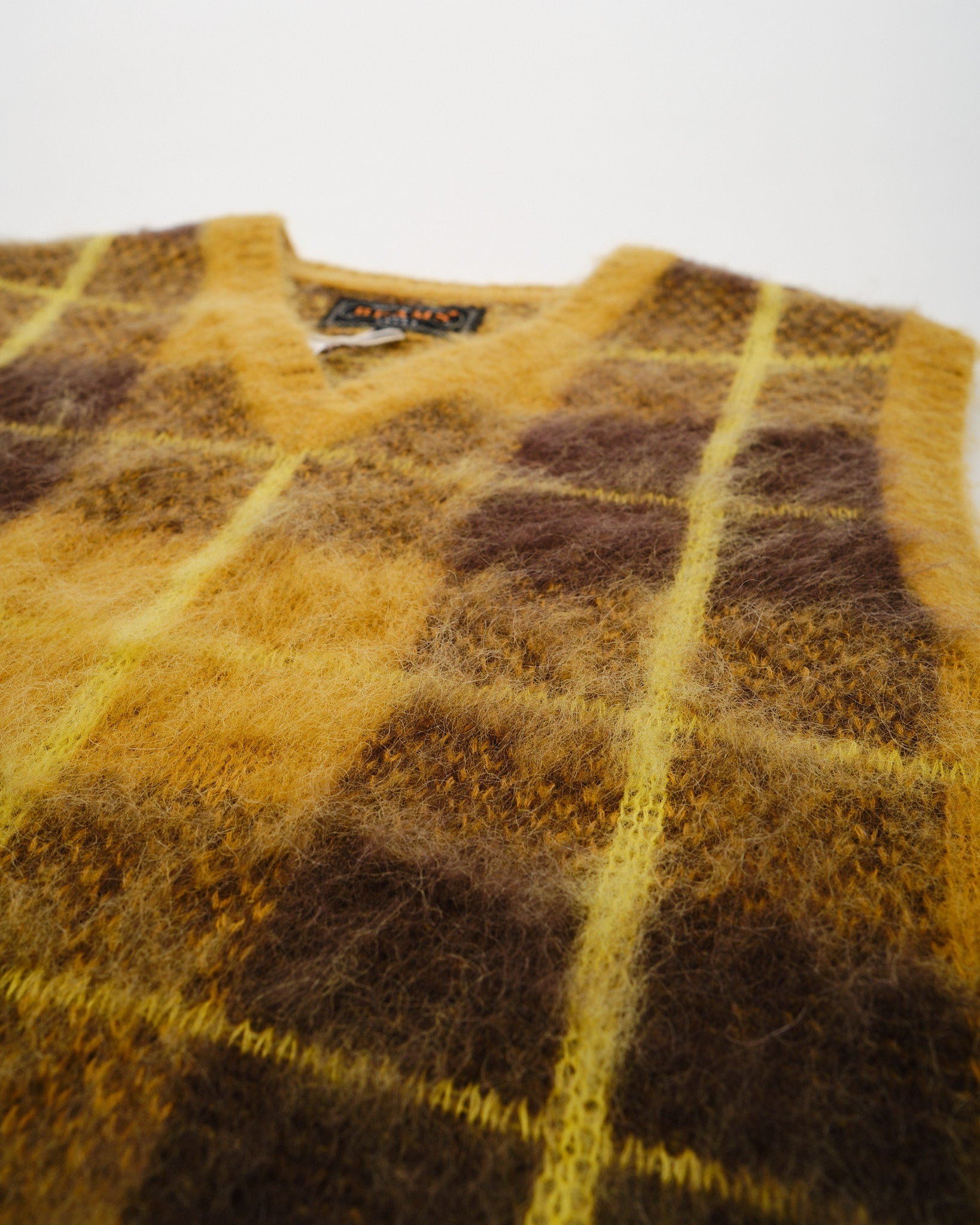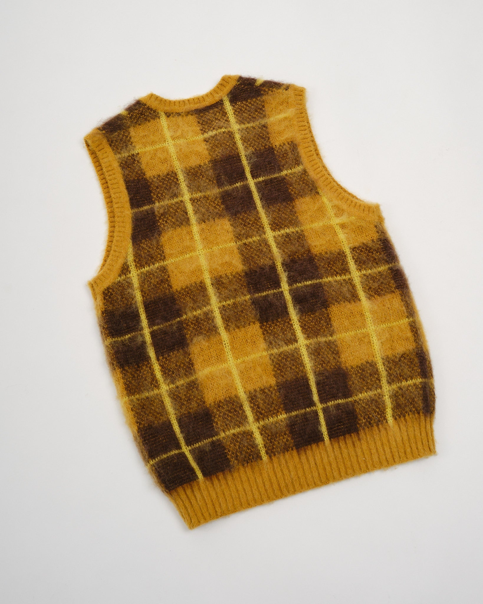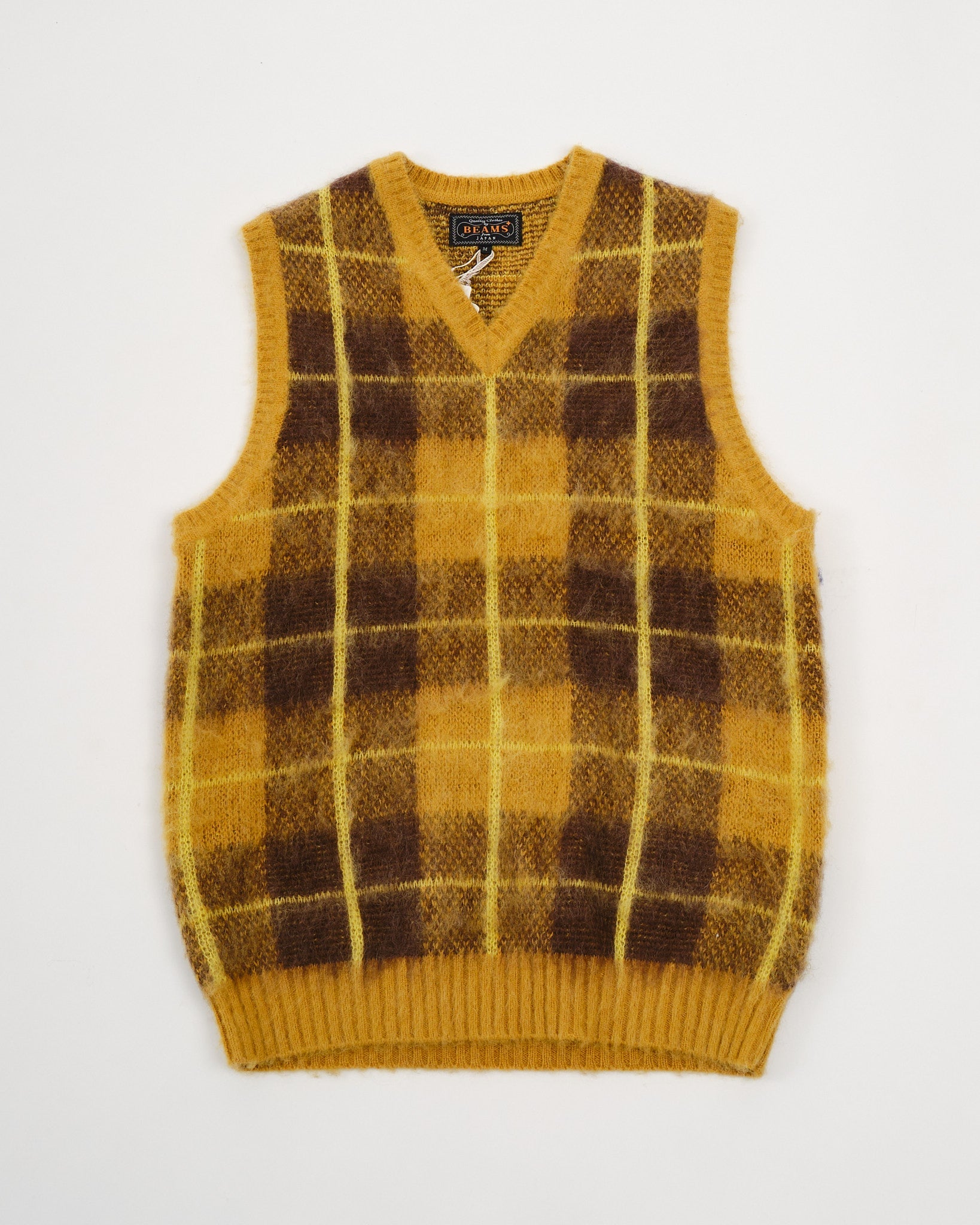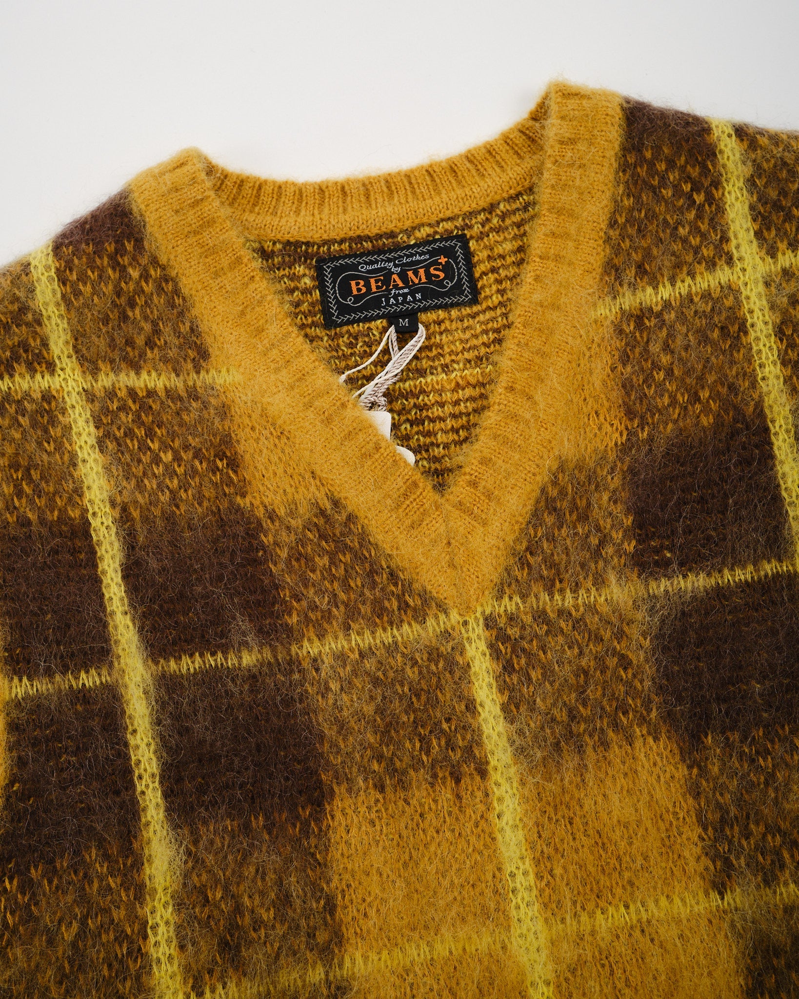 Erleben Sie das Retro-Feeling mit der Beams+ Check Vest Mohair in Senfgelb. Diese Strickweste ist inspiriert von den Strickwaren der 1960er Jahre und zeichnet sich durch ein breites Karodesign aus, das zeitlose Eleganz mit zeitgenössischem Stil perfekt verbindet. Die Mohairwollmischung sorgt für eine weiche und flauschige Textur, während der V-Ausschnitt und der gerippte Saum den Tragekomfort und die mühelose Tragbarkeit erhöhen. Es ist nicht Ihr Argyle-Muster, aber das karierte Design und die harmonische Farbmischung bieten eine ähnliche Anziehungskraft, was es perfekt macht, um zu schichten, ohne sich zu warm zu fühlen.
