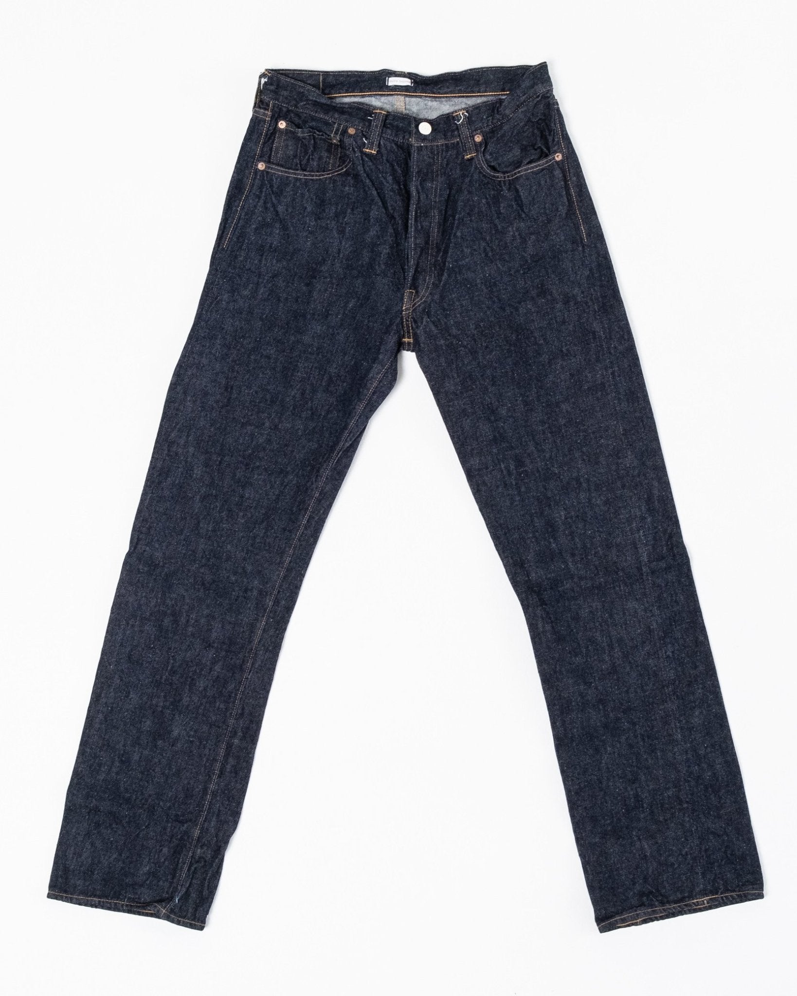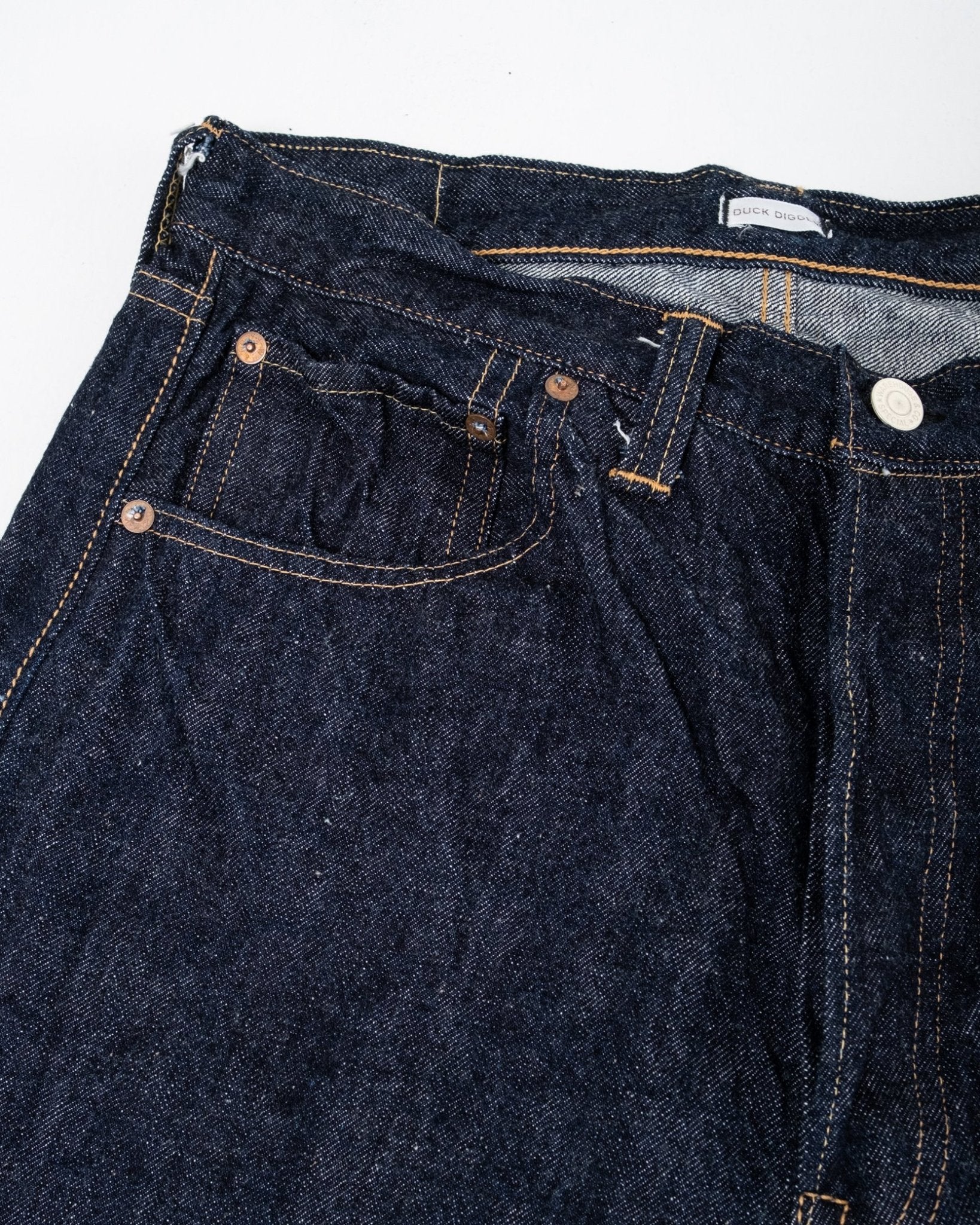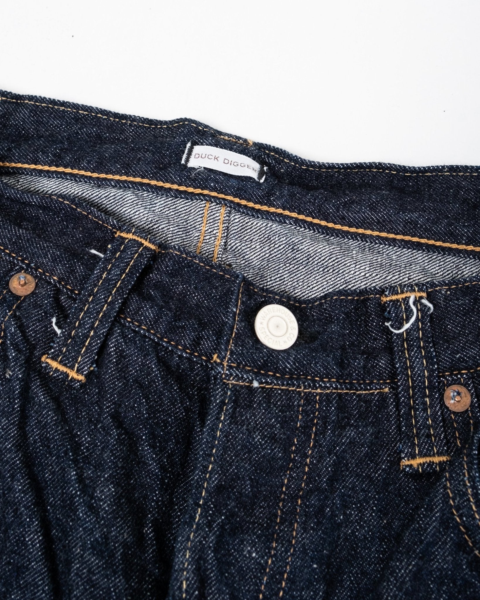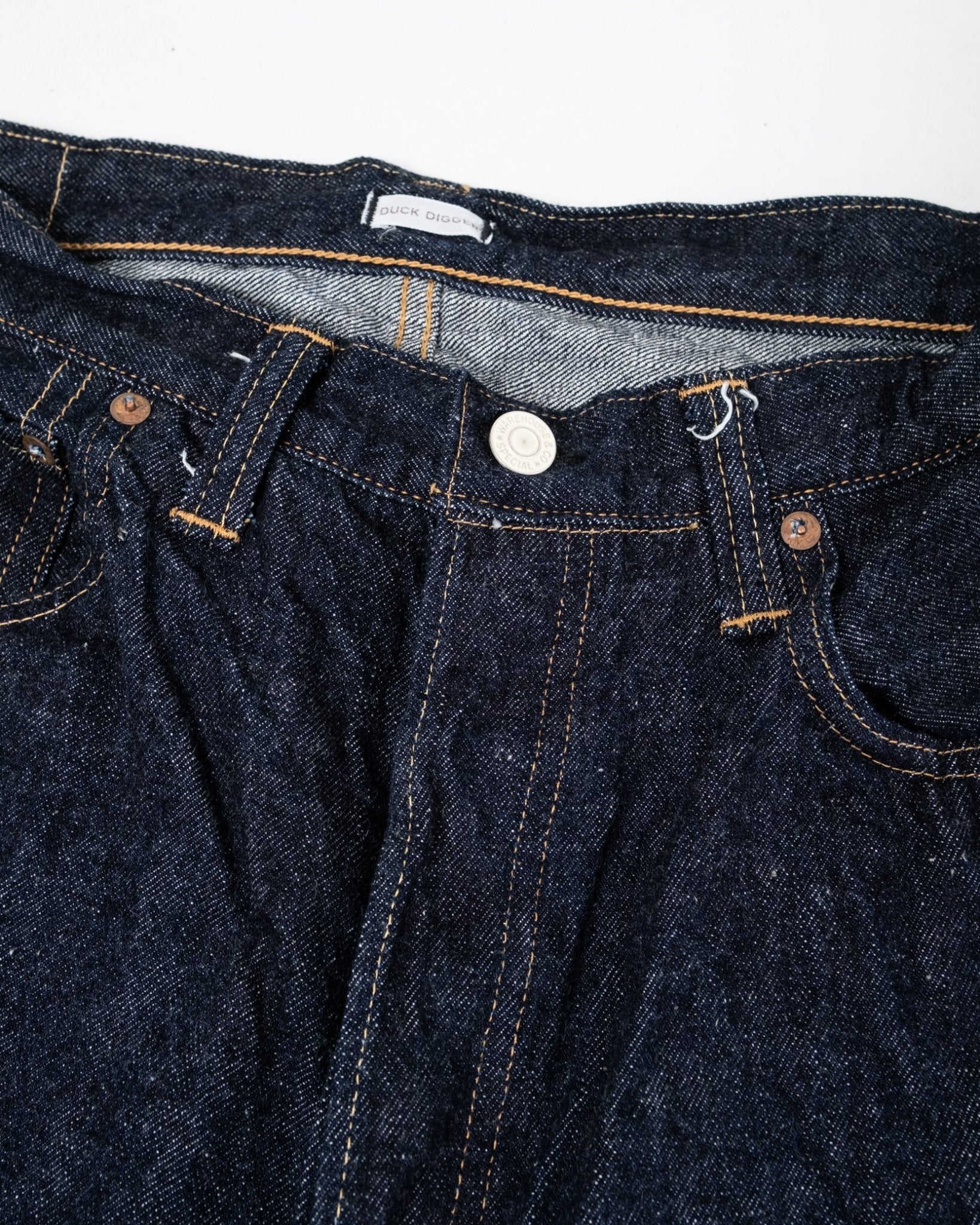Duck Digger 1001XX One Wash von Warehouse & Co. Diese Jeans ist ein 1947er Schnitt, mit einer tiefen Leibhöhe und einer sanften Verjüngung. Warehouse fertigt diese in ihrem 13,5 oz Banner Denim. Diese gerade Passform basiert auf einem Modell aus den 1940er Jahren in einer Baumwollmischung aus Arizona, Tennessee und Texas, und rekreiert die natürliche ungleichmäßige Garncharakteristik der Zeit. Unsanforisiertes Denim, das einmal gewaschen wurde für einen schönen Vintage-Look, und dazu erspart es Ihnen alle Mühe des Einlaufens. Hergestellt in Japan.