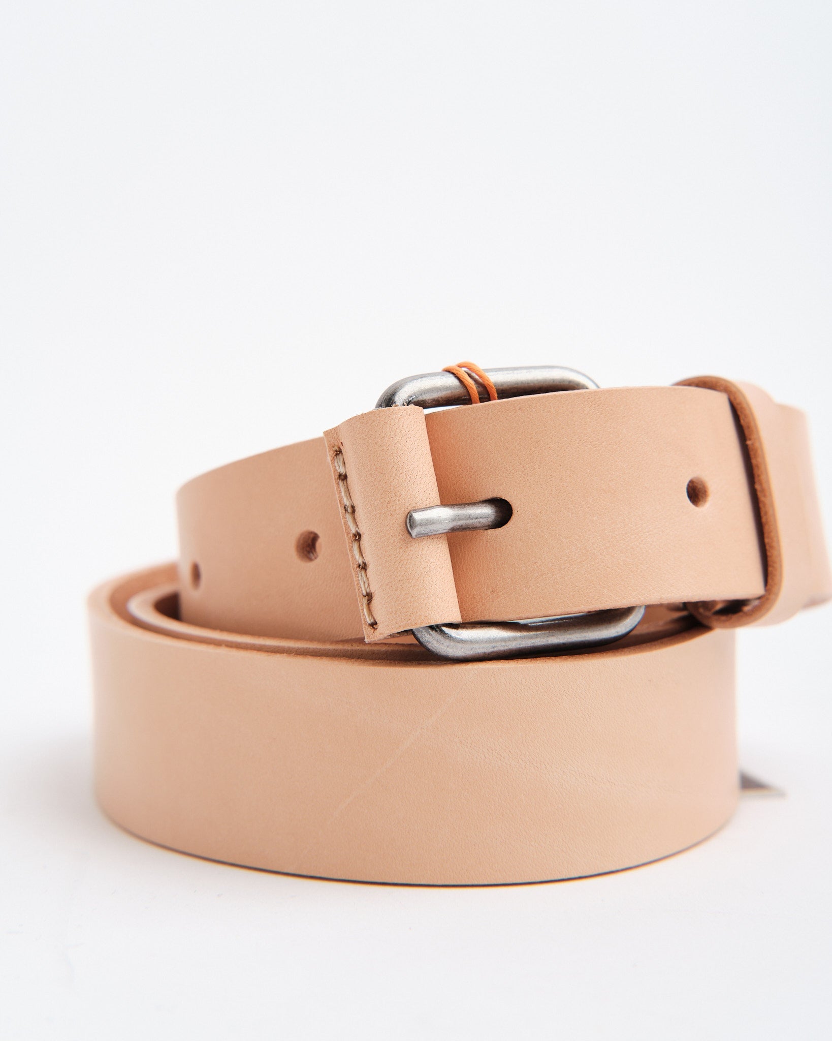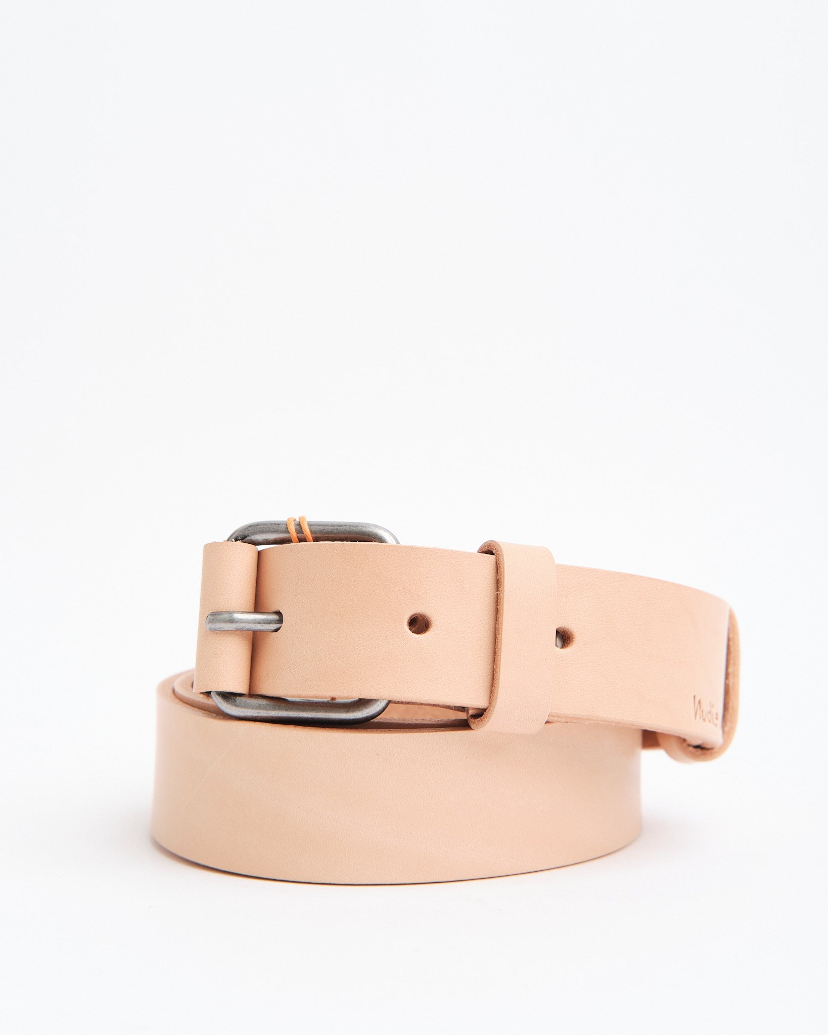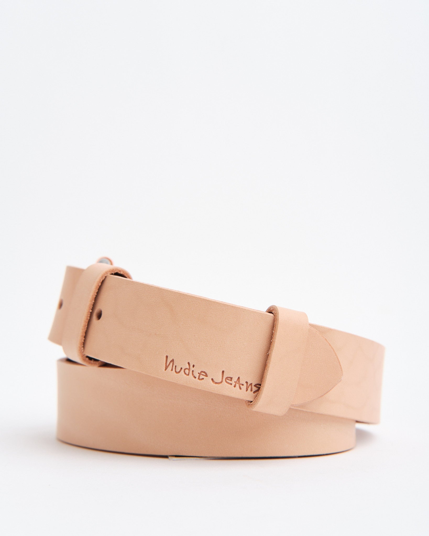Dwayne Ledergürtel Natur von Nudie Jeans Co. Aus pflanzlich gegerbtem Vollnarbenleder geschnitten, das wunderschön altert. Zwei Schlaufen, Metallschnalle und geprägtes Nudie Jeans Logo. 100% Leder und 28 mm Breite. Größen sind in cm. Hergestellt in Polen.