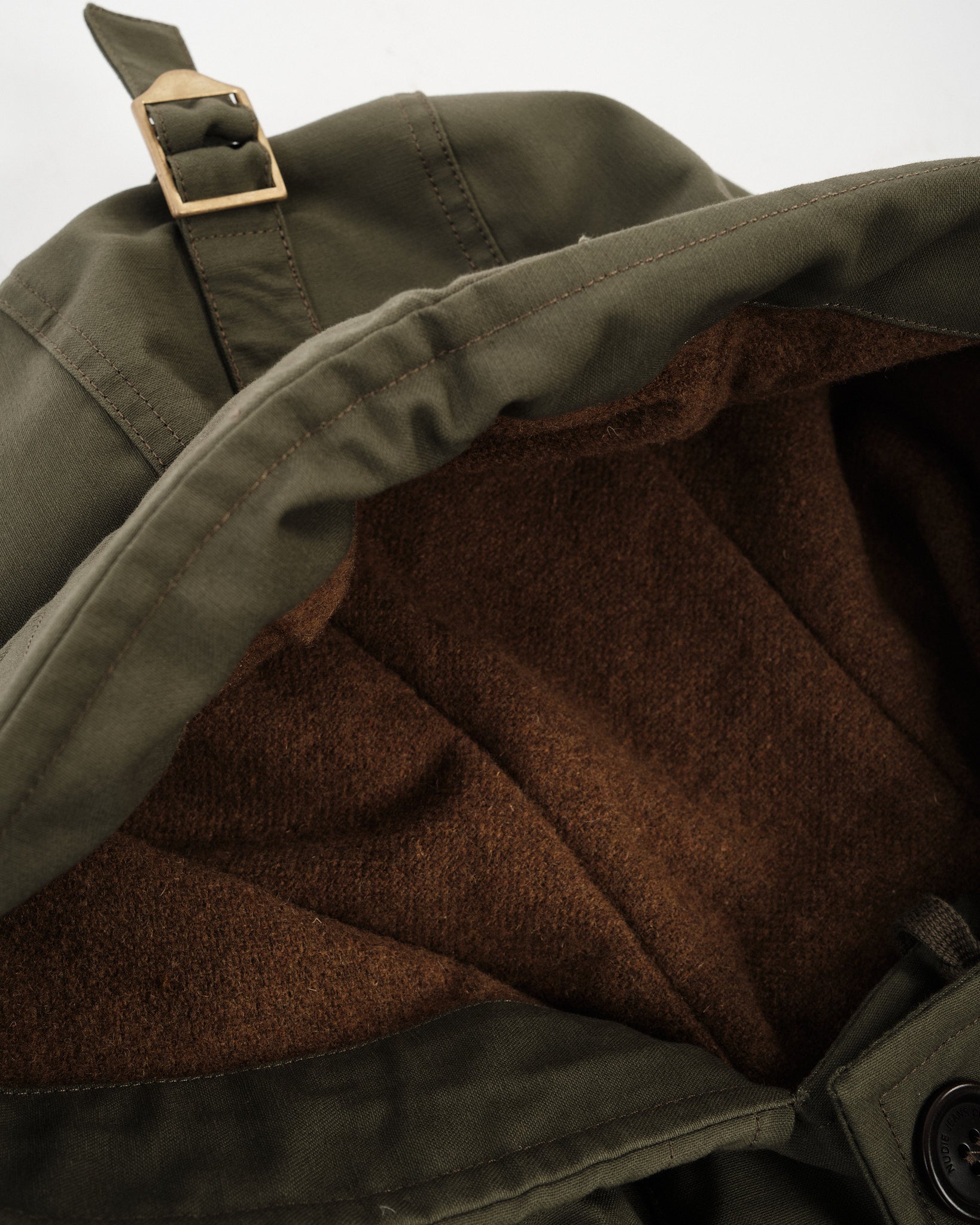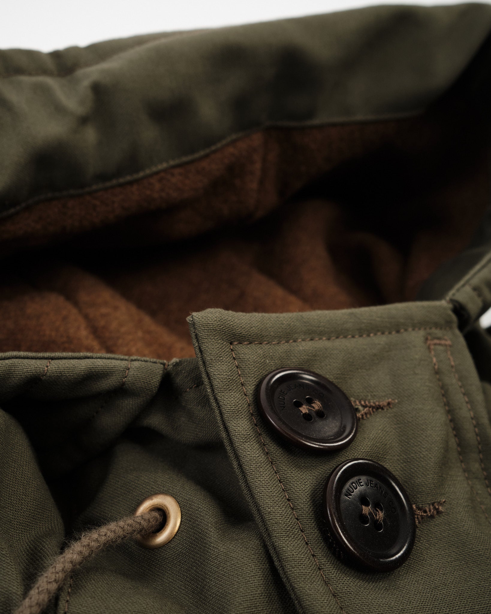 Innen finden Sie ein Futter aus recycelten Fasern, das genau die richtige Menge an Wärme bietet. Außen dreht sich alles ums Detail: natürliche Corozo-Knöpfe, Beschläge mit Gold-Finish und eine saubere Silhouette, die Nützlichkeit und Einfachheit in Einklang bringt. Hergestellt in Portugal mit Nudies charakteristischem Blick für Nachhaltigkeit, ist dies ein Parka, der leise, aber selbstbewusst seine Botschaft vertritt.