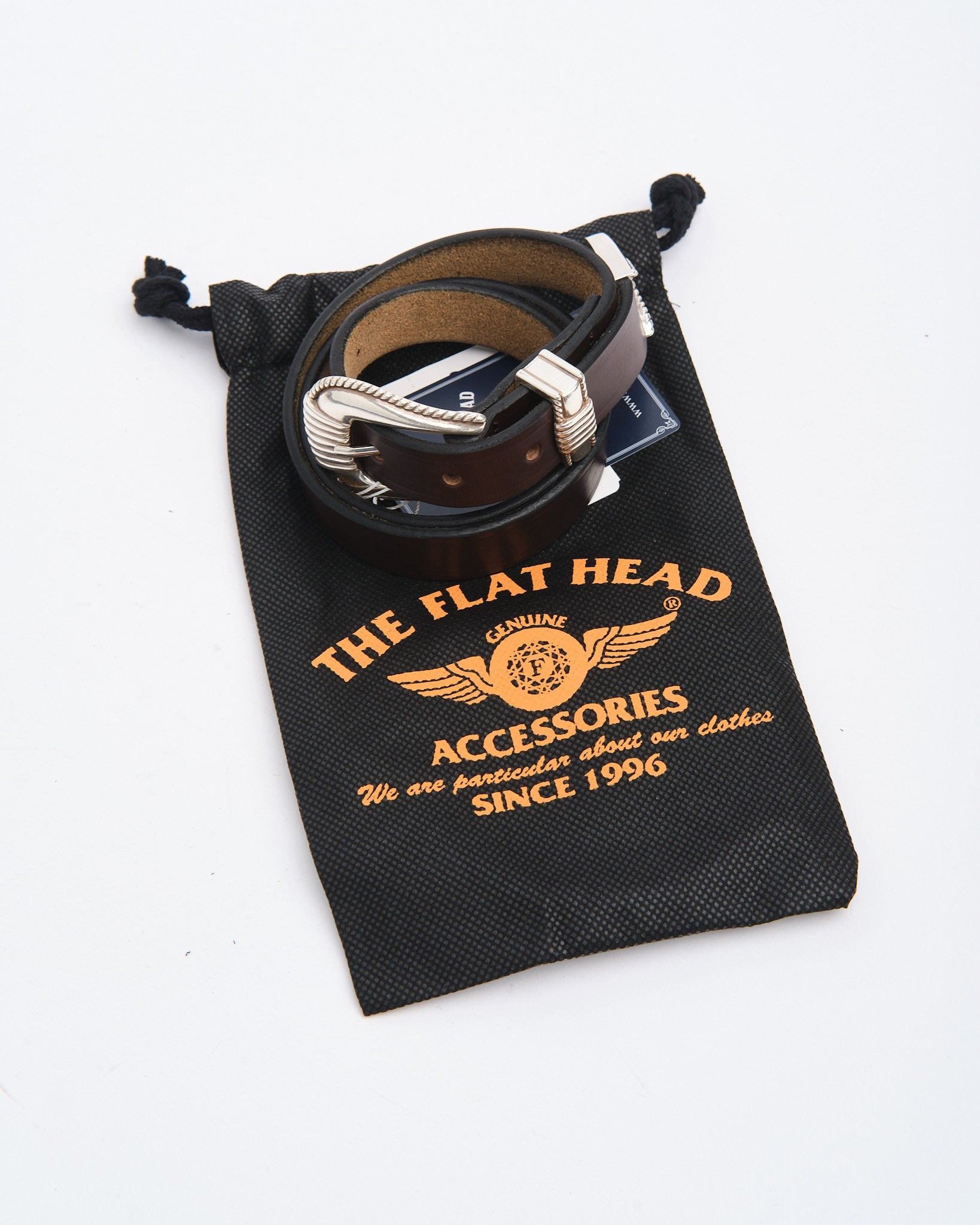 Hergestellt in Japan, zeigt dieser Gürtel Flat Heads Meisterschaft in der Lederarbeit, und liefert zeitlose Western-Ästhetik kombiniert mit erstklassiger Handwerkskunst.