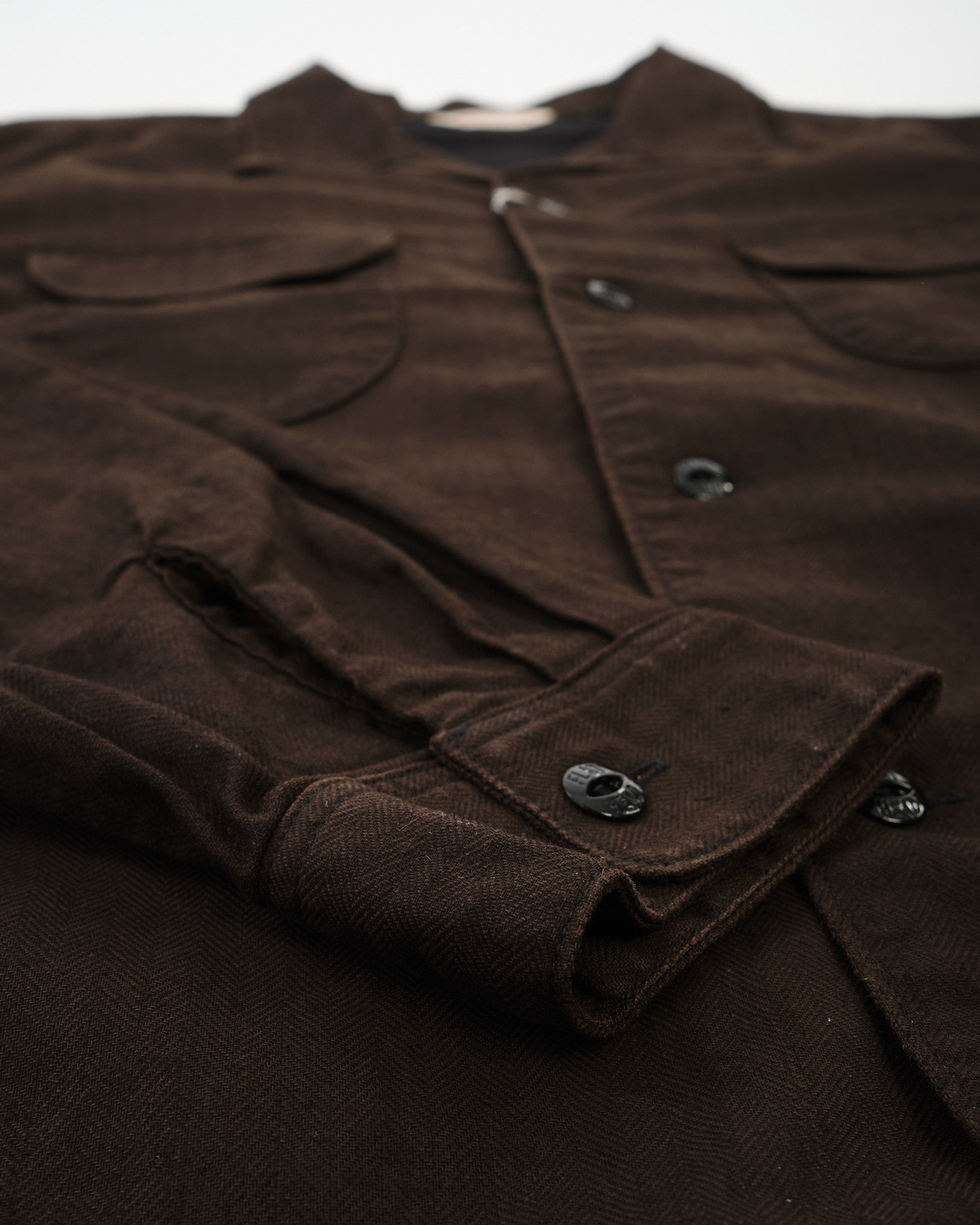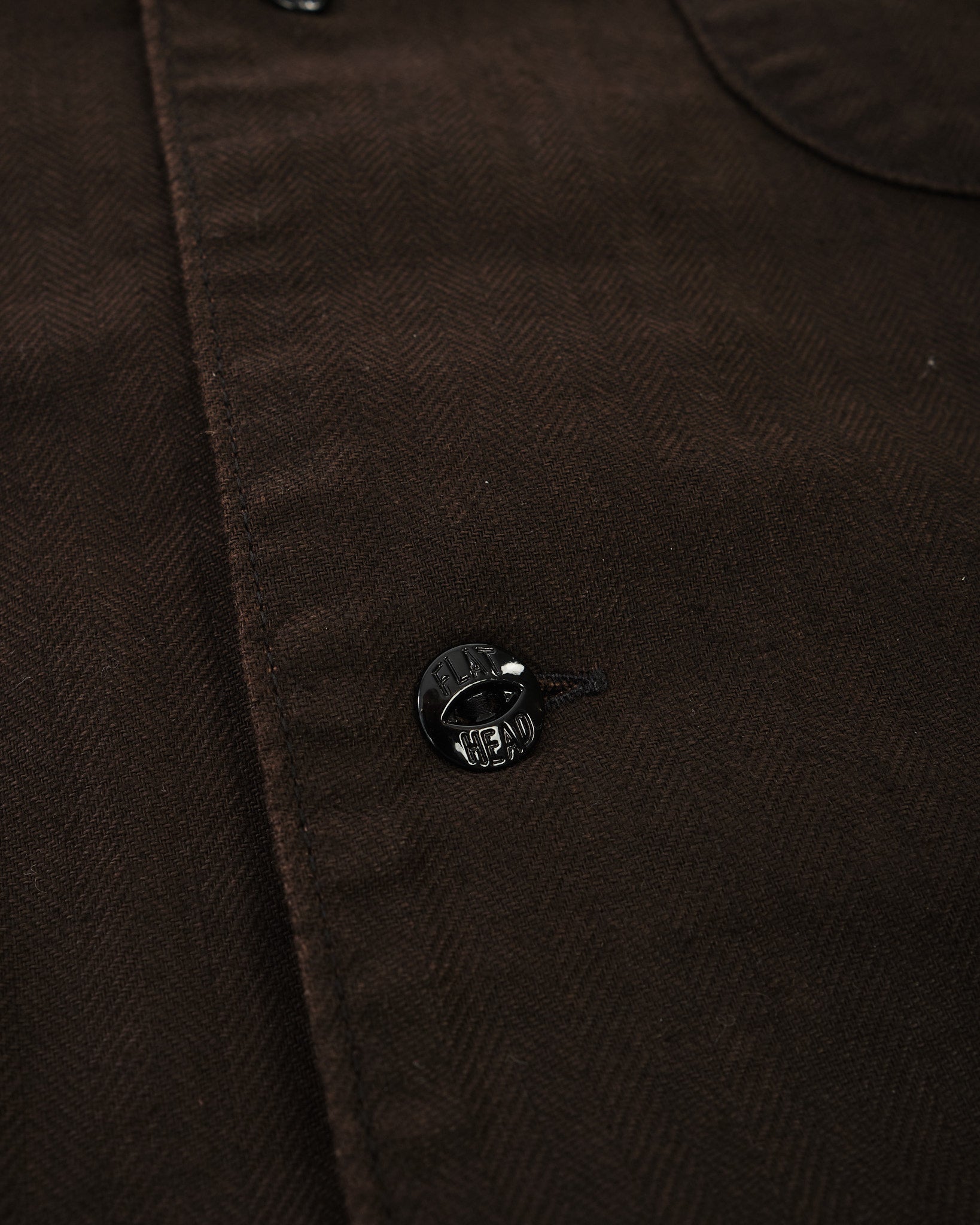 The cloth features a subtle herringbone structure that adds visual depth to the rich brown “Bengala” tone. Over time, the fabric develops a softer hand and a more personal character, reflecting The Flat Head’s focus on garments that evolve naturally through wear.