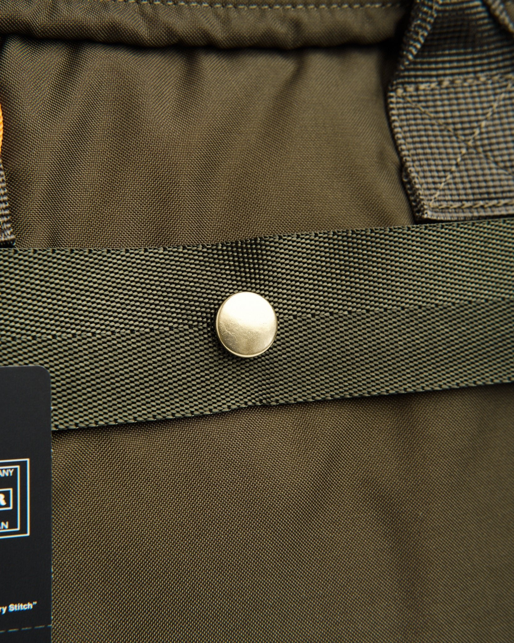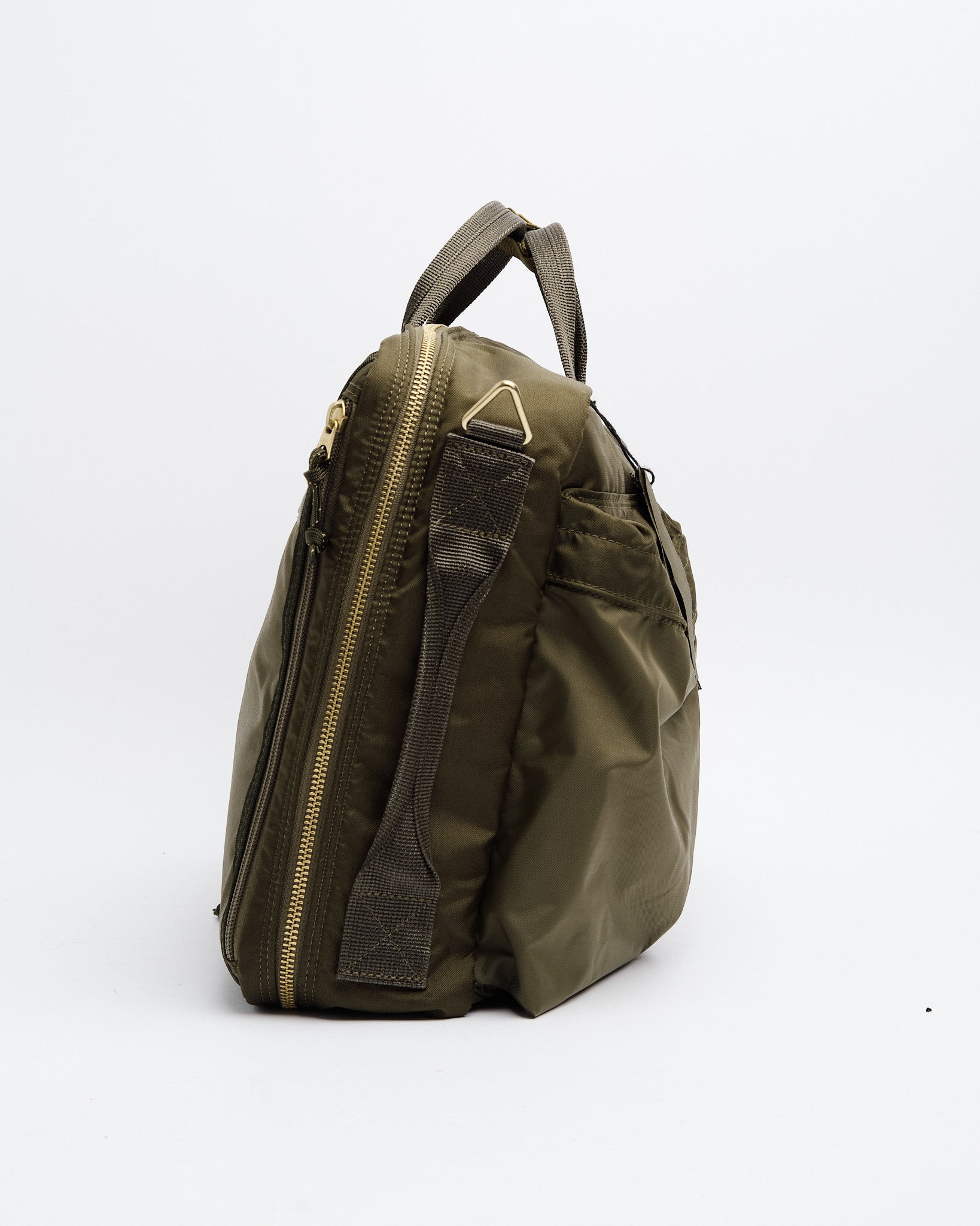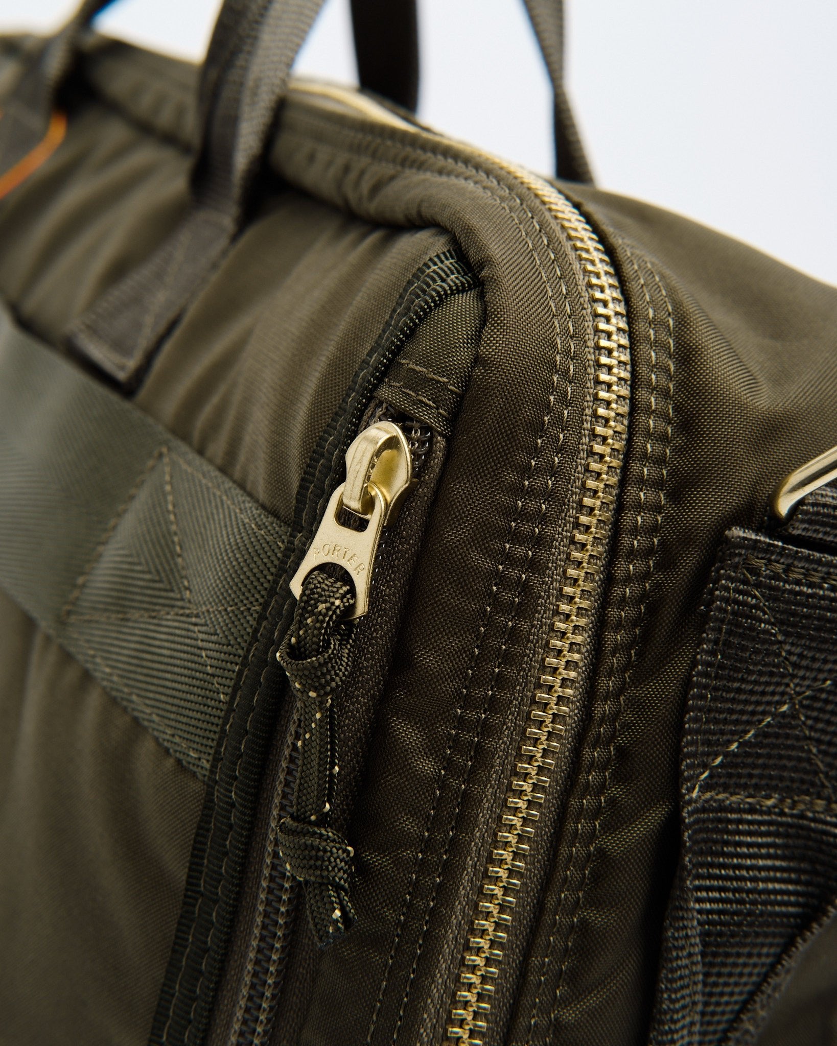 Die PORTER BY YOSHIDA Force 3-Way Aktentasche ist Teil der PORTER FORCE-Serie, inspiriert von militärischen Ästhetiken und den zufälligen Farbunterschieden, die bei Militärgütern zu finden sind. Ein bemerkenswertes Merkmal dieses Designs ist die subtile Farbvariation zwischen dem Stoff der Vordertasche und dem Hauptkörper der Tasche, was den Anschein erweckt, verschiedene Stoffpartien zu verwenden. Diese Serie feiert die unregelmäßigen Farbschemata, die in militärischer Kleidung und Zubehör zu finden sind.