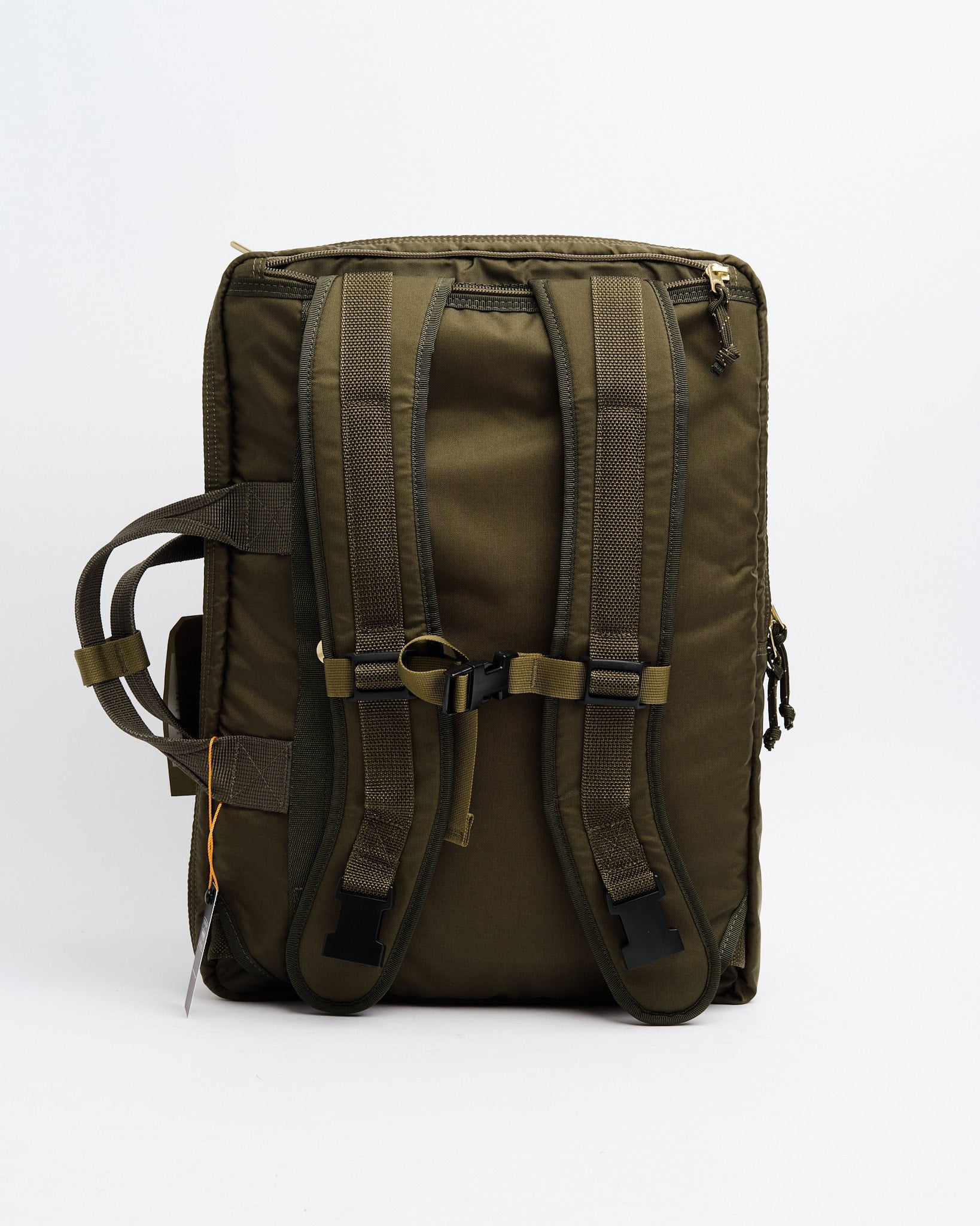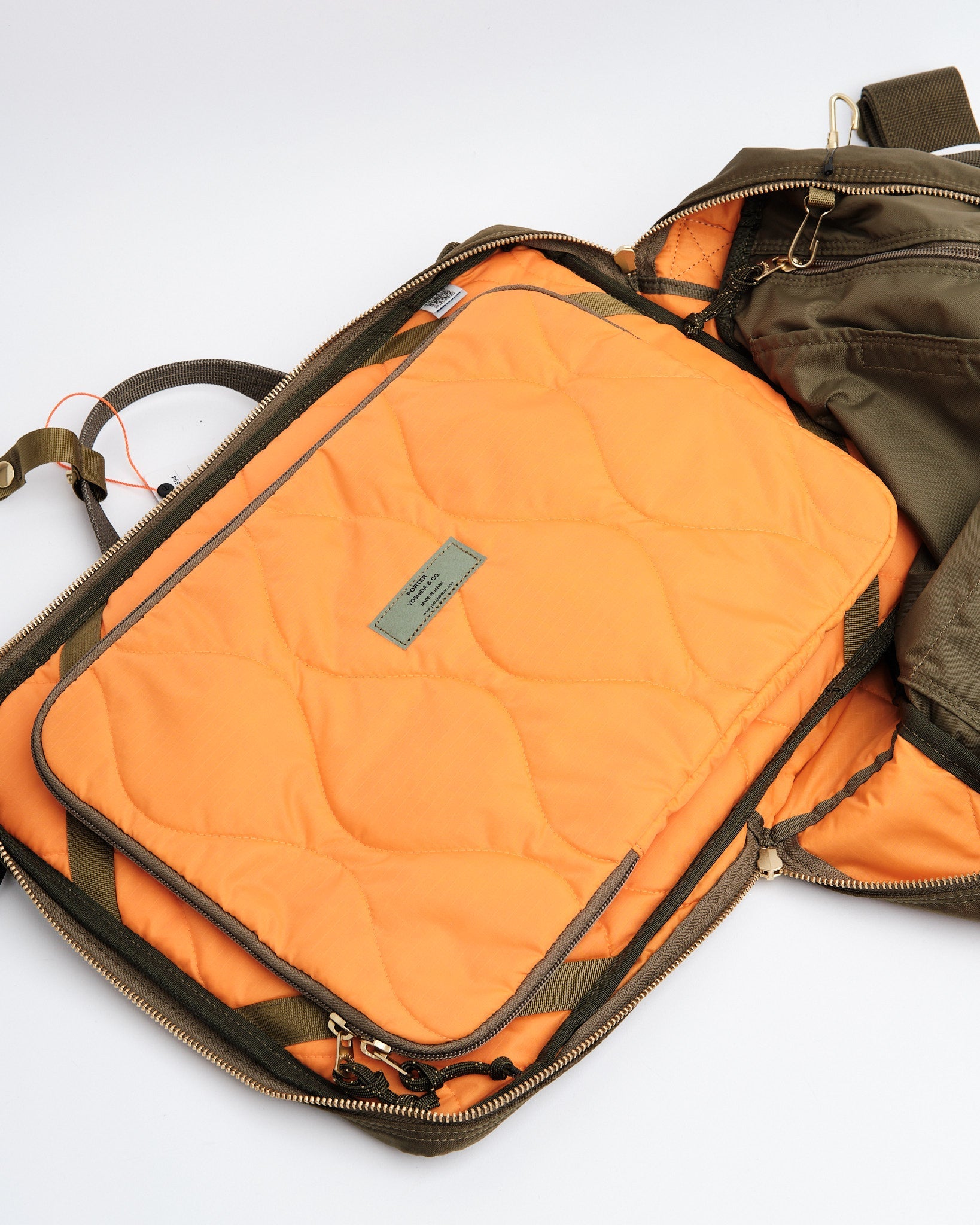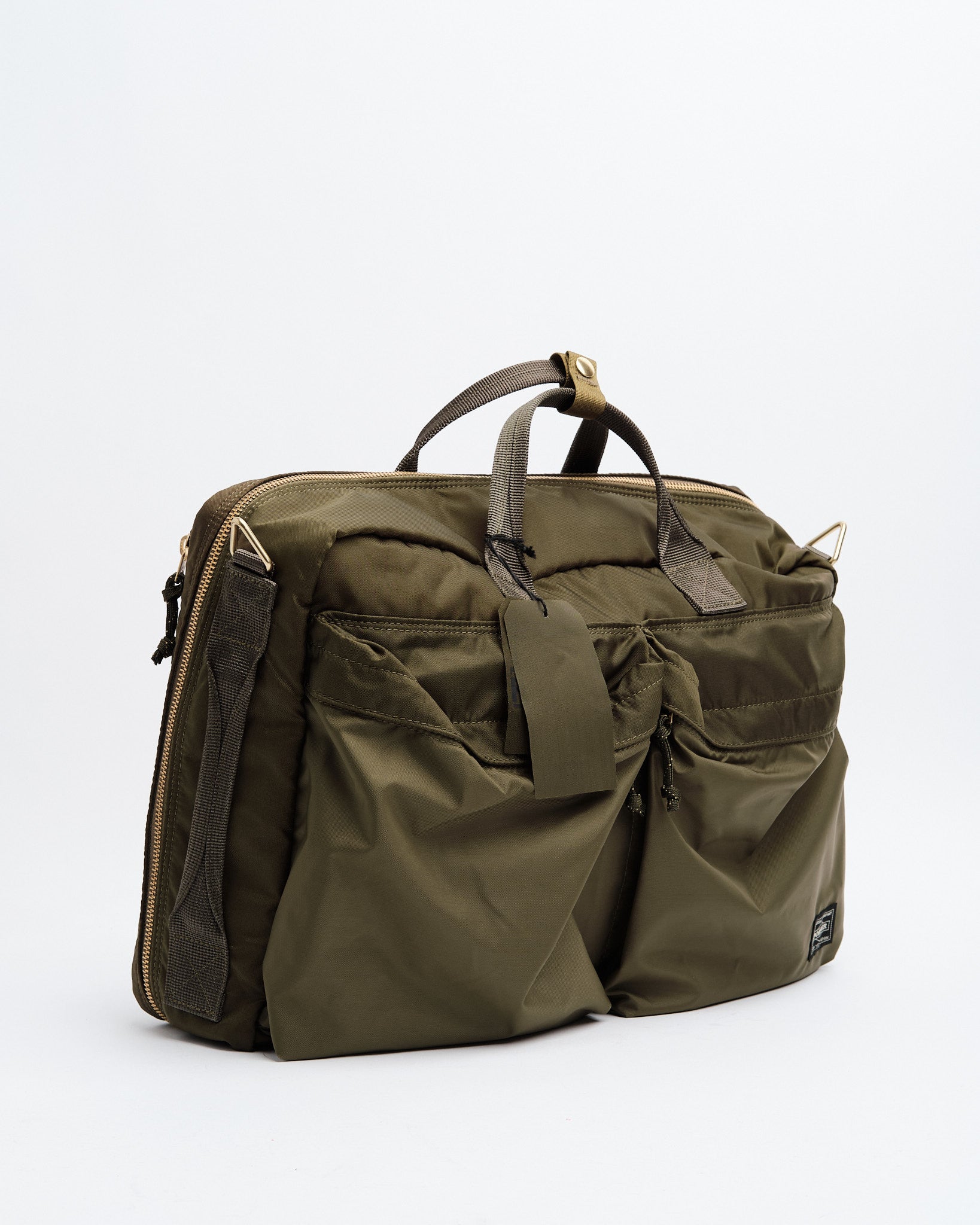 Die PORTER BY YOSHIDA Force 3-Way Aktentasche ist Teil der PORTER FORCE-Serie, inspiriert von militärischen Ästhetiken und den zufälligen Farbunterschieden, die bei Militärgütern zu finden sind. Ein bemerkenswertes Merkmal dieses Designs ist die subtile Farbvariation zwischen dem Stoff der Vordertasche und dem Hauptkörper der Tasche, was den Anschein erweckt, verschiedene Stoffpartien zu verwenden. Diese Serie feiert die unregelmäßigen Farbschemata, die in militärischer Kleidung und Zubehör zu finden sind.