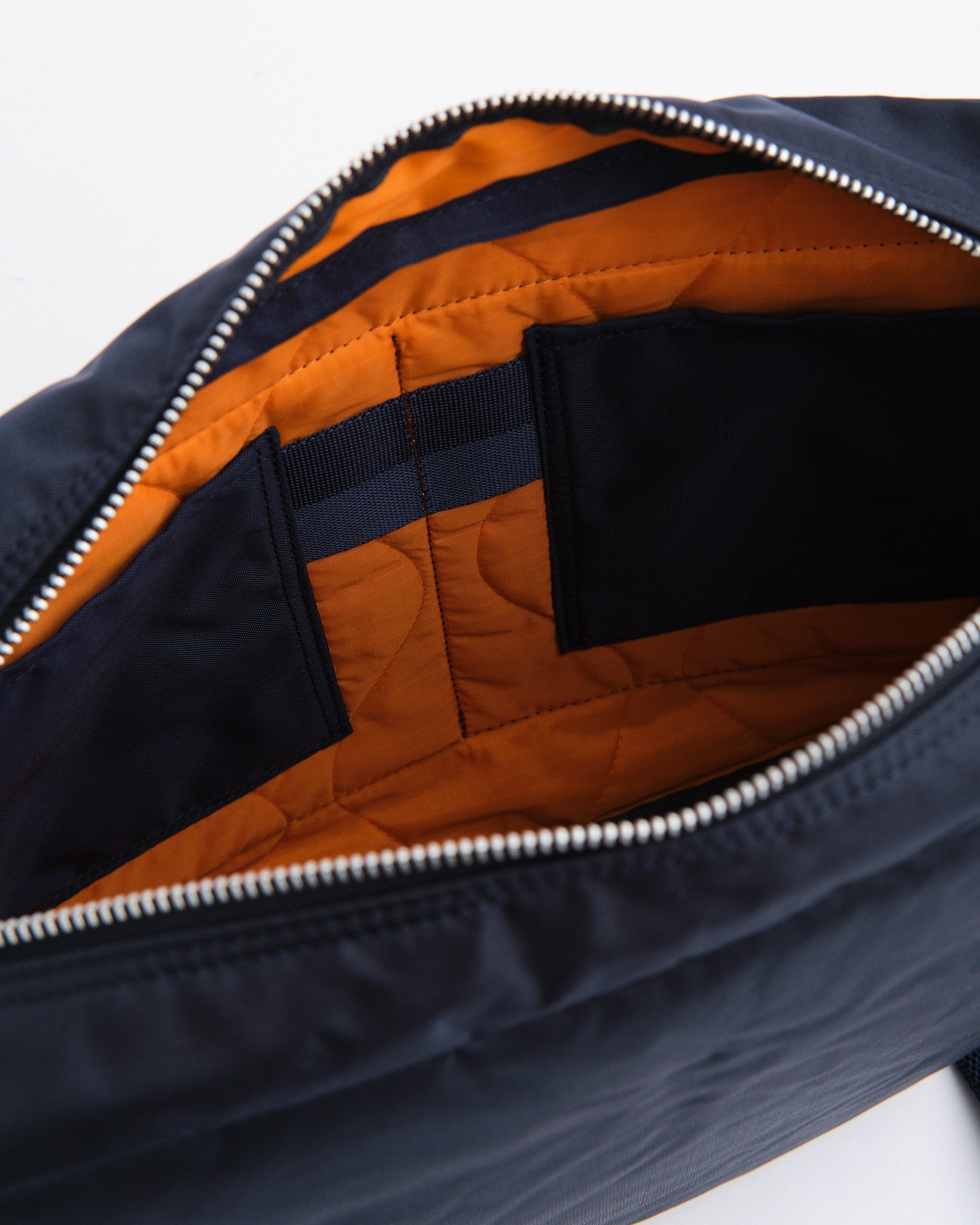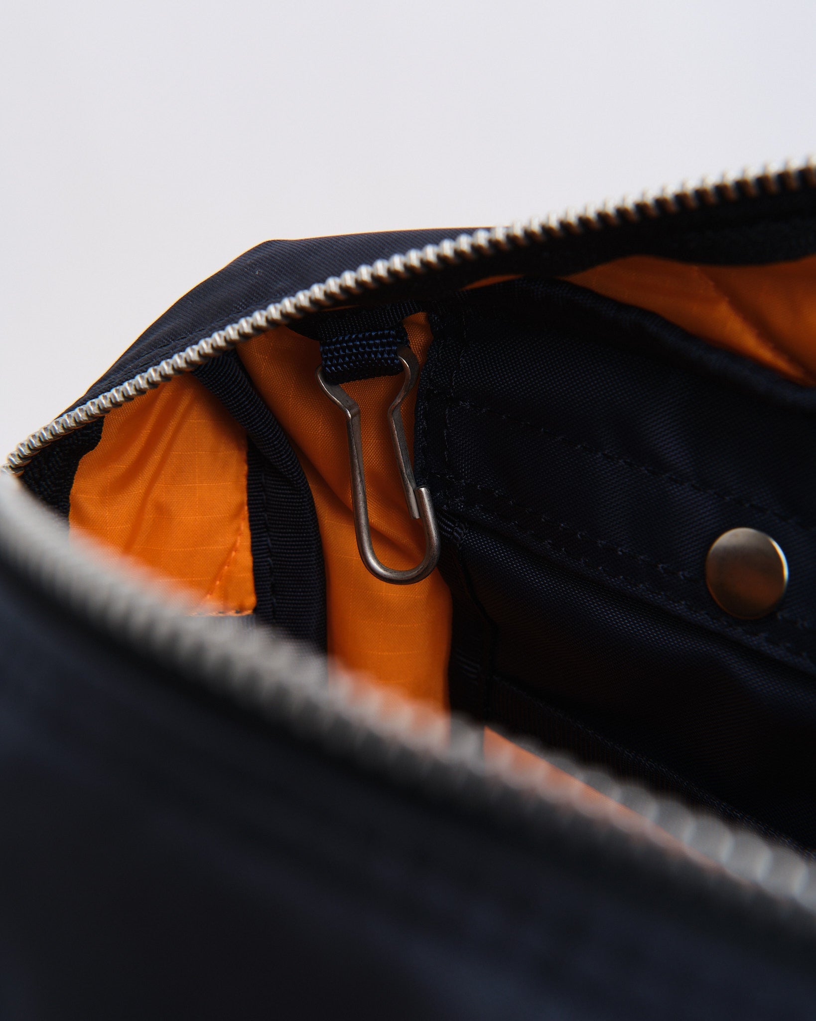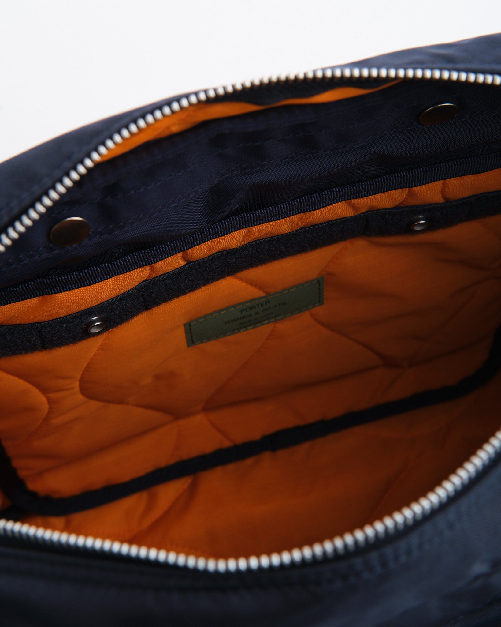 Das Außenmaterial besteht aus industrietauglichem Stoff, der mit 210 Denier 6 Nylon Starkfaden gewebt ist, ursprünglich verwendet für Schlauchboote, was es außergewöhnlich langlebig macht. Das Innere verfügt über ein Notfallfarben-Orangefutter, inspiriert von den Futterstoffen militärischer Jacken, und ist mit Ripstop-Nylon gesteppt für zusätzliche Widerstandsfähigkeit.