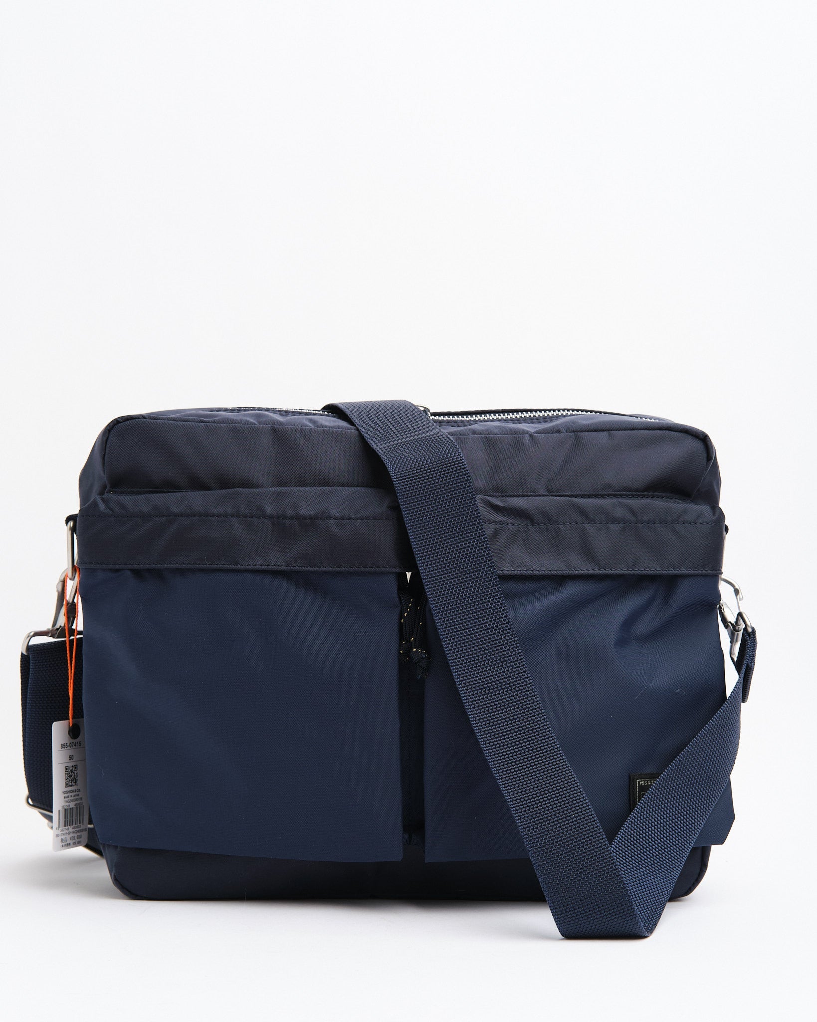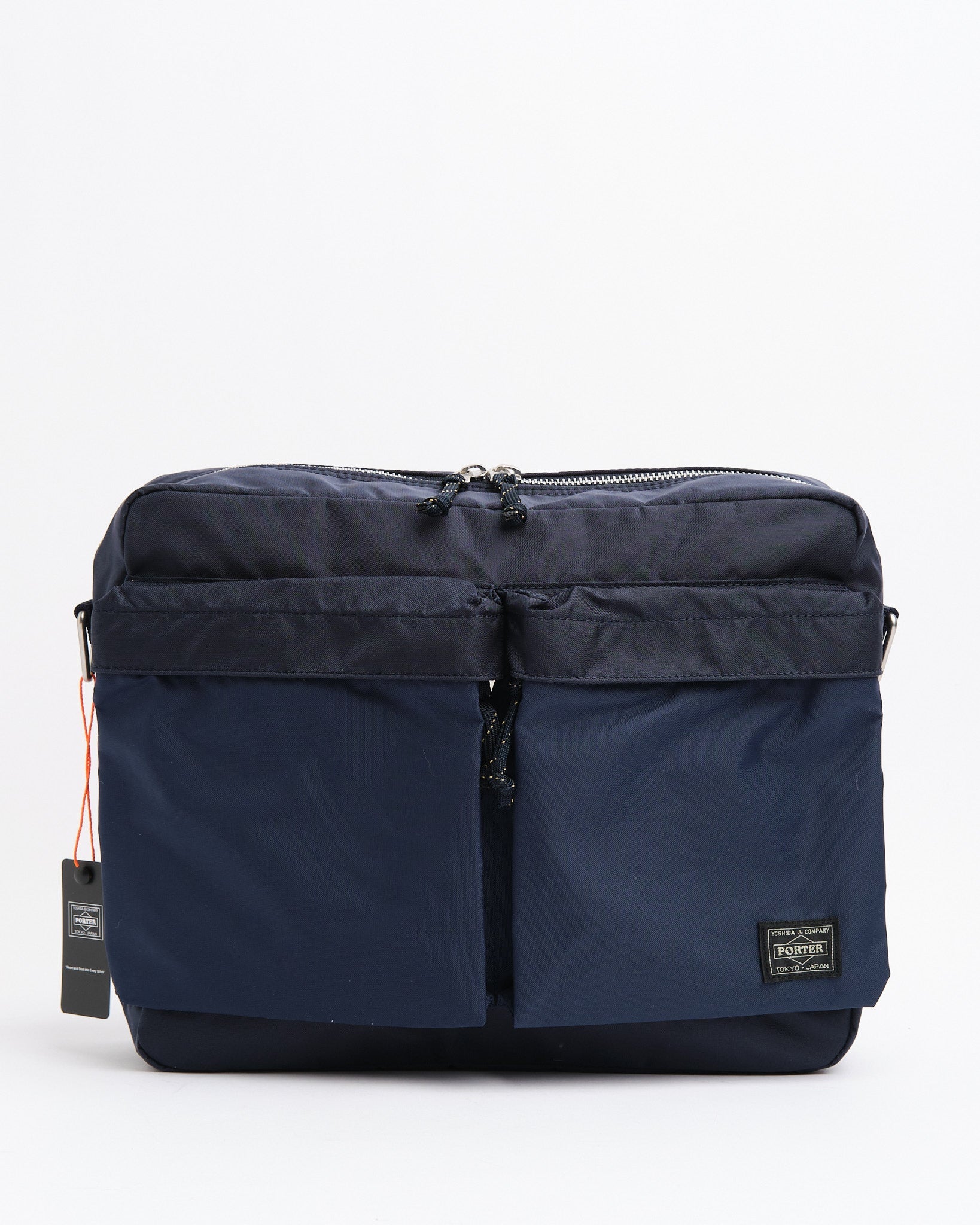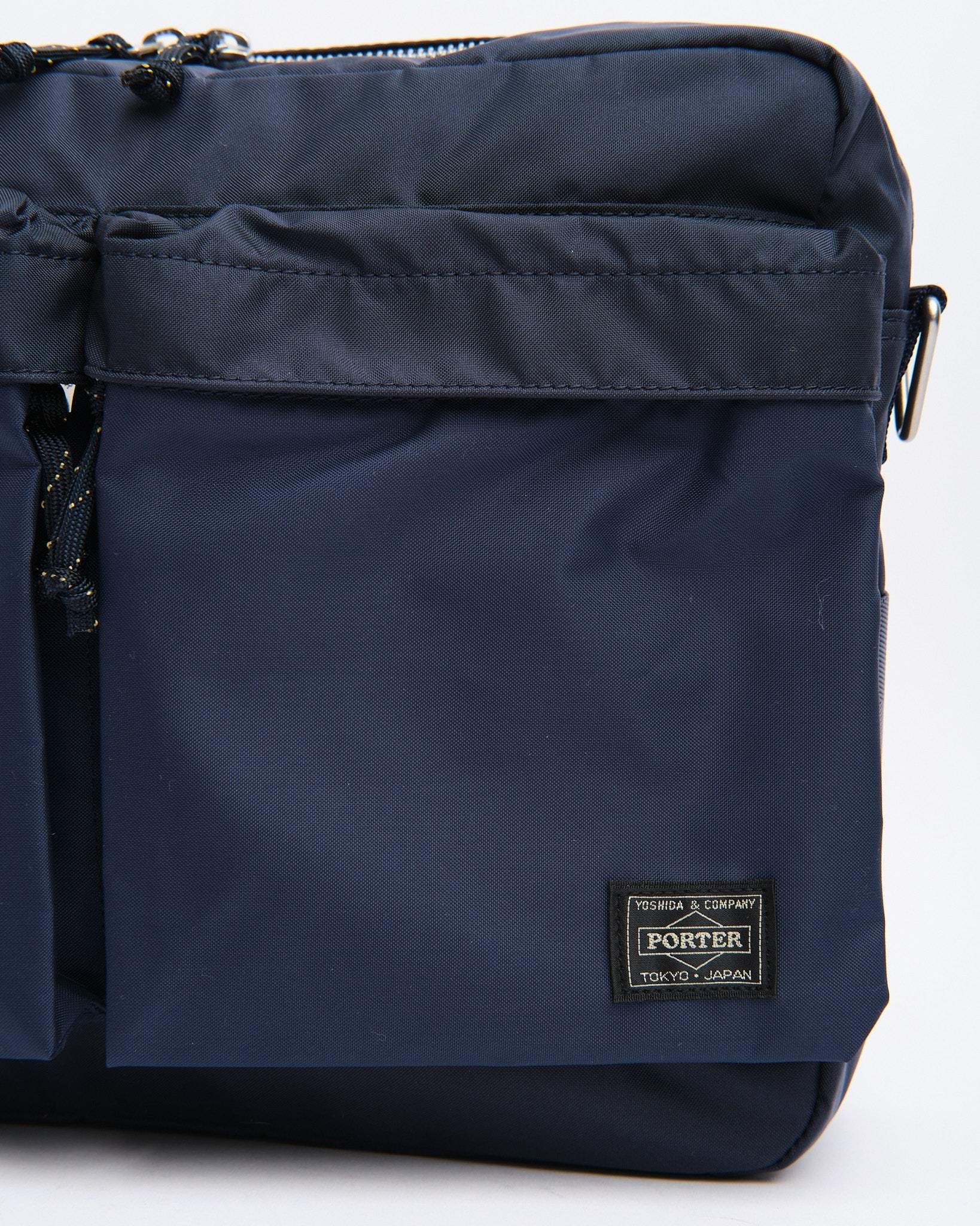 Die PORTER BY YOSHIDA Force Schultertasche ist Teil der PORTER FORCE-Serie, die sich von militärischen Ästhetiken und den zufälligen Farbunterschieden in Militärgütern inspirieren lässt. Ein hervorstechendes Merkmal dieses Designs ist die subtile Farbvariation zwischen dem Stoff der Vordertasche und dem Hauptkörper der Tasche, was den Anschein erweckt, als ob verschiedene Stoffpartien verwendet werden. Diese Serie feiert diese unregelmäßigen Farbschemata, die häufig bei Militärkleidung und -zubehör zu sehen sind.