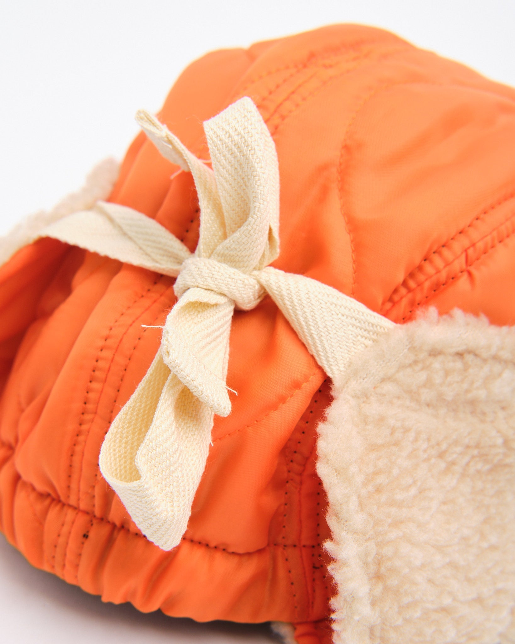 The Halfmoon Cap With Ears in Orange by Found Feather fuses military functionality with bold styling. Made in Japan from quilted nylon with a lightweight polyester fill, it features plush boa fleece ear panels and a soft EVA foam brim for warmth and comfort without weight. The four-panel design provides structure, while full-back elastic and cotton flat laces give it a secure, adaptable fit. Finished with hand-stamped detail, cotton twill lining, and a QR-coded care label, this cap is equal parts utilitarian and expressive.