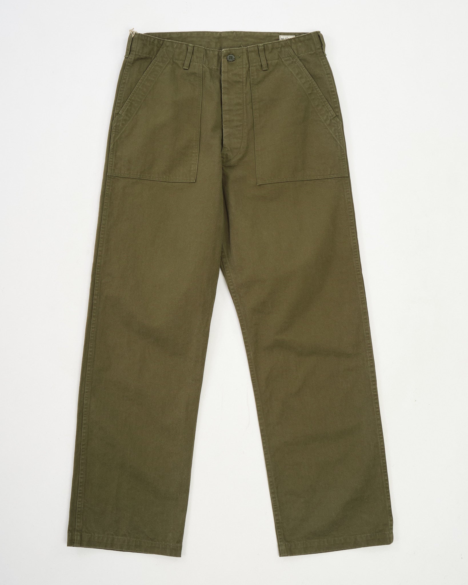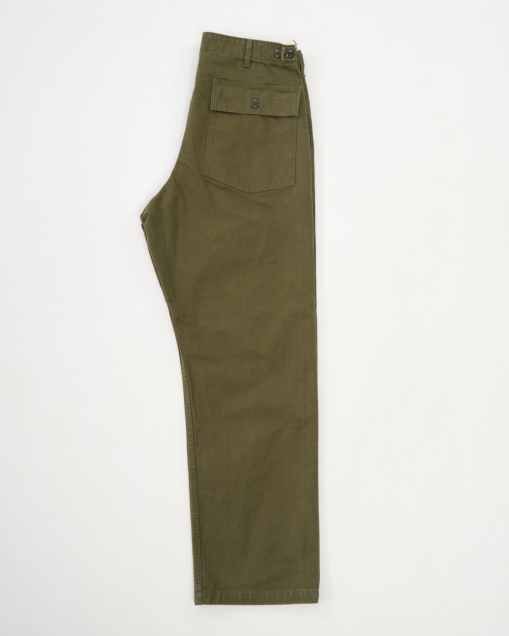 The fit stays true to orSlow’s “Vintage Fit” design—wide through the leg, with a deep rise for a relaxed and heritage-inspired profile. Signature fatigue details remain: button fly, side adjuster tabs, oversized utility pockets, and reinforced flap pockets at the back. The army green color is muted and versatile, evolving with wear as the textured weave softens and fades.