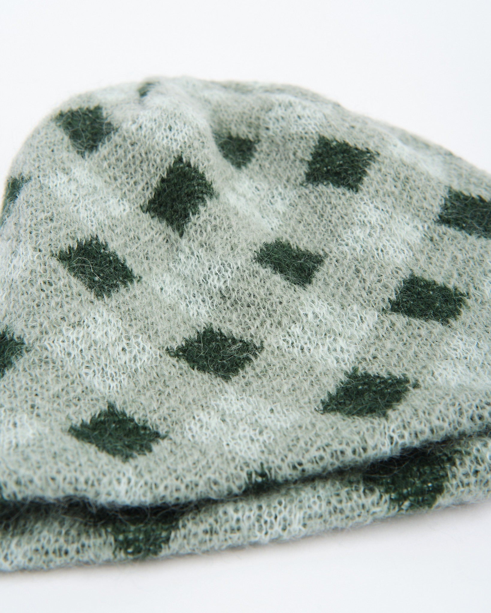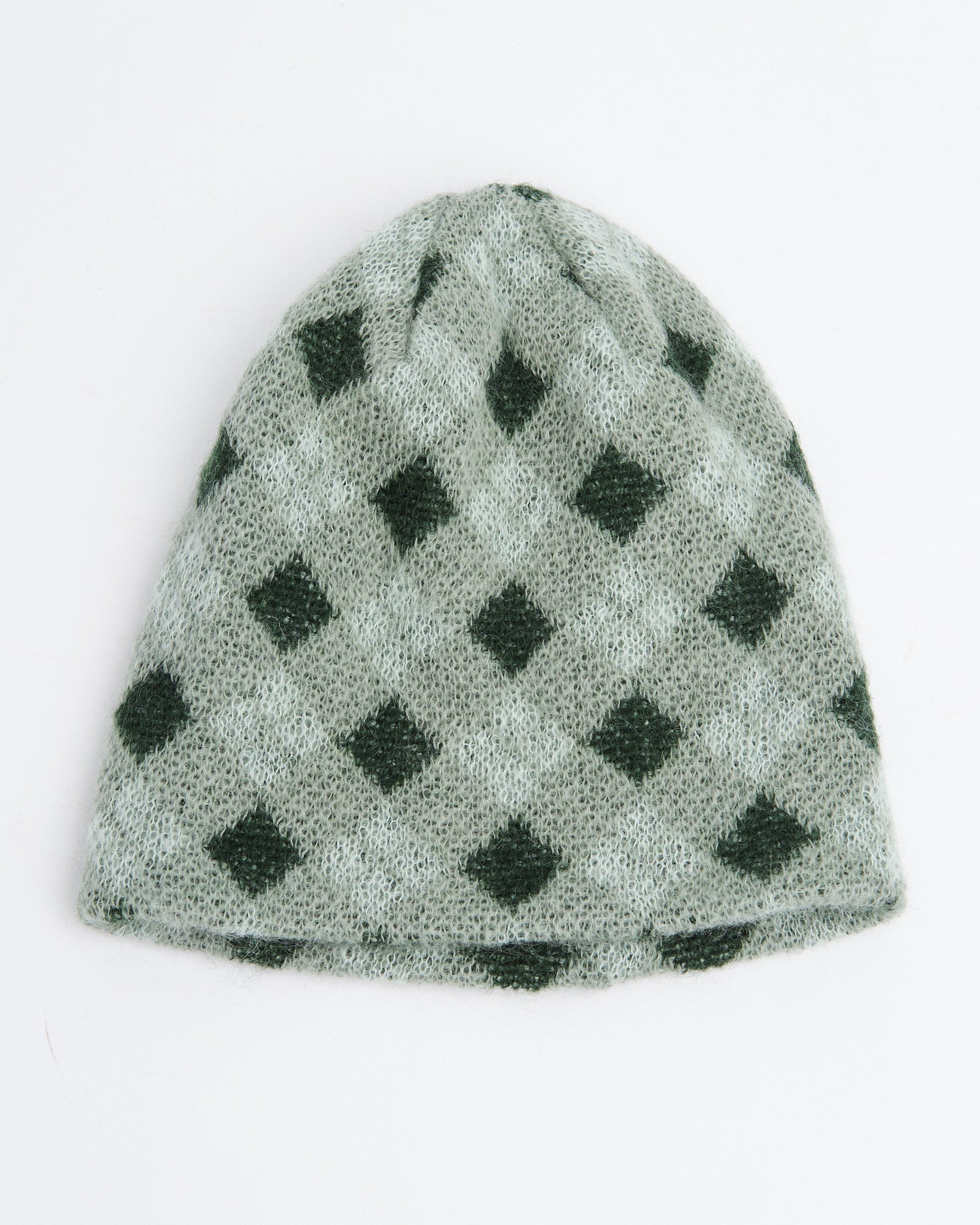 The Mohair Skully in Green by Found Feather blends cozy construction with clean, compact design. Made in Japan and crafted from a soft jacquard knit, this one-panel beanie wraps your head in warmth and comfort. A brushed interior, snug unisex fit, and subtle woven label give it everyday versatility, while thoughtful features like a QR-coded care label keep things modern. With its soft touch and flexible size range, the Skully is made to top off your look with effortless cool — season after season.