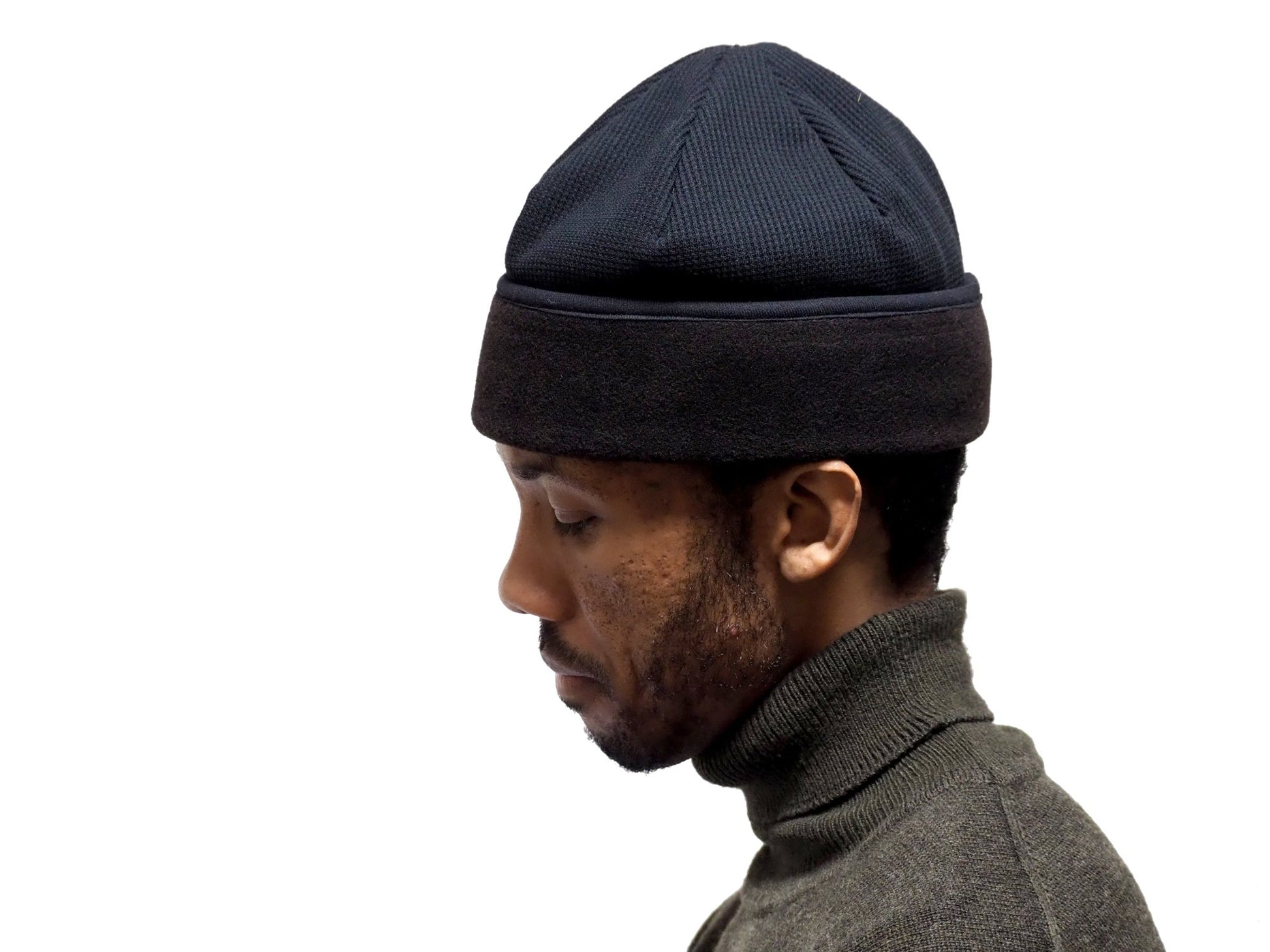 2 Tone Beanie Waffle Schwarz von Found Feather. Diese Beanie kombiniert ein Äußeres aus 100% Baumwoll-Waffelstrick mit einem kuscheligen Futter aus Polarfleece, um Sie den gesamten Herbst/Winter über warm zu halten. Kontrastnähte an den Paspeln. Hergestellt in Japan.