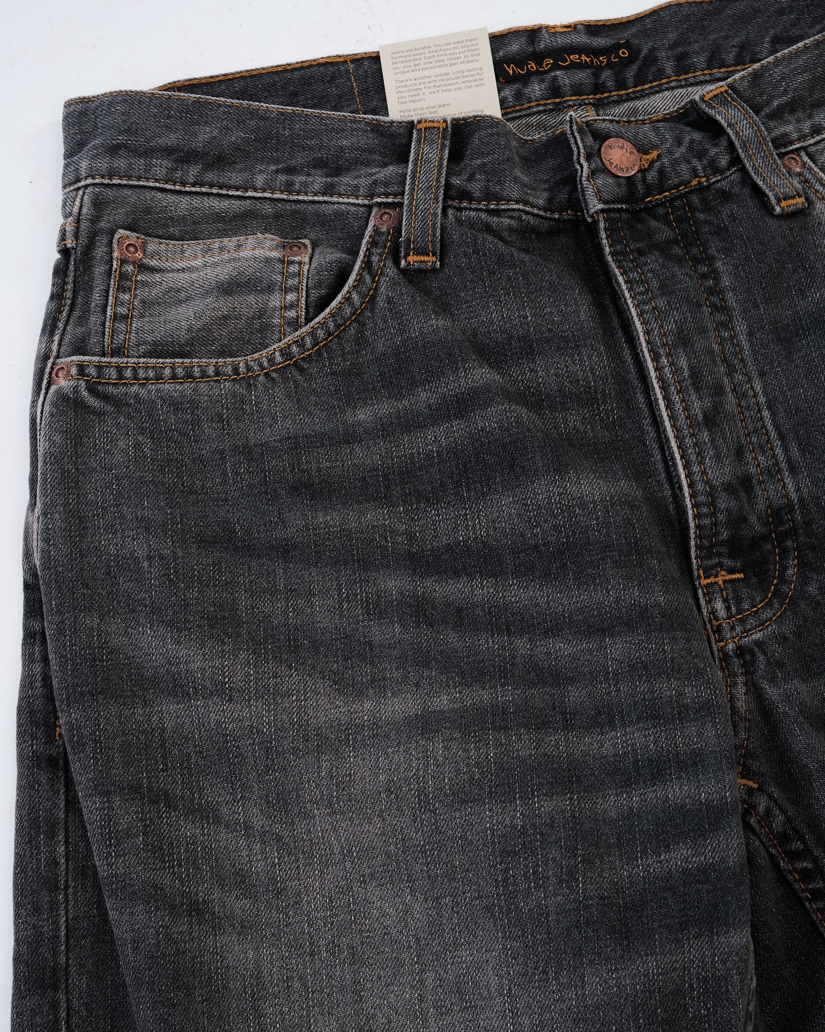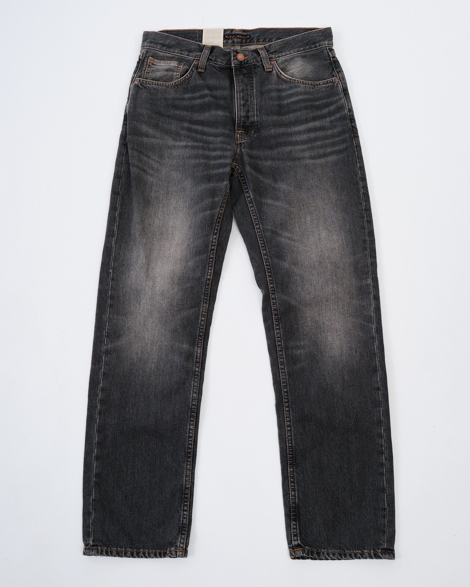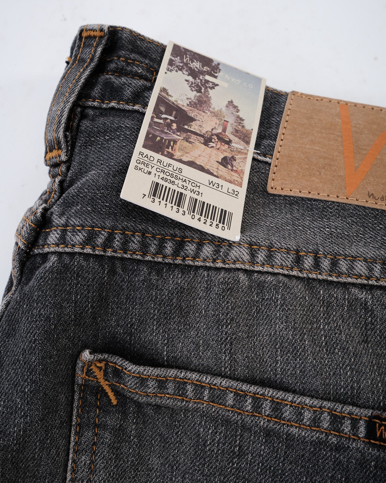 Tauchen Sie ein in kühnen Denim-Stil mit NUDIE JEANS CO. RAD RUFUS GRAU CROSSHATCH. Diese hochgeschnittenen, regulär geschnittenen Jeans mit geradem Bein zeichnen sich durch eine auffällige graue Waschung mit tiefen Kontrasten aus. Gefertigt aus schwarzem Denim, zeigt der Stoff eine robuste Kreuzschraffur-Textur, die reiche Höhen und Tiefen mit einem dynamischen, faserigen Erscheinungsbild schafft.