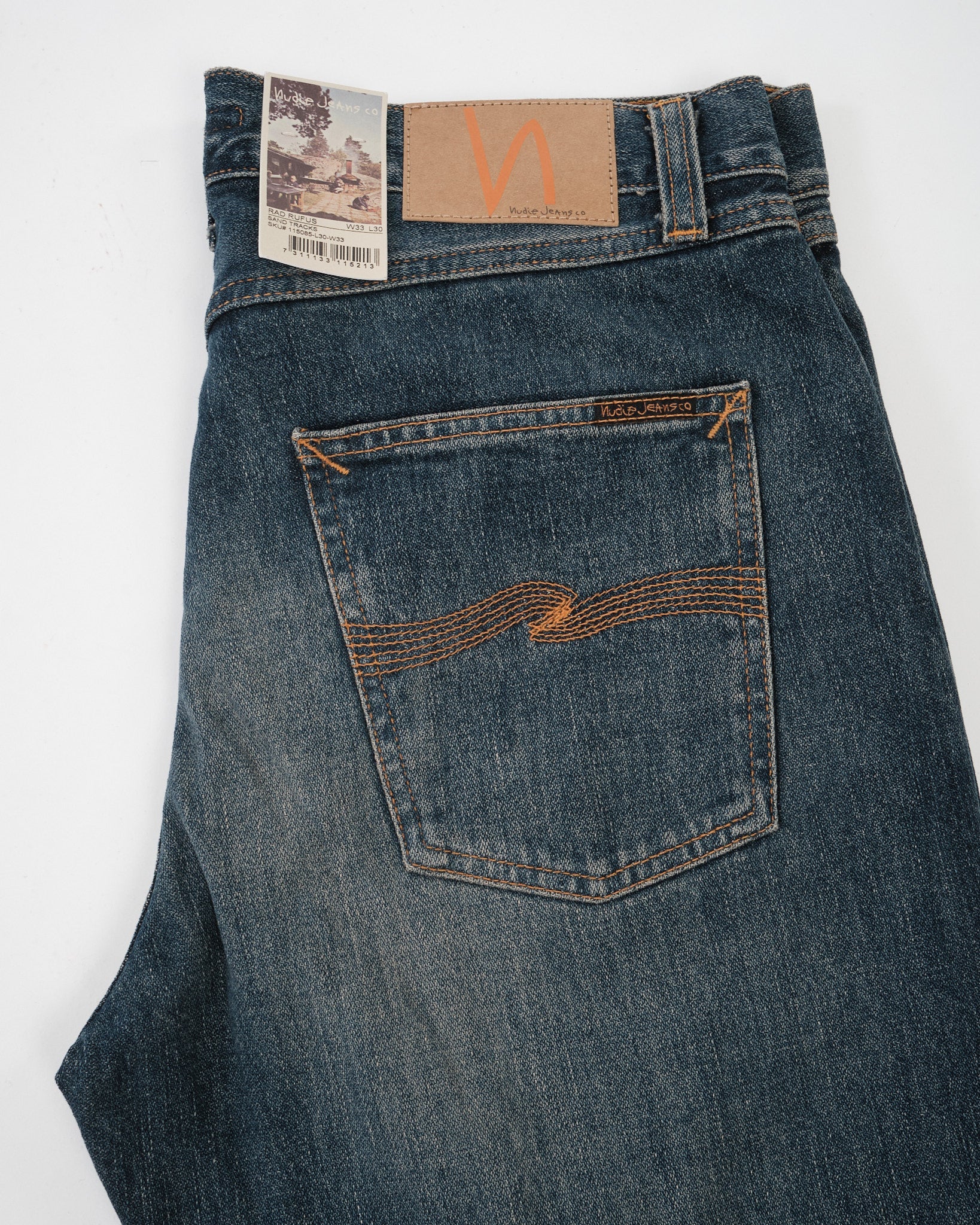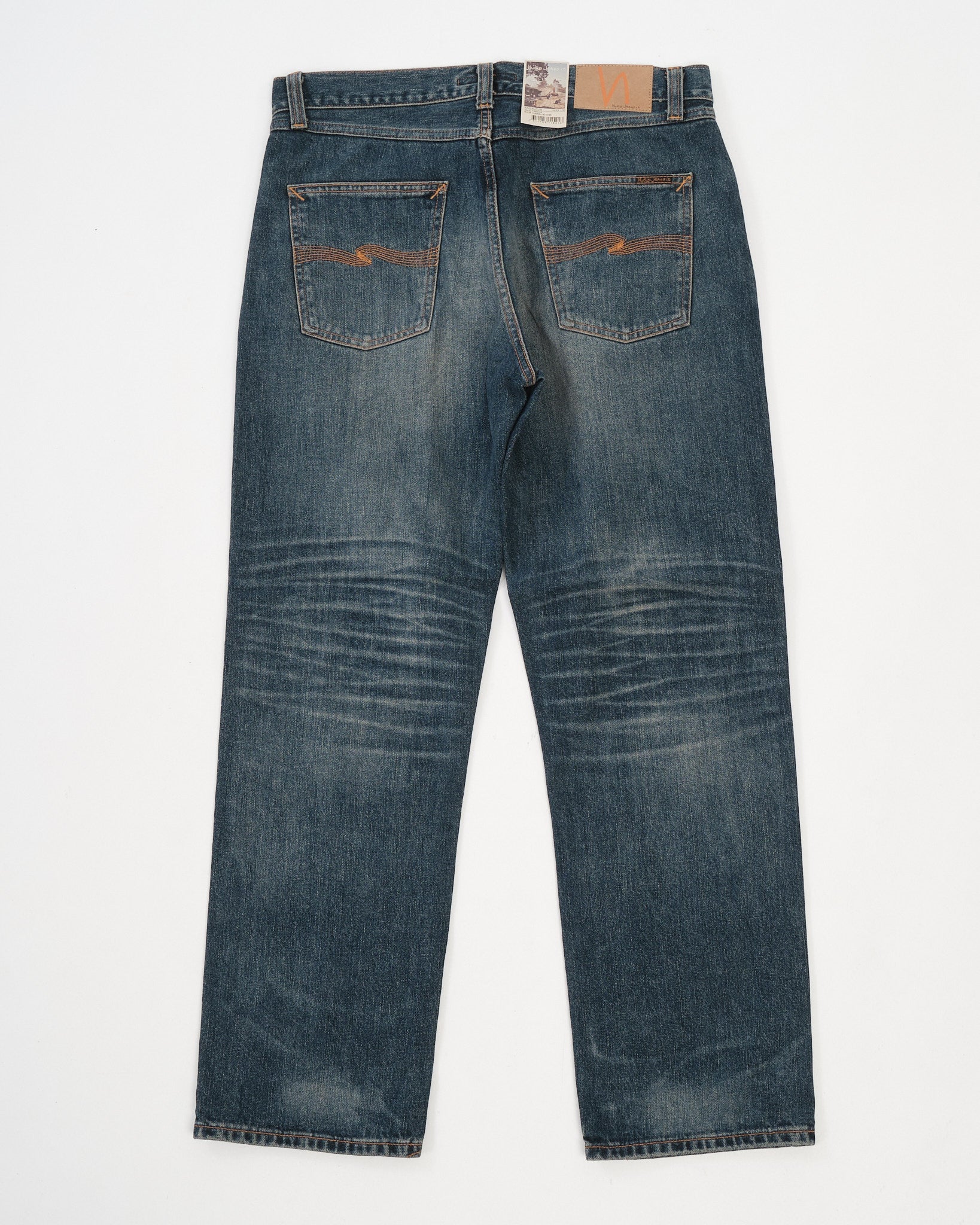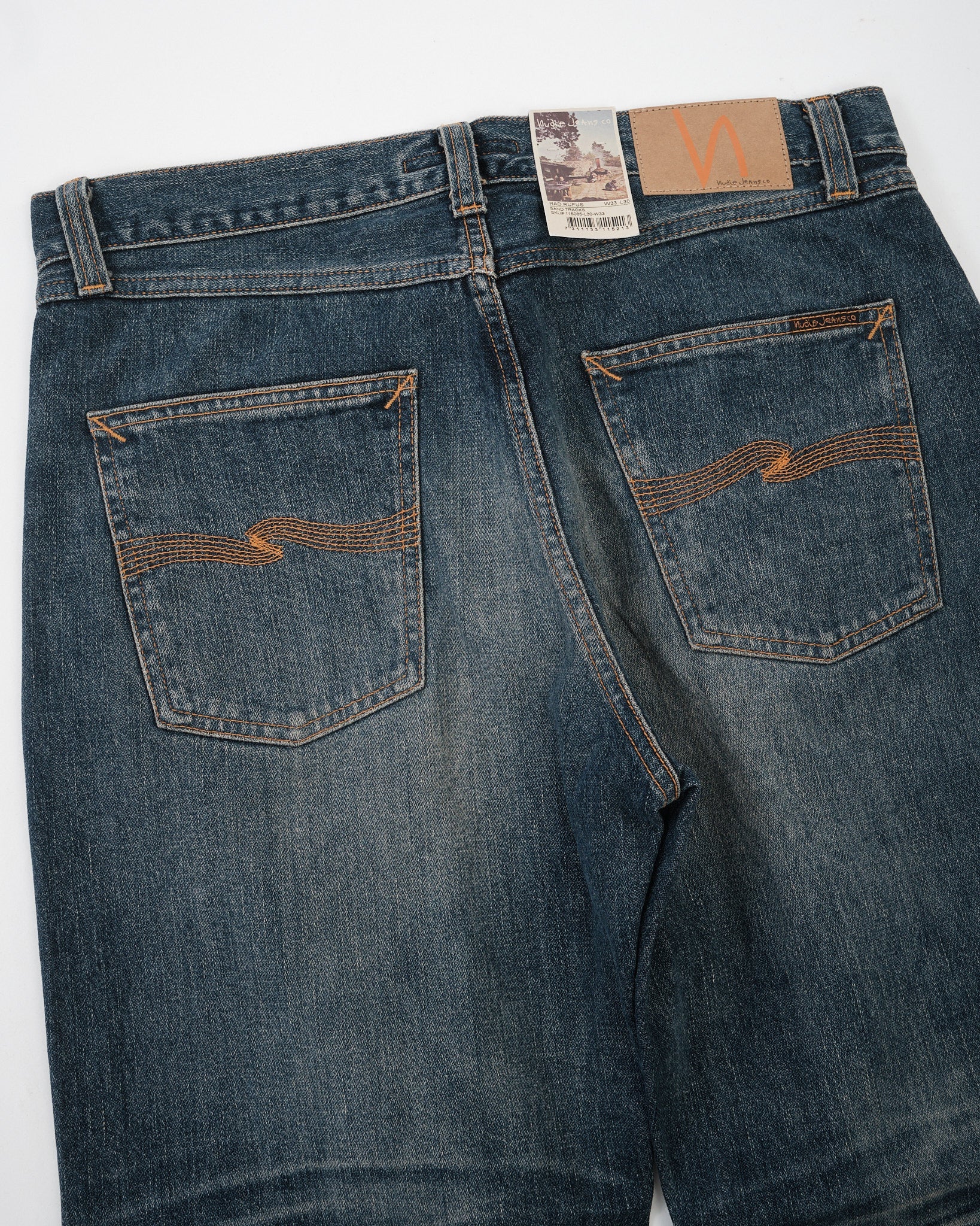 The Rad Rufus Sand Tracks are a faithful reproduction of the fades and wear patterns from an original, genuinely worn-in pair of Nudie Jeans. Using a precise recreation process, the character of the vintage reference has been captured and reworked onto a fresh pair, down to the placement and tone of the wear marks. Cut in Rad Rufus’ regular fit with a high waist and straight leg, they’re made from 13.75 oz rigid broken twill denim and washed to a deep, slightly greenish indigo with warm, high-contrast abrasion. The result is a textured, streaky denim with a coarse hand and a convincingly lived-in look—part of Nudie’s Life Tracks concept, where each wash is built around a real story.