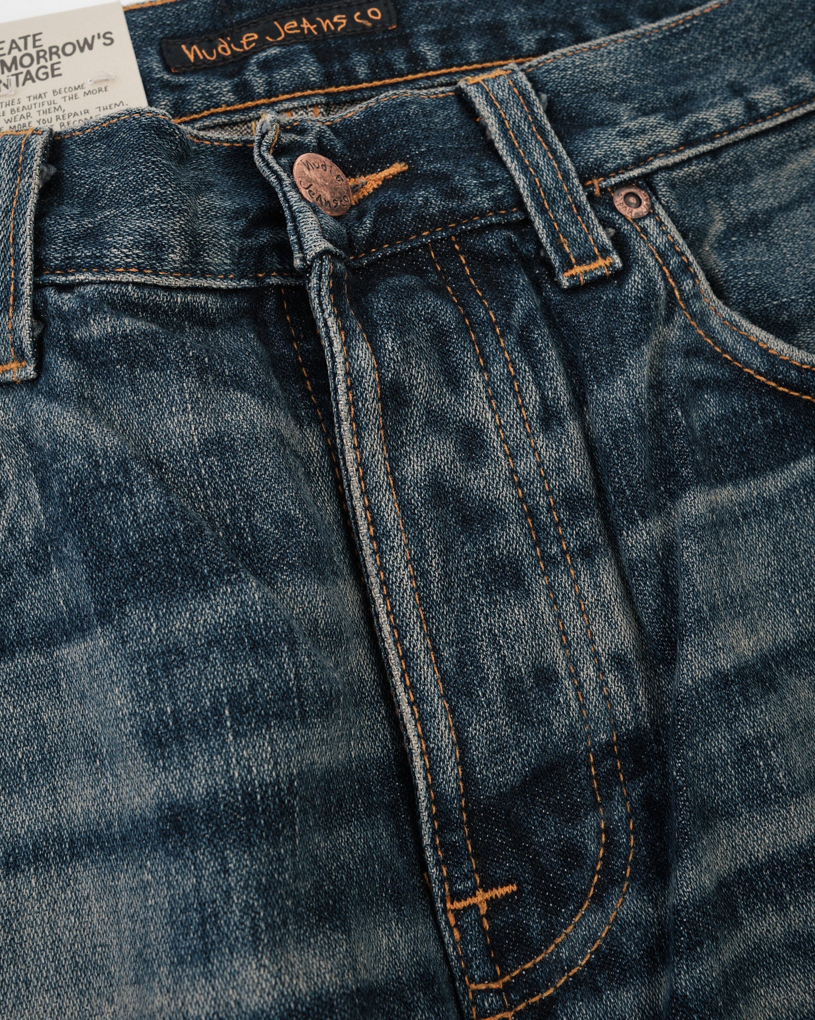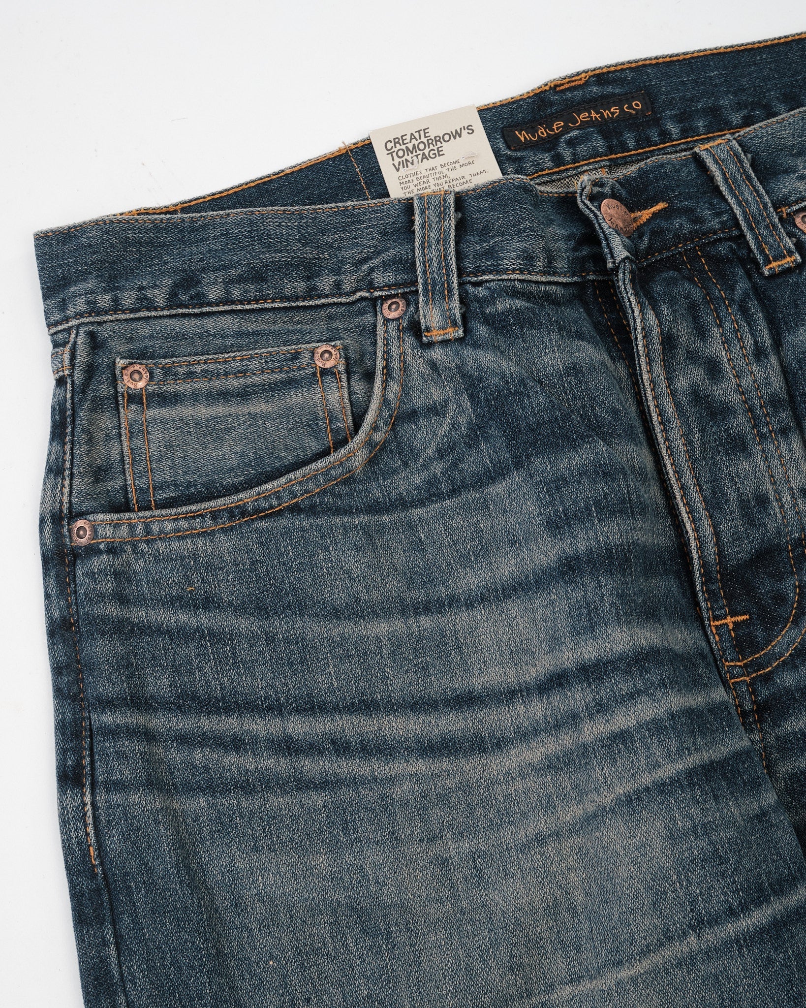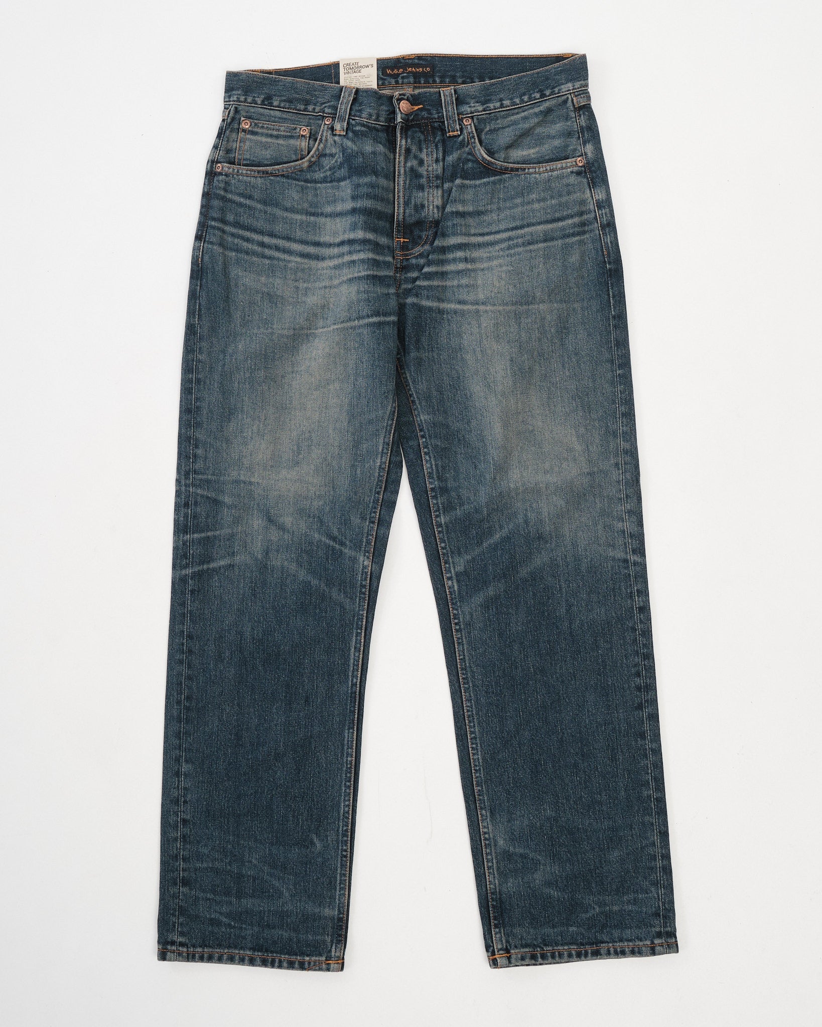 The Rad Rufus Sand Tracks are a faithful reproduction of the fades and wear patterns from an original, genuinely worn-in pair of Nudie Jeans. Using a precise recreation process, the character of the vintage reference has been captured and reworked onto a fresh pair, down to the placement and tone of the wear marks. Cut in Rad Rufus’ regular fit with a high waist and straight leg, they’re made from 13.75 oz rigid broken twill denim and washed to a deep, slightly greenish indigo with warm, high-contrast abrasion. The result is a textured, streaky denim with a coarse hand and a convincingly lived-in look—part of Nudie’s Life Tracks concept, where each wash is built around a real story.