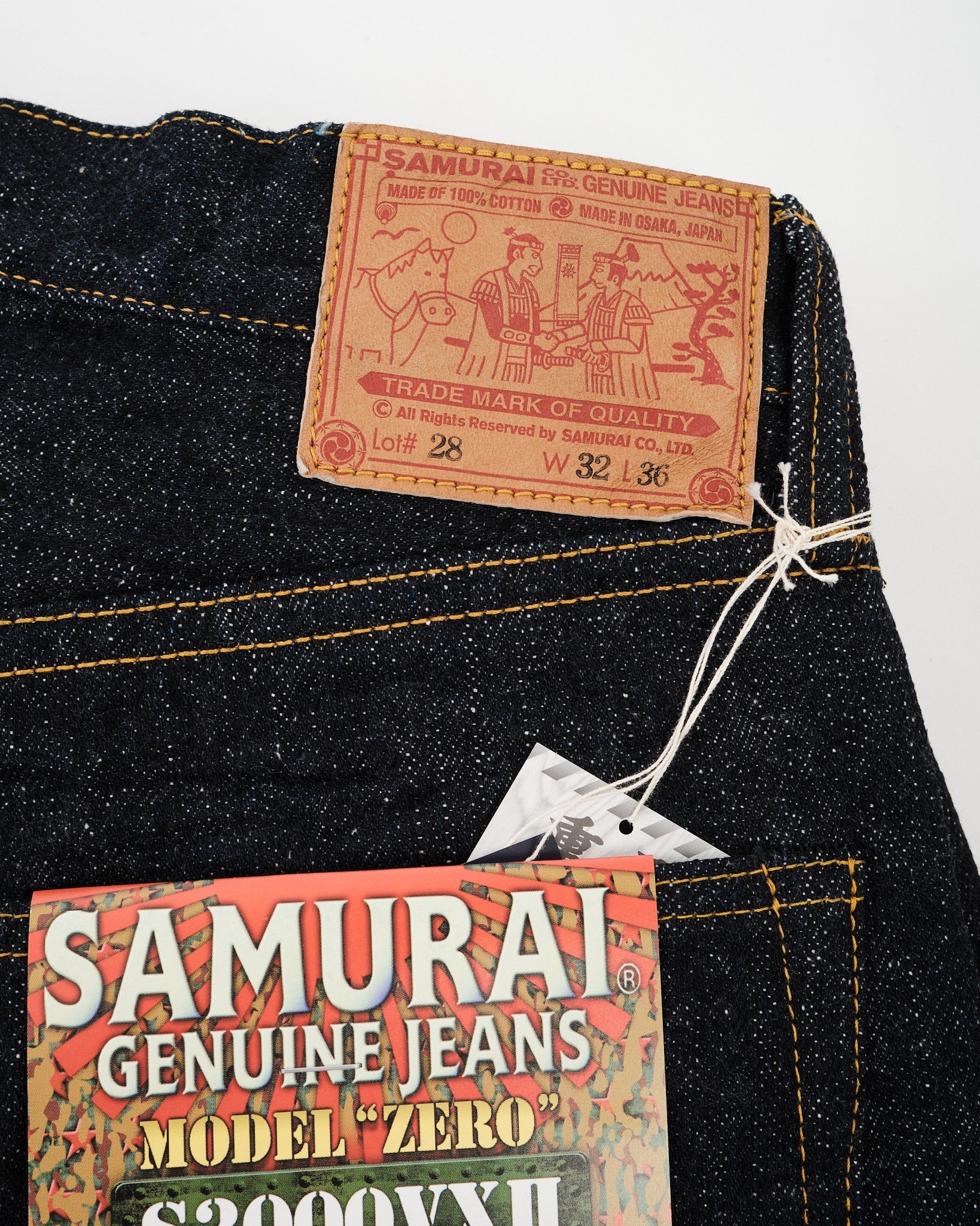 True to Samurai’s dedication to detail, the exclusive leather patch features Musashi and Kojiro shaking hands in armor — a symbol of peace. Other features include red herringbone slake, iron pine tree buttons, copper coin rivets, and an exclusive flasher. The stitching is carefully tuned for authenticity, with adjustments in width, count, and needlework across different sections. Wartime-inspired details — such as rounded stitchwork and raw inner seams left untucked — bring the design even closer to its historical roots.