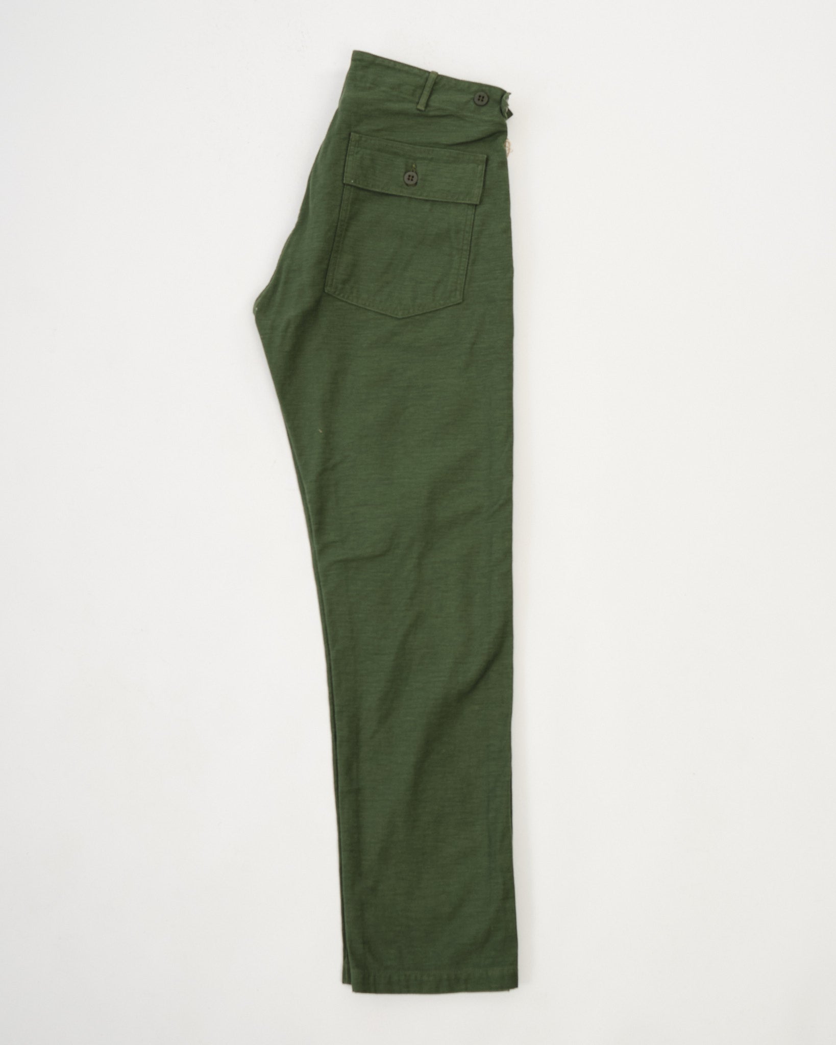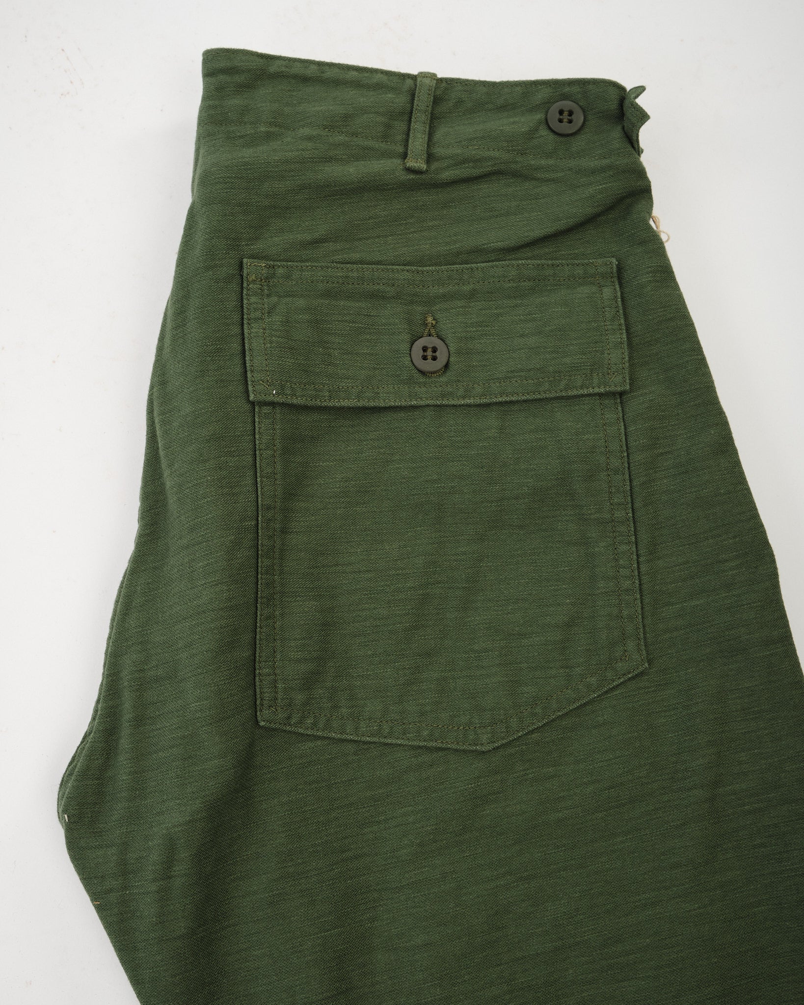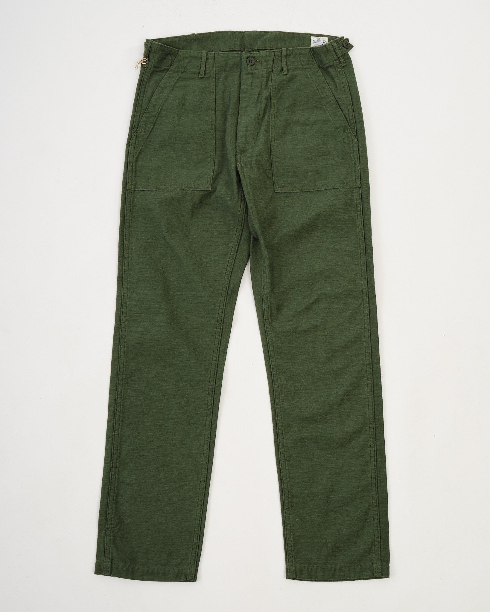 Erleben Sie den zeitlosen Charme von neu erfundenem Vintage mit den orSlow Slim Fit Fatigue Pants in einem Grünton. Mit viel Liebe zum Detail in Japan aus Reverse-Satin gefertigt, zollen diese Hosen dem klassischen Militärdesign Tribut. Hergestellt aus 100% strapazierfähigem Baumwolltwill, verbinden sie utilitaristische Elemente mit einem Hauch von Modernität. Erwarten Sie Seitentaschen, einen mit Laschen geschnürten Bund und eine schlanke Passform, die eine zeitgemäße Silhouette unterstreicht. Ob kombiniert mit einer verblassten Jeansjacke oder einem gemütlichen Wollpullover, diese Hosen strahlen einen Stil aus, gepaart mit unübertroffener Bequemlichkeit.