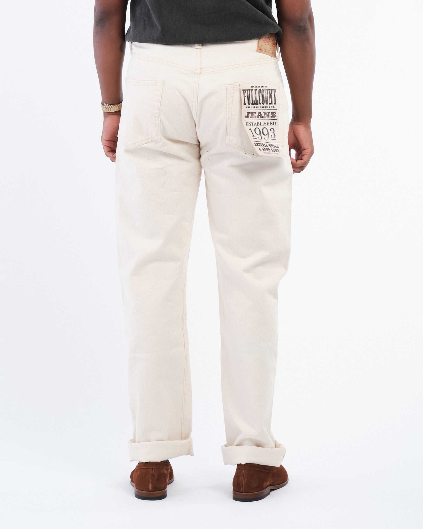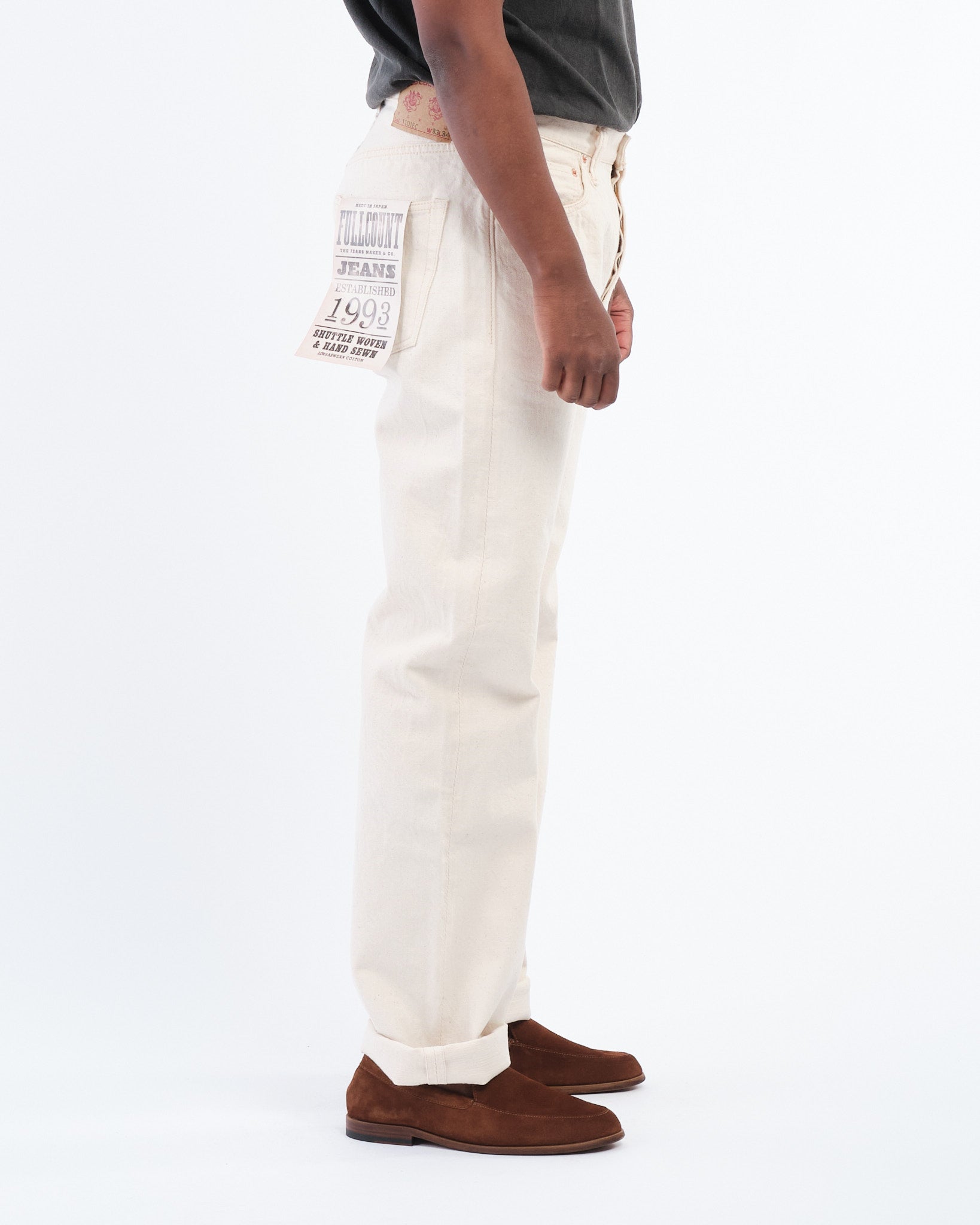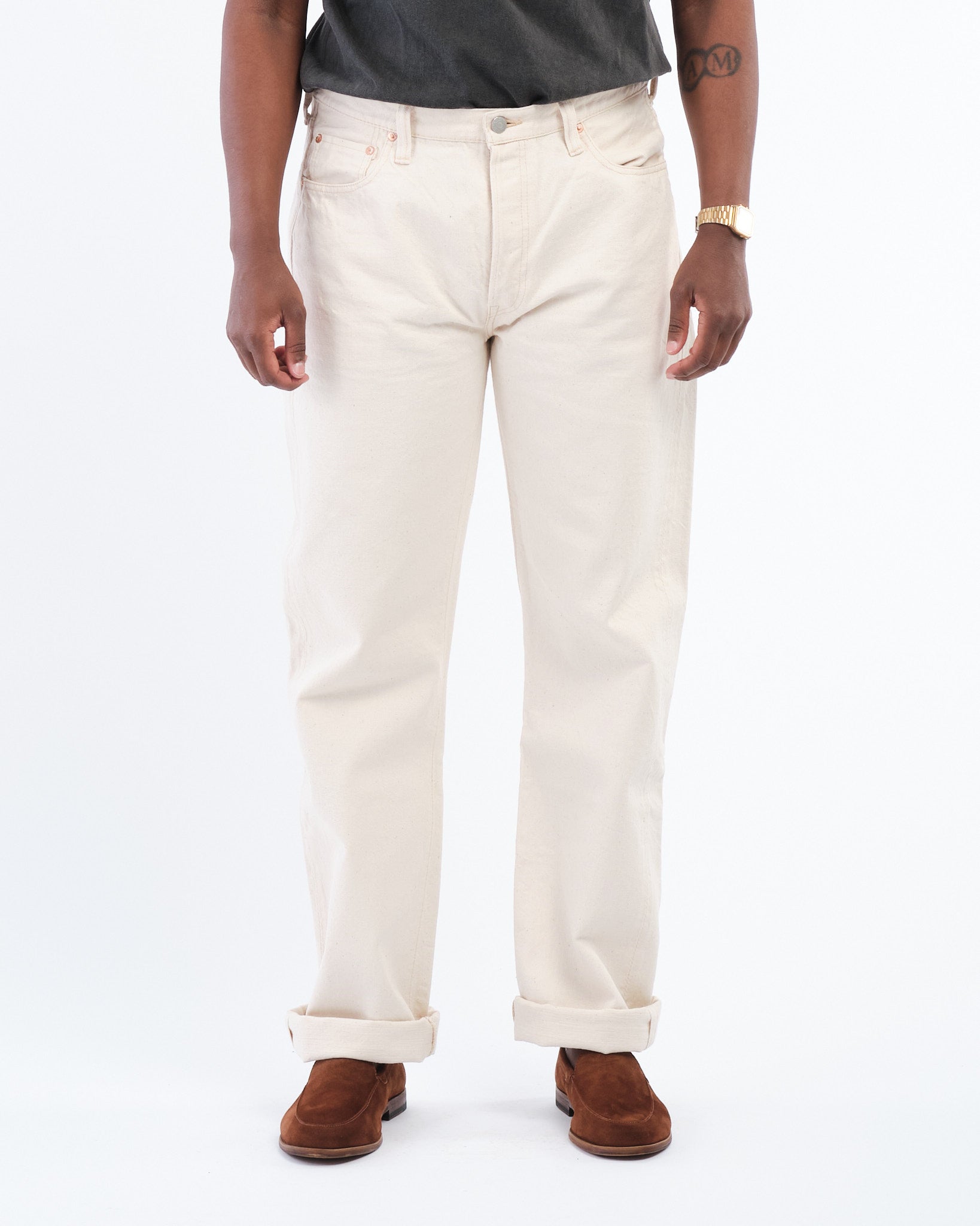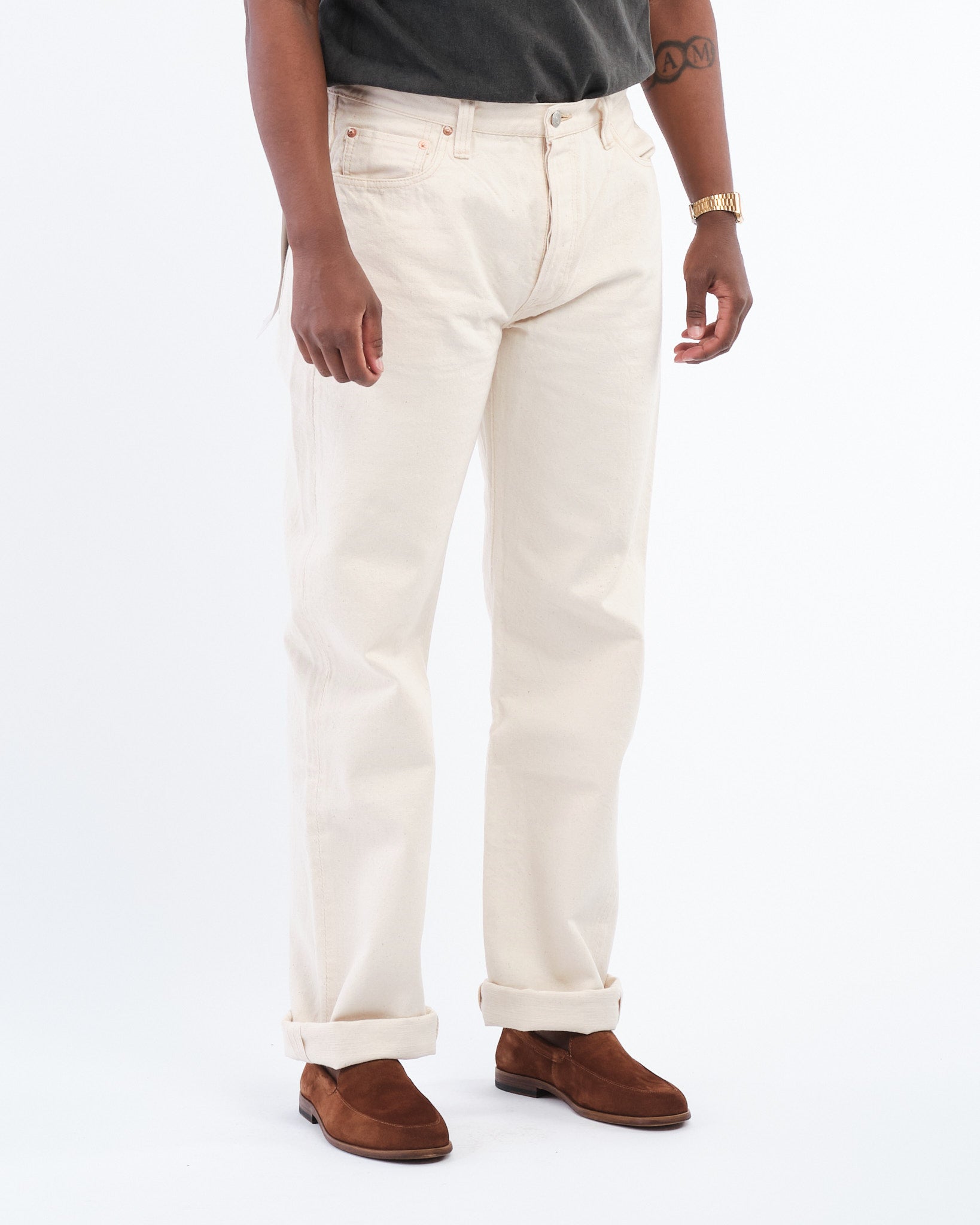 Die FULL COUNT 1101EC STRAIGHT ECRU SELVEDGE DENIM (1101EC) ist aus 100% biologischer Baumwolle gefertigt und in Japan gewebt, um die natürliche Schönheit der Baumwollpflanze zu bewahren. Im Gegensatz zu herkömmlichem Denim wird dieses 13,7 Unzen Selvedge-Gewebe weder gefärbt noch gebleicht, was Baumwollreste wie Blatt- und Stängelfragmente intakt lässt und dem Stoff eine einzigartige Textur und ein authentisches, rohes Aussehen verleiht. Mit der klassischen 1101 Straight-Leg-Silhouette bieten diese Jeans sowohl Haltbarkeit als auch Komfort und gewährleisten, dass sie über Jahre getragen werden können. Der Stoff wird auf traditionellen Webstühlen gewebt, was die natürliche Elastizität und Widerstandsfähigkeit der Baumwolle bietet, mit einer Textur, die sich mit der Zeit wunderschön weich anfühlt. Mit jedem Waschen lösen sich die Baumwollreste natürlich ab, was den natürlichen Charakter des Stoffes verstärkt.