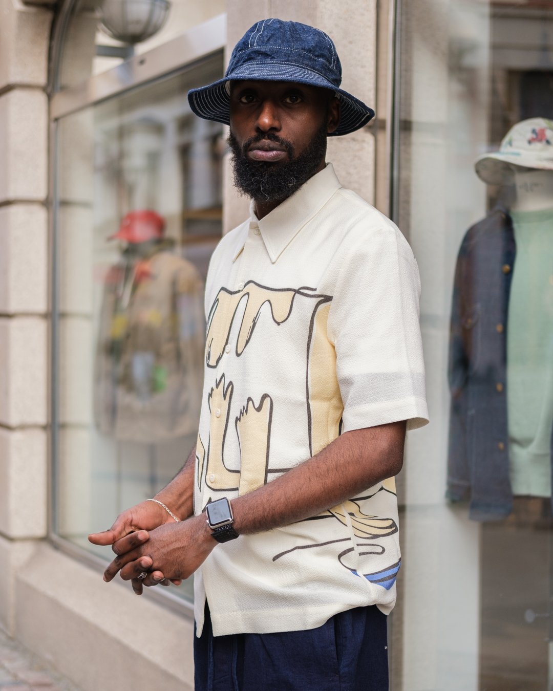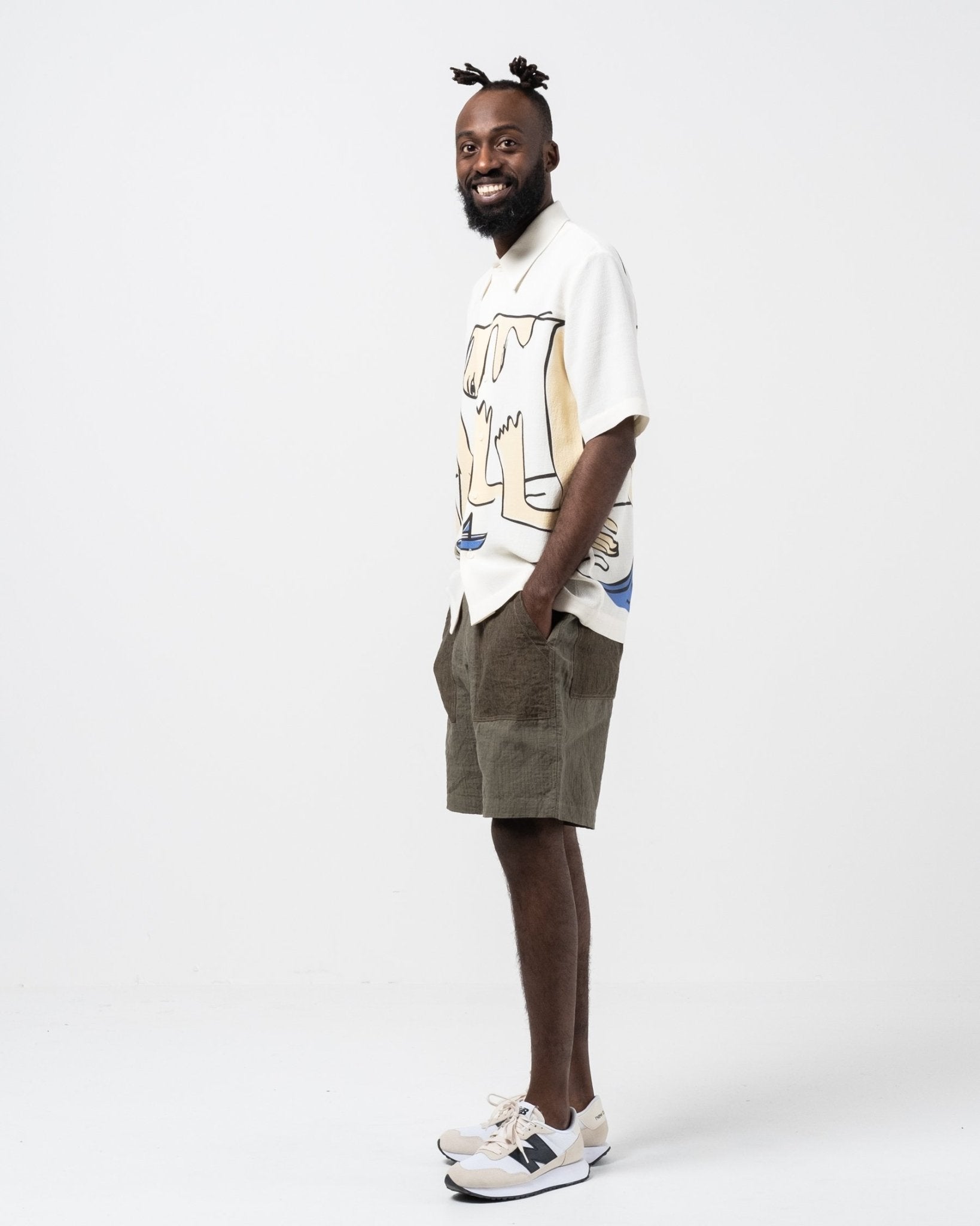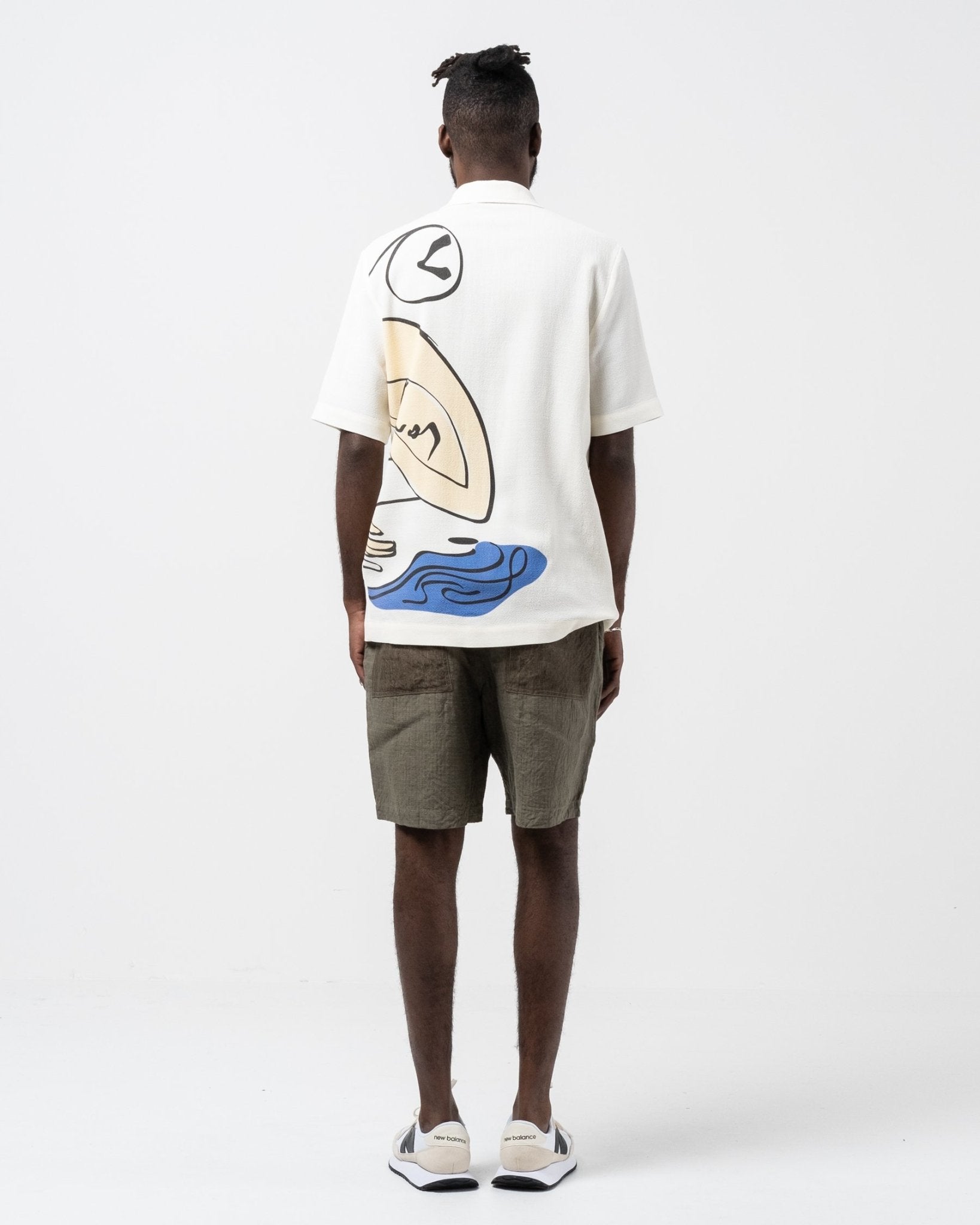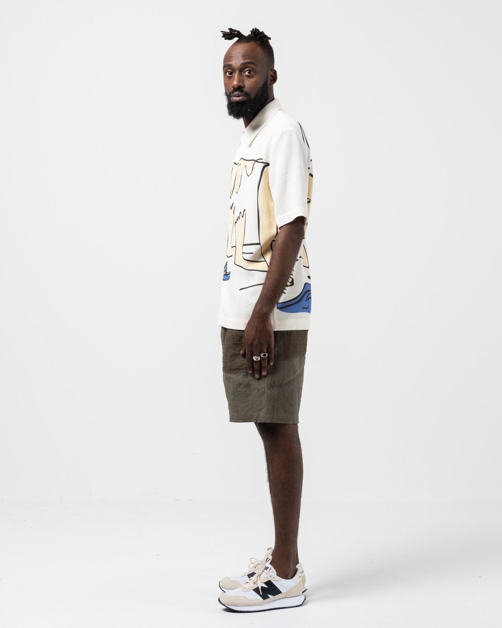 Suneham Shirt Union Print von Séfr. Kurzärmeliges Hemd mit geradem Schnitt und breitem Kragen. Schöner Stoff in einem Viskose-Woll-Kreppgewebe und Perlmuttknöpfen aus Italien. Union-Print von der Malmö-Künstlerin Therese Wendt. Hergestellt in Lettland.
