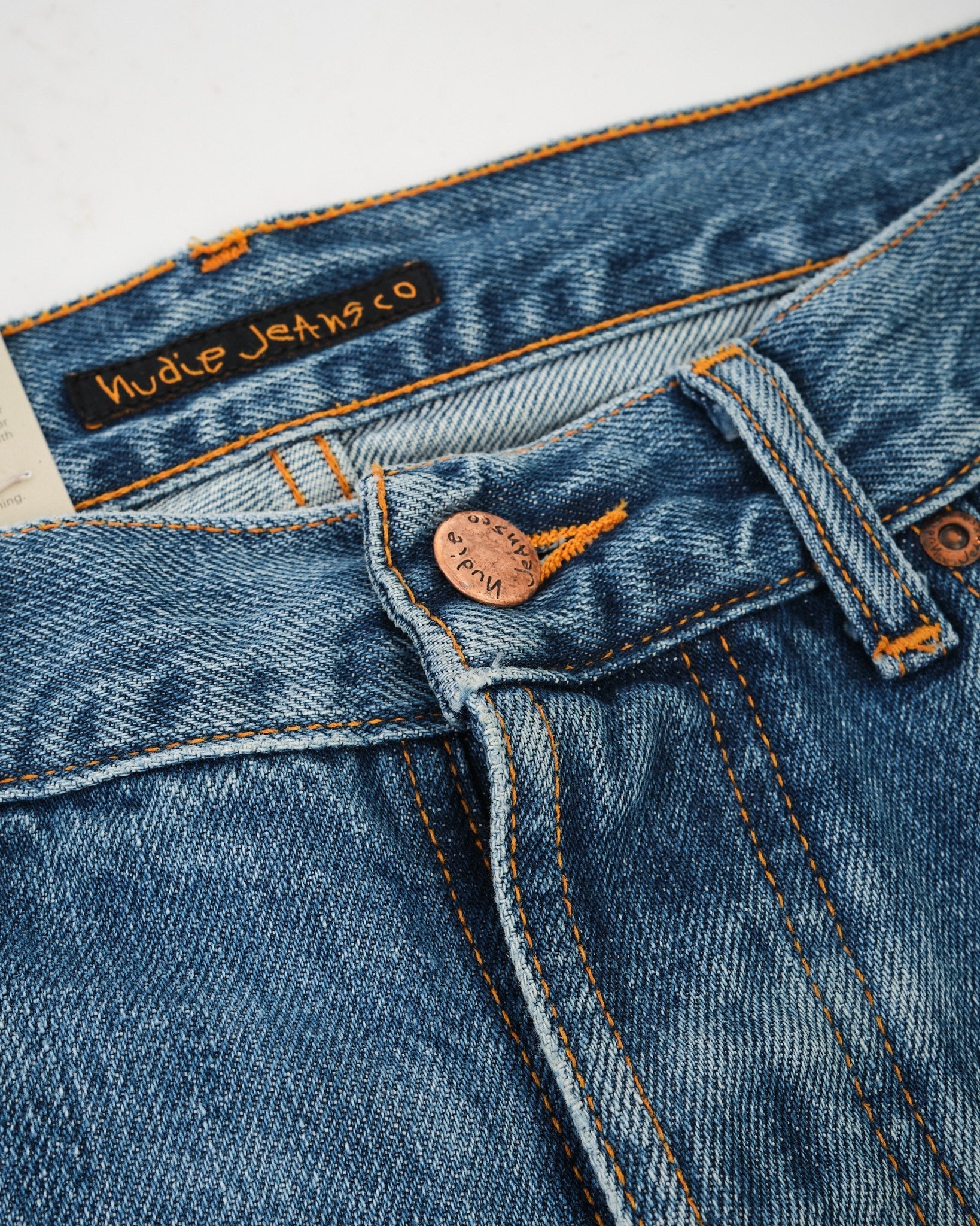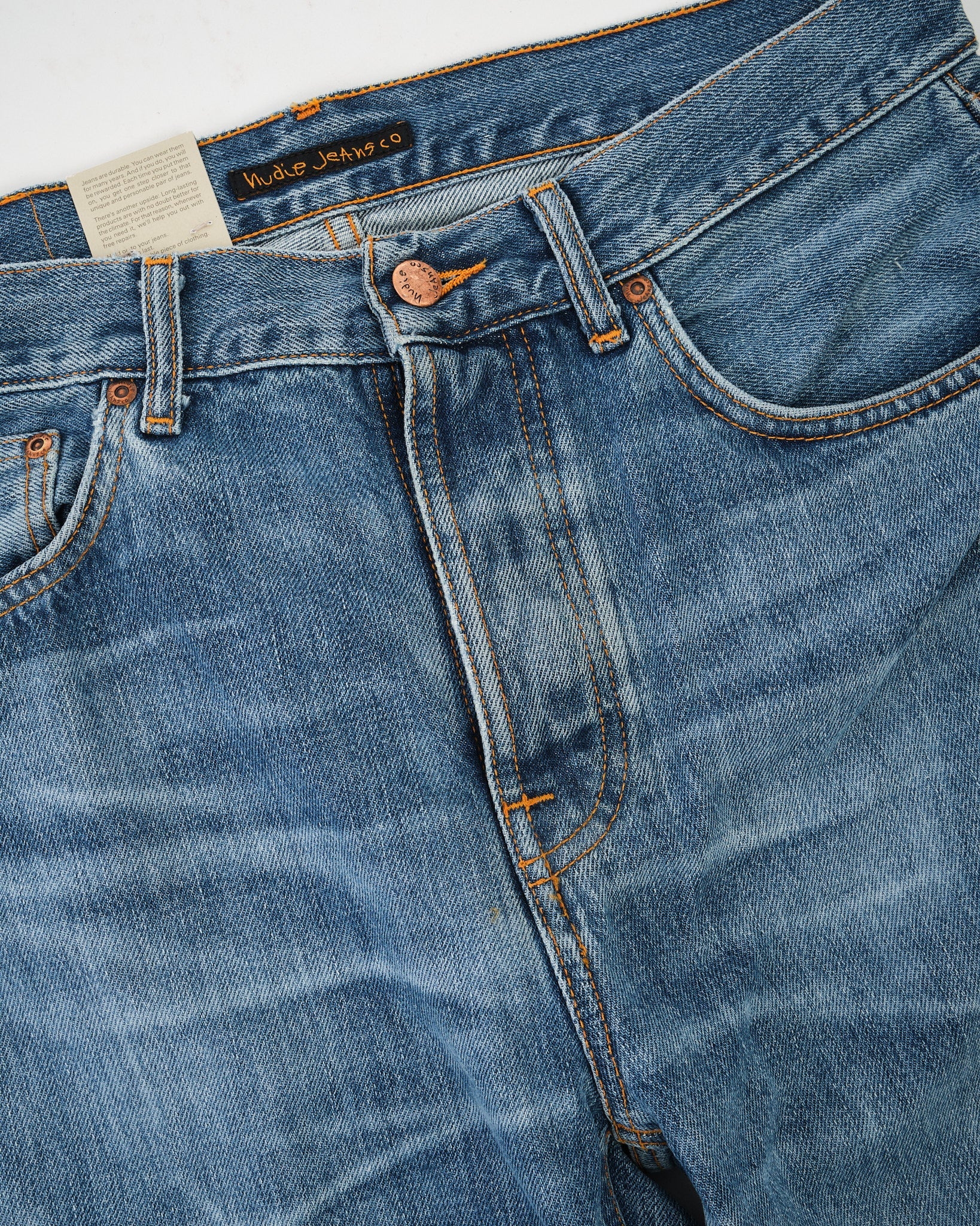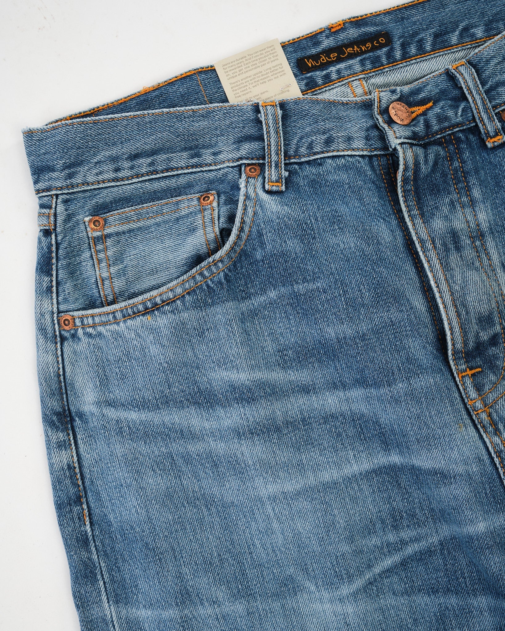 2. Authentische Nachbildung von eingetragenen Nudie Jeans mit realistischem Ausbleichen.