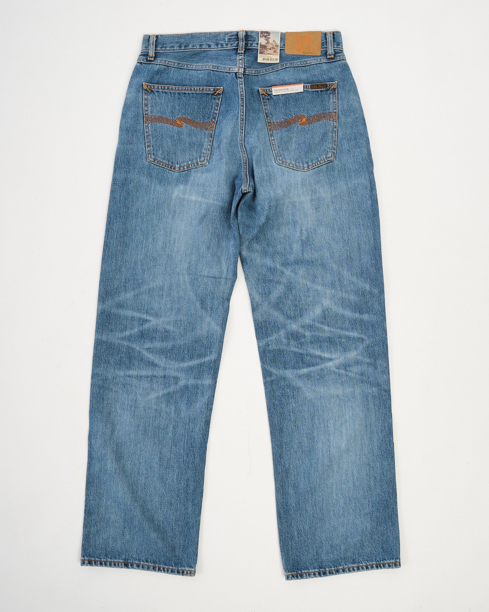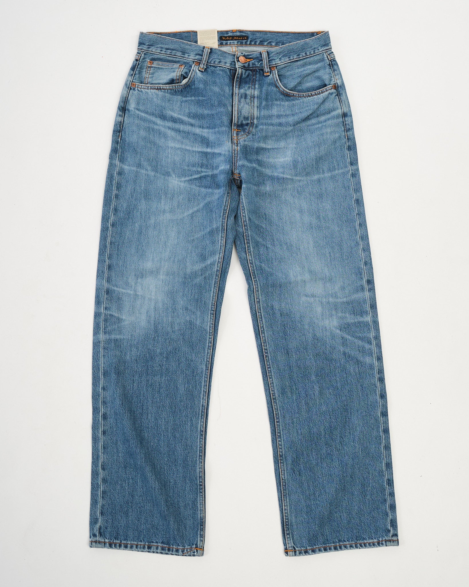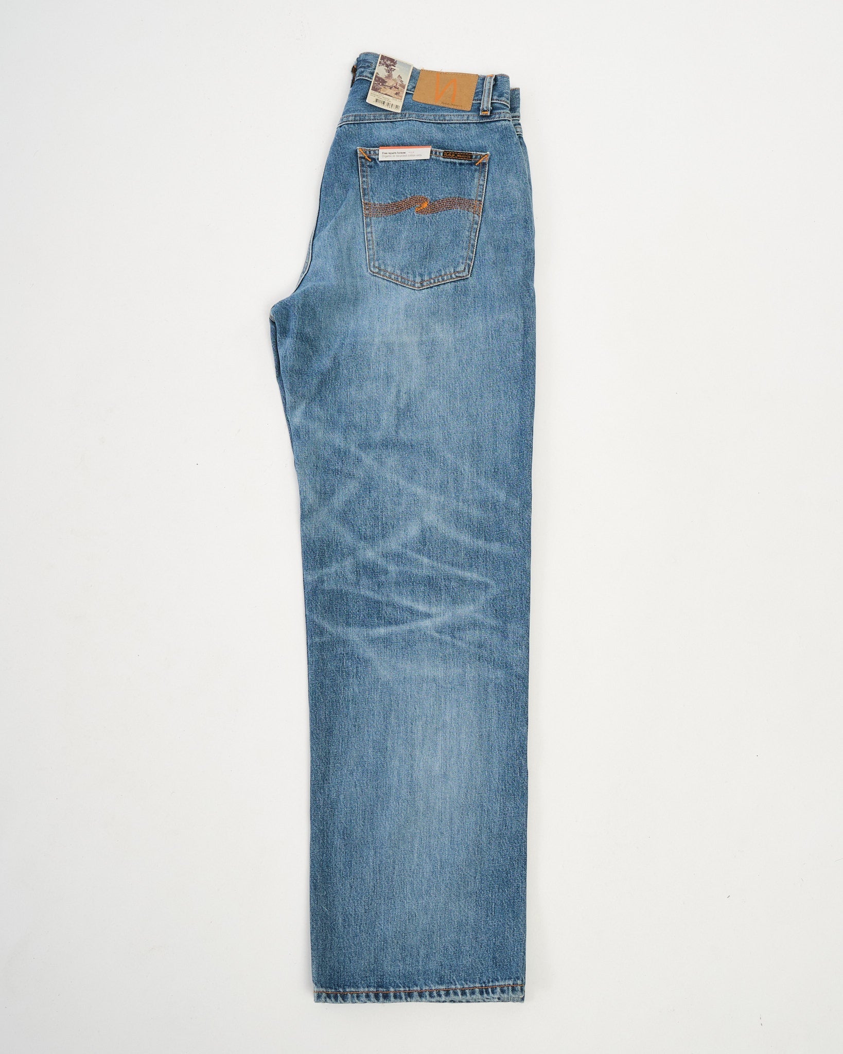 2. Authentische Nachbildung von eingetragenen Nudie Jeans mit realistischem Ausbleichen.