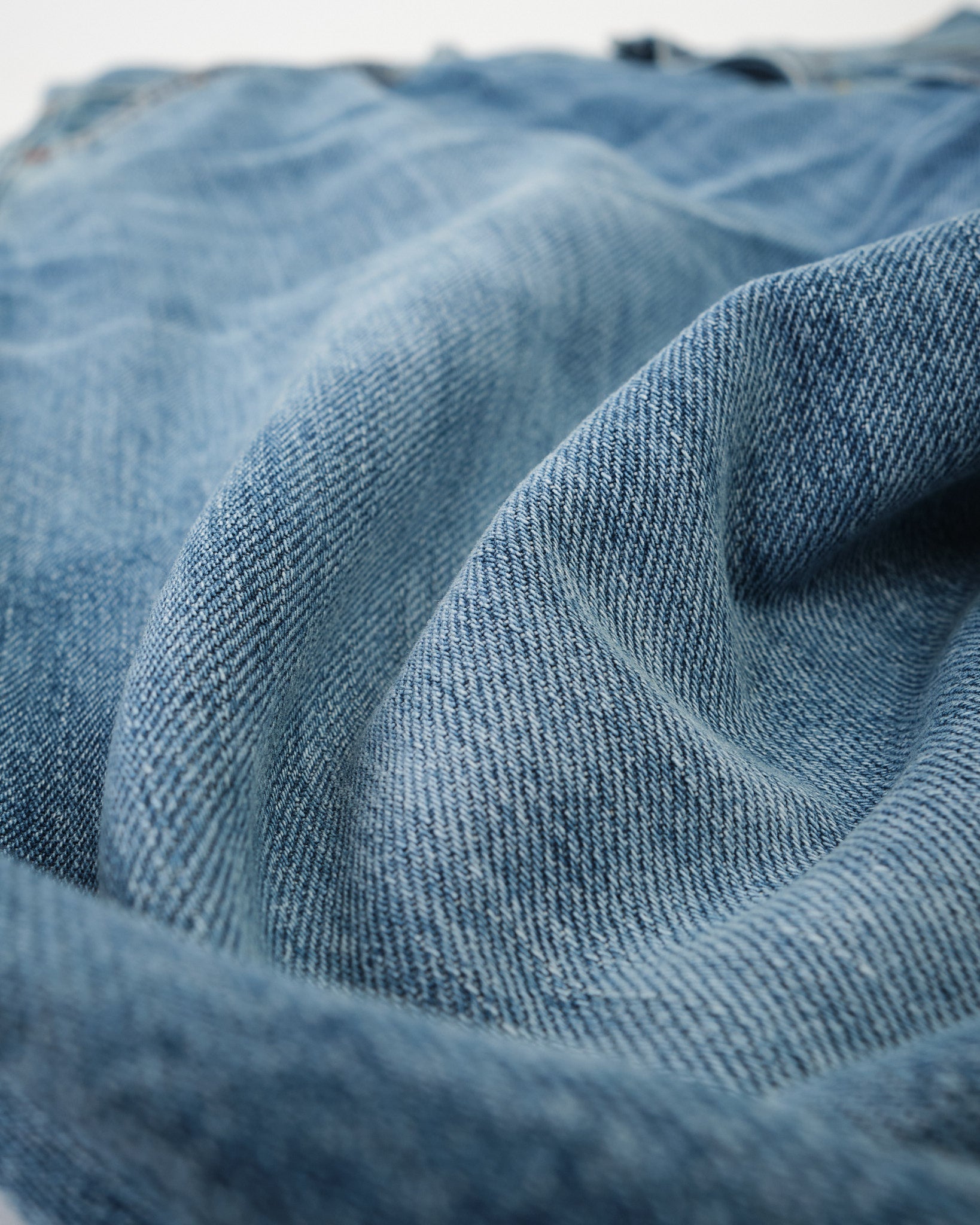 Hergestellt aus hochwertigem Denim, zeichnen sich diese Jeans durch eine hellblaue Indigowaschung mit fast weißen Höhepunkten und einer subtilen Wärme aus, die den gealterten Effekt verstärkt. Die robuste Textur mit ausgeprägten vertikalen Fadenverdickungen verleiht dem Stoff außergewöhnliche Tiefe, während das marmorähnliche Muster Kontraste in den dunkleren Bereichen hinzufügt. Das realistisch nachgebildete Ausbleichen und die Abnutzungserscheinungen schaffen von Tag eins an einen authentisch gelebten Look.
