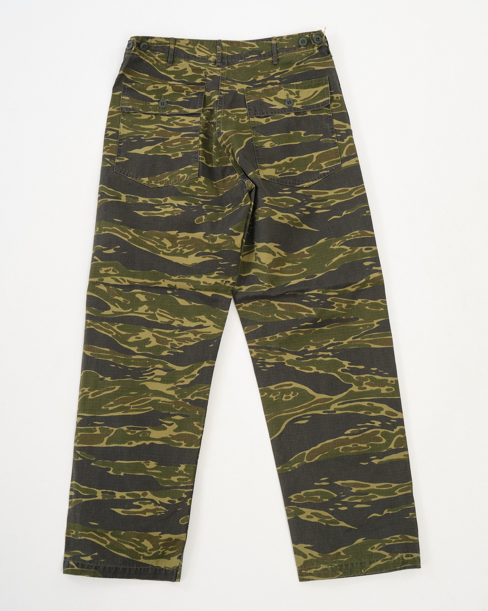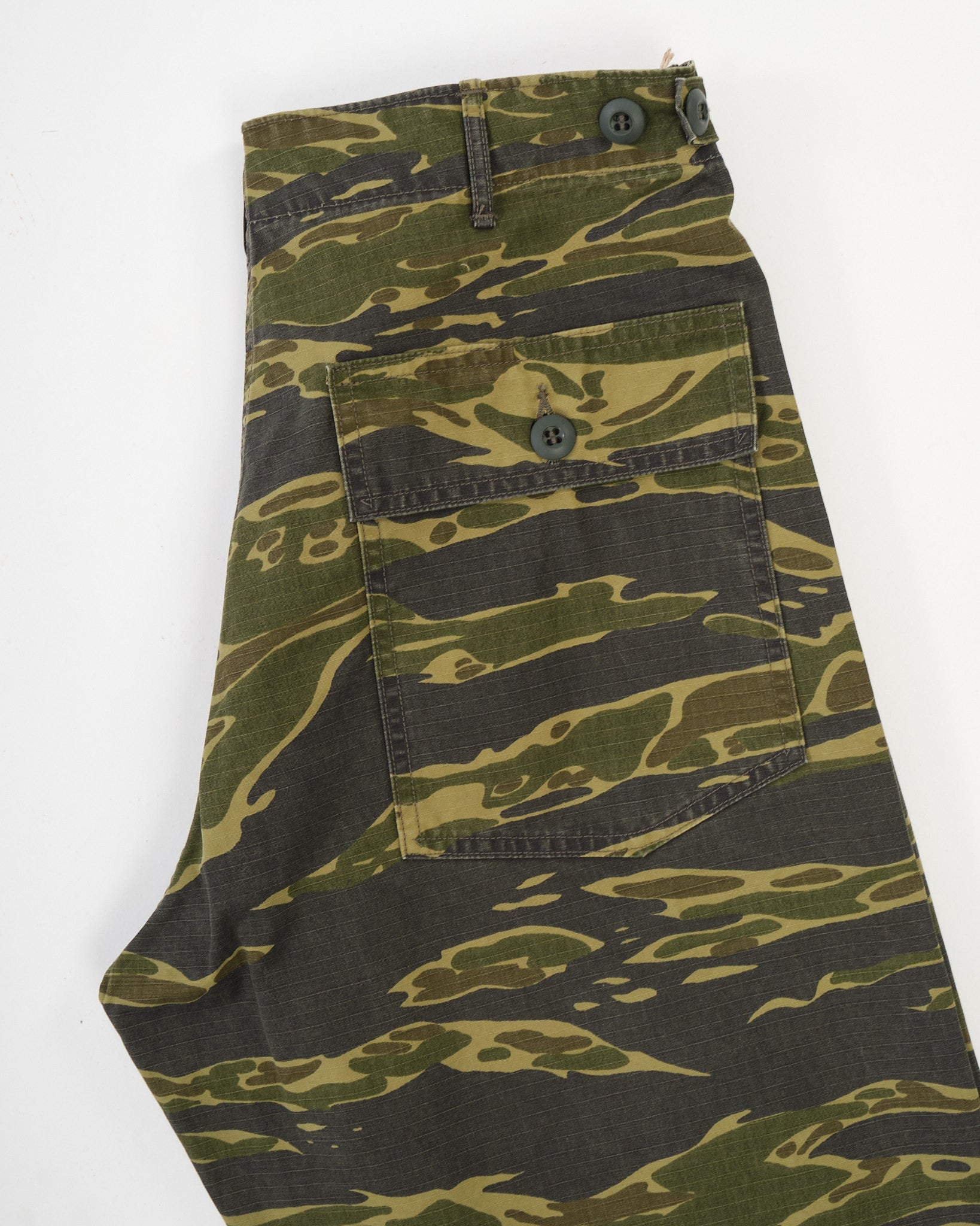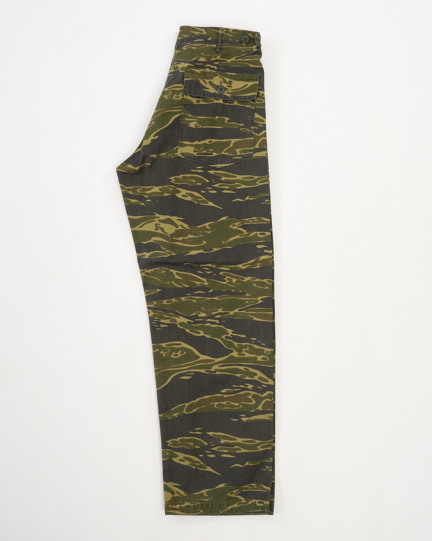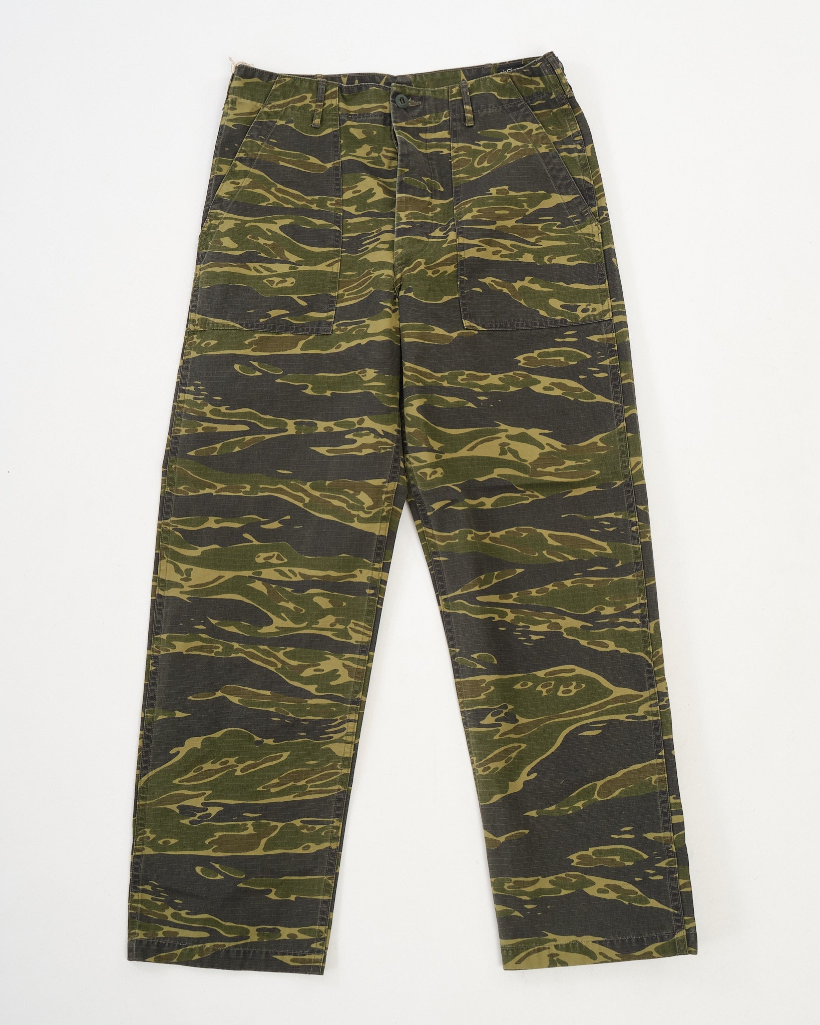 The standout is the tiger camo print, applied to a textured cotton that softens with wear while holding its shape. A regular straight-leg fit gives room through the thigh with light taper below the knee for a refined military silhouette. Whether worn full-length or cuffed, these are functional trousers with a bit of wild attitude—classic orSlow, with a camo twist.