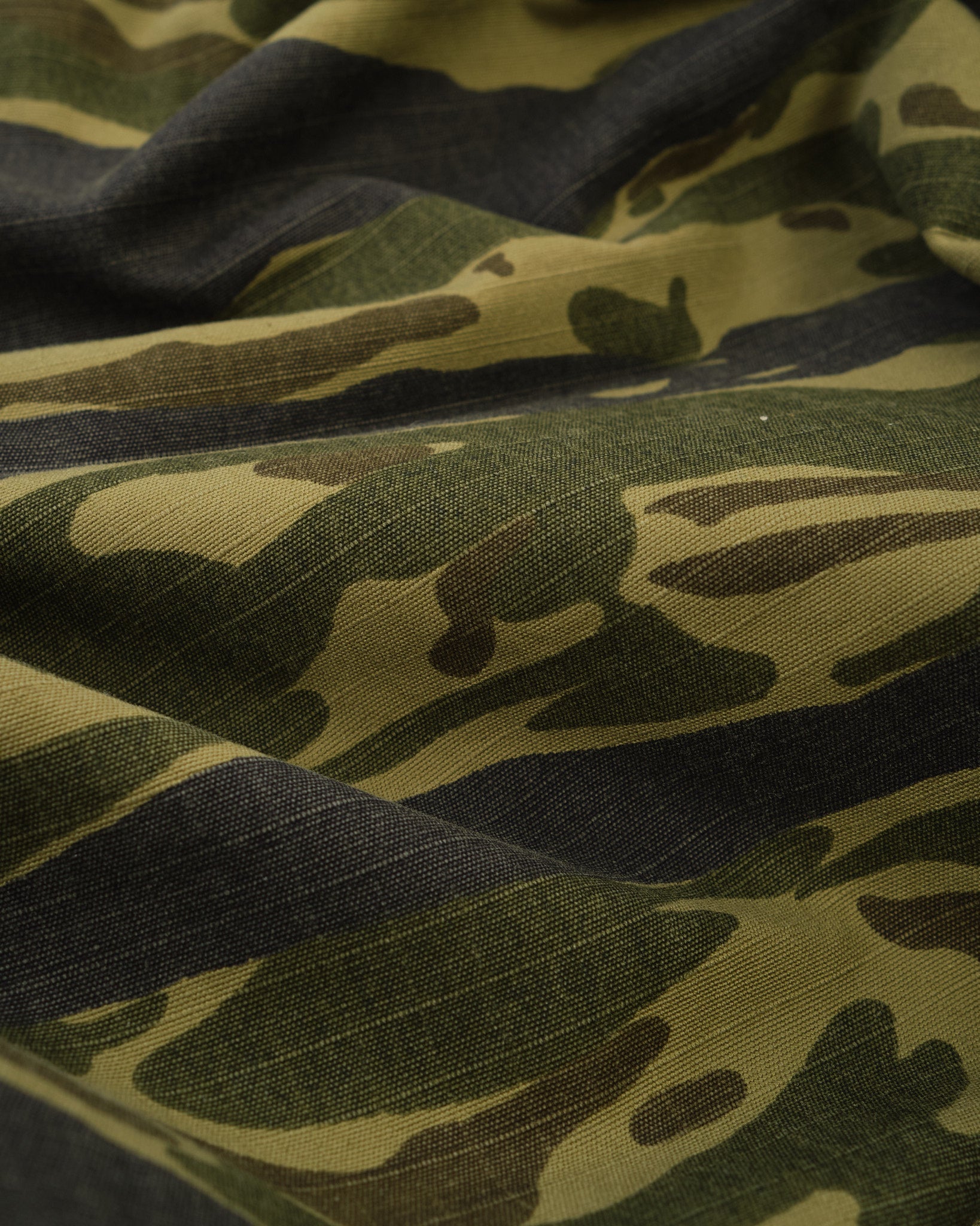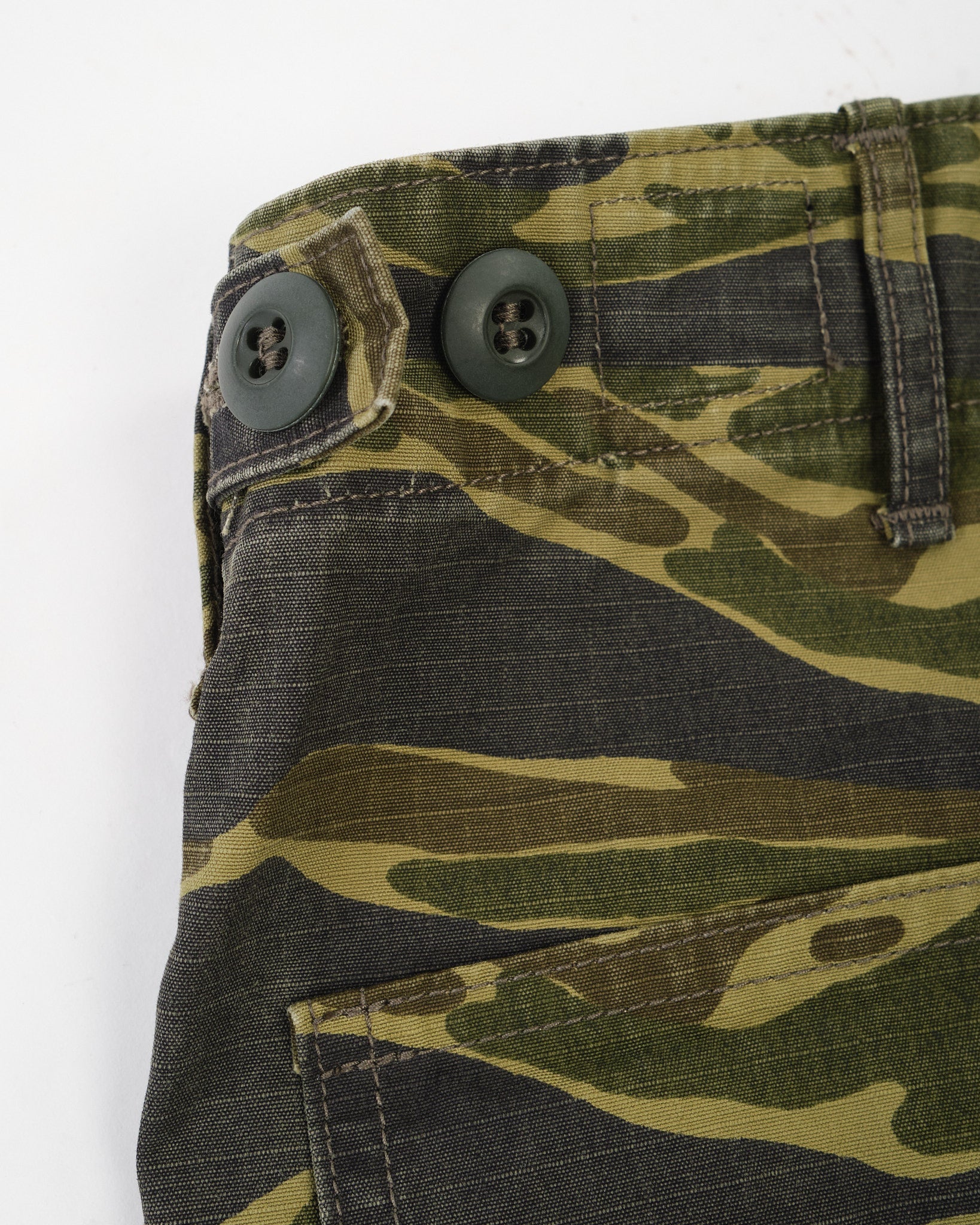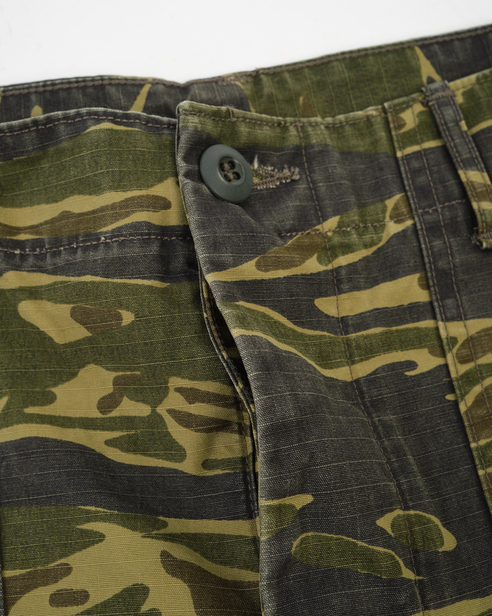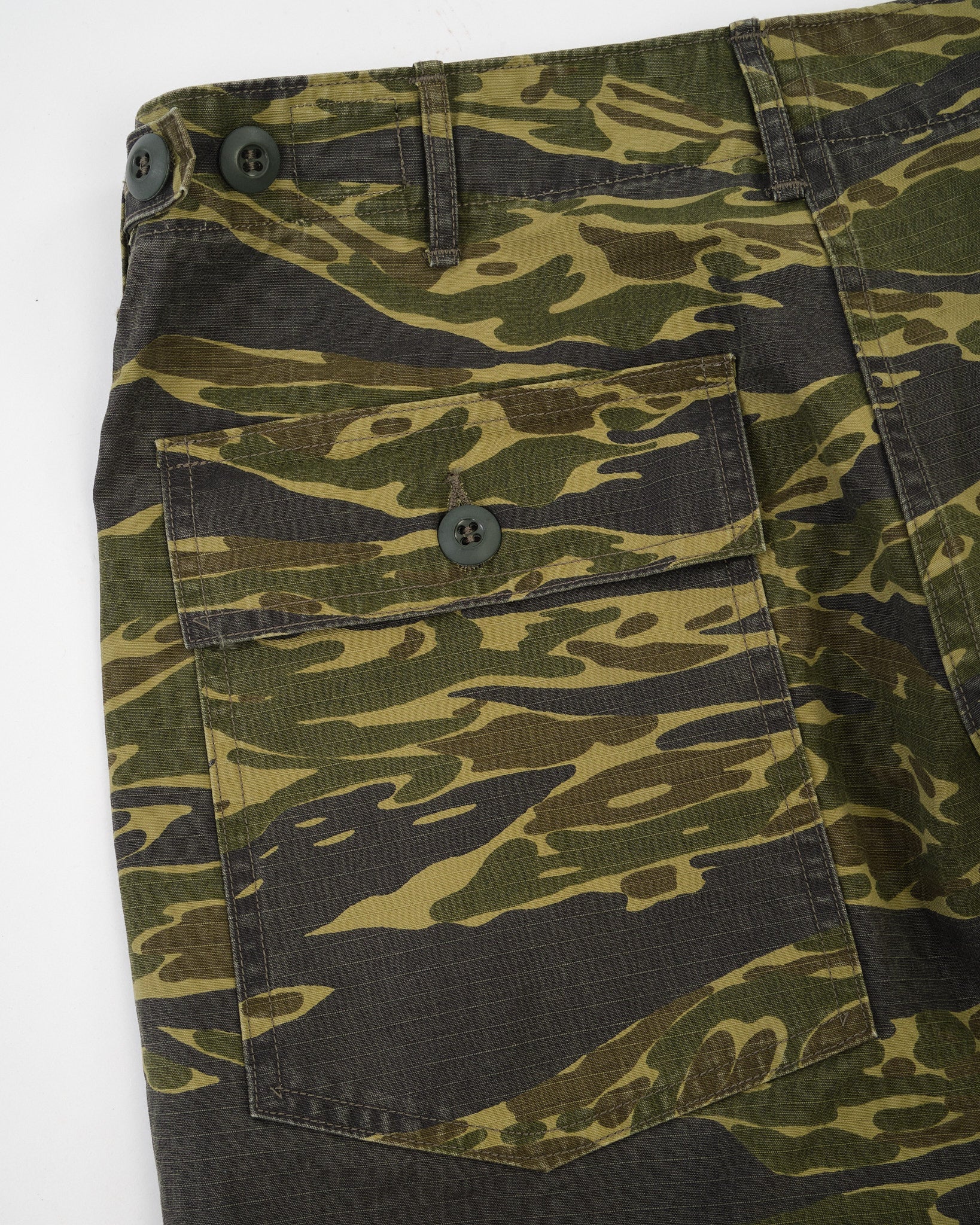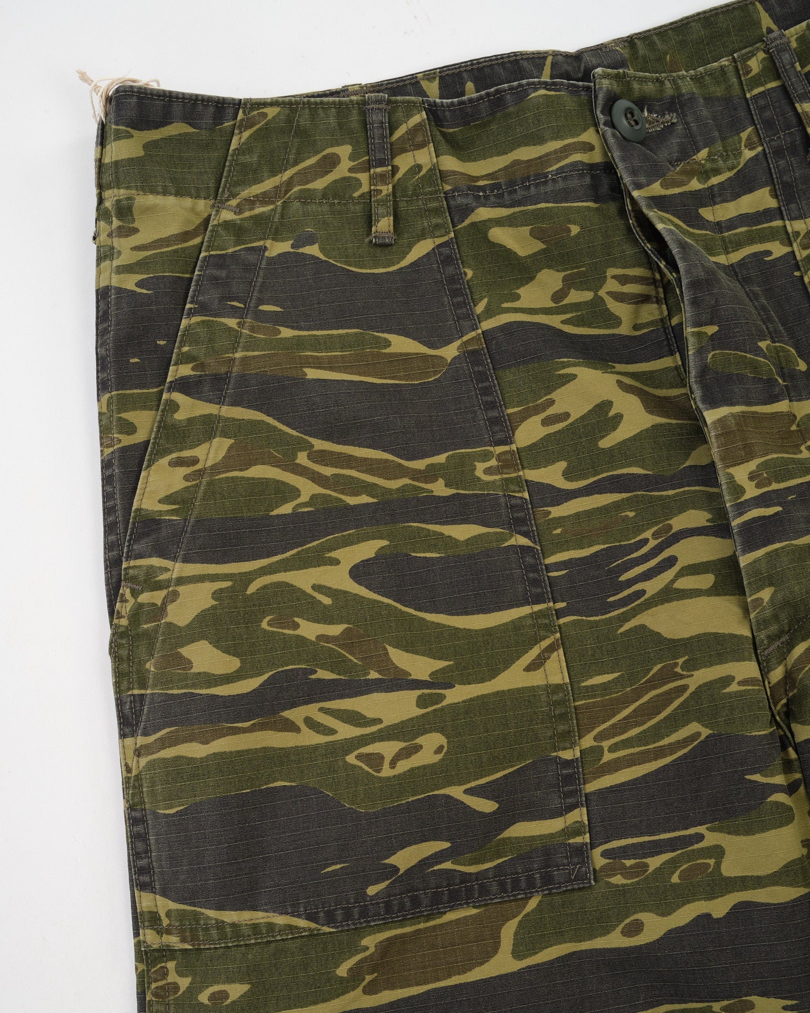 The standout is the tiger camo print, applied to a textured cotton that softens with wear while holding its shape. A regular straight-leg fit gives room through the thigh with light taper below the knee for a refined military silhouette. Whether worn full-length or cuffed, these are functional trousers with a bit of wild attitude—classic orSlow, with a camo twist.