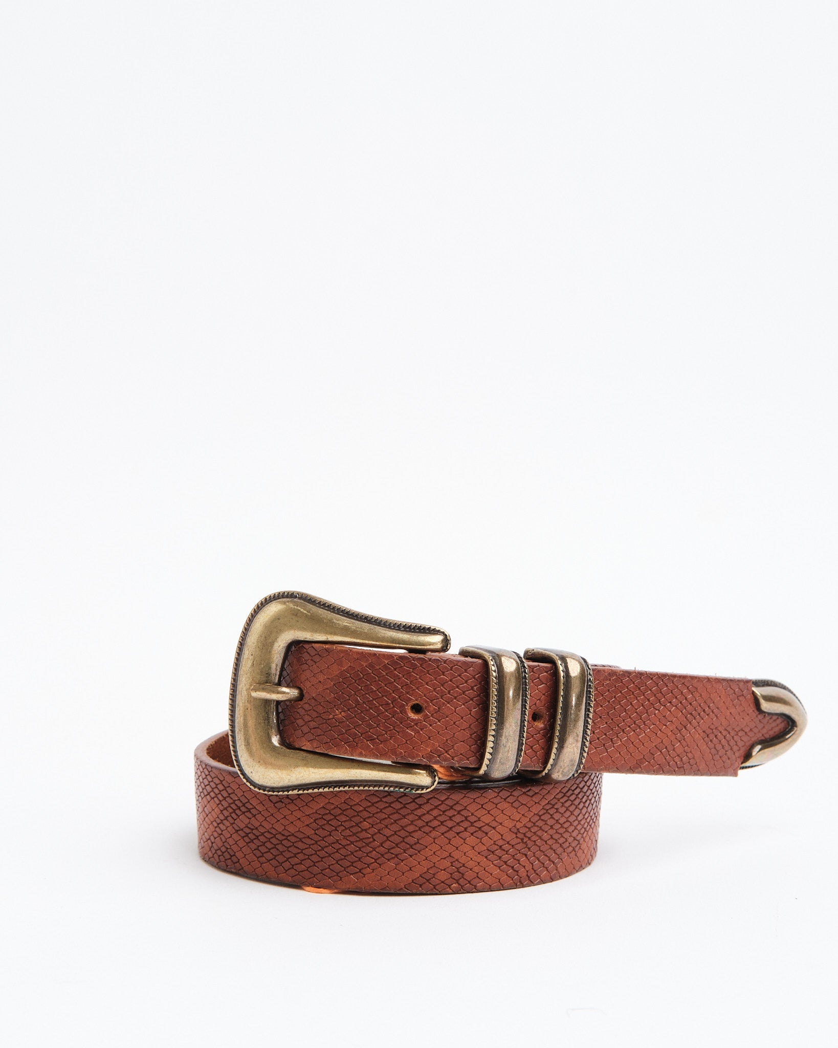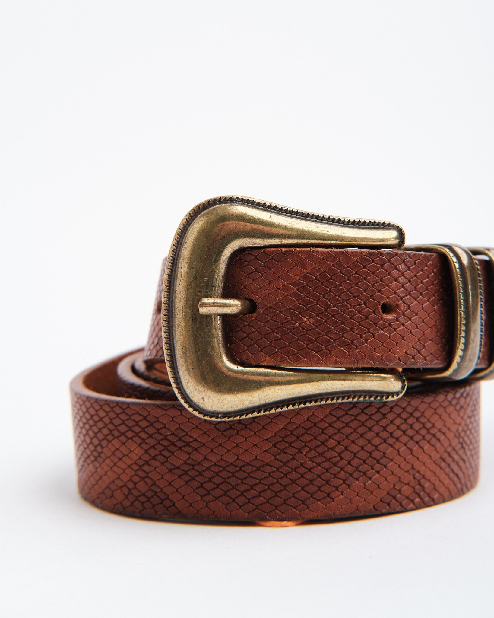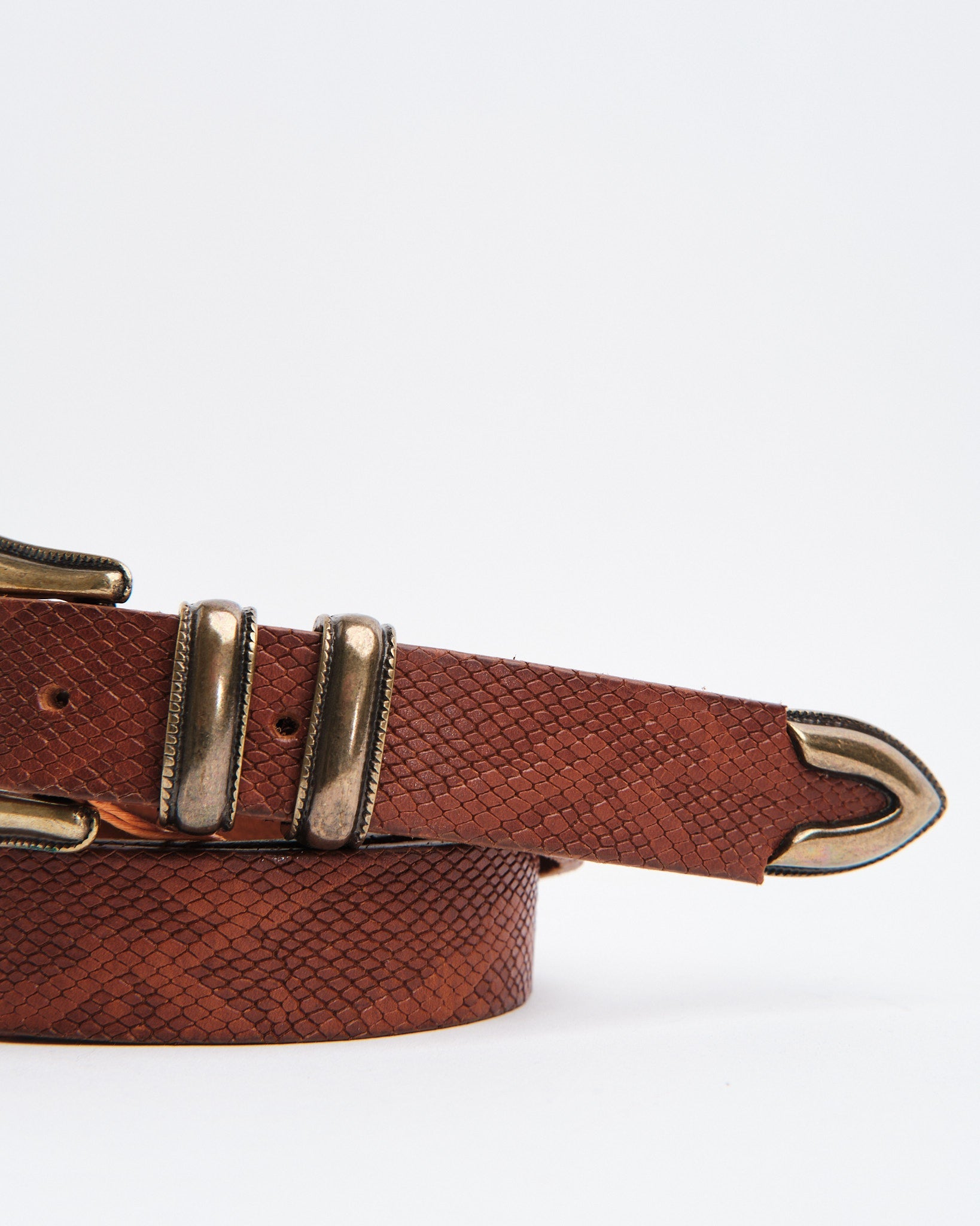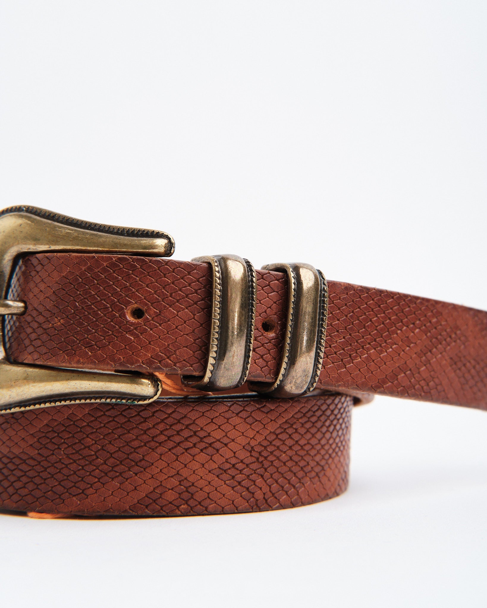 Western Faux Reptile Gürtel Cognac von Nudie Jeans Co. Gürtel aus feinstem pflanzlich gegerbtem Vollnarbenleder, geprägt mit einem Reptilienhautmuster. Die Metallschnalle, Spitze und Schlaufen des Gürtels sind alle an ihren Kanten verziert. 100% Leder mit einer Breite von 24 mm. Die Größen sind in cm. Hergestellt in Polen.