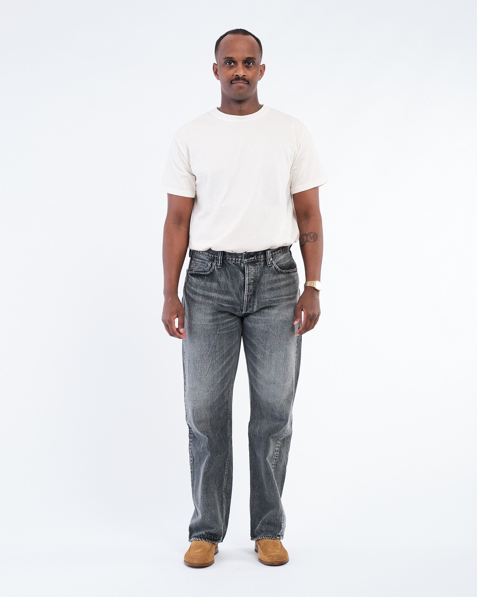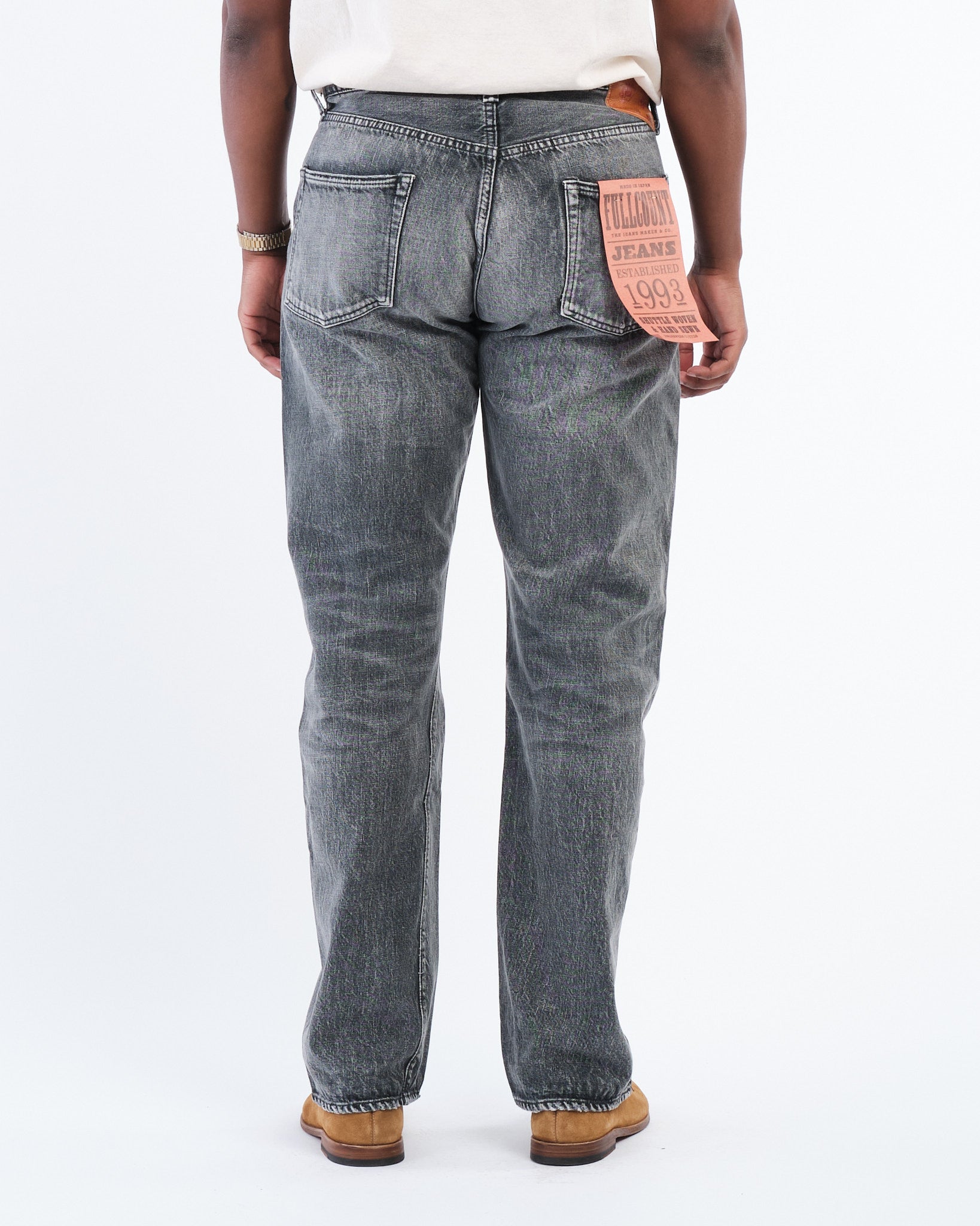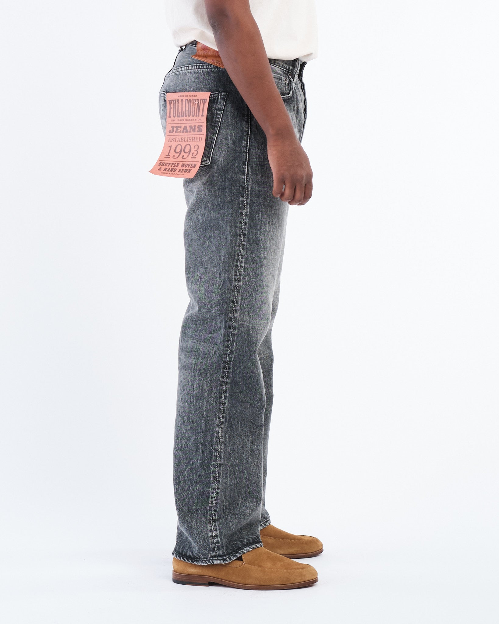 Die FULL COUNT 0105BKHW WIDE BLACK SELVEDGE DENIM DARTFORD (0105BKHW) ist für diejenigen gefertigt, die das langsame, schöne Altern von hochwertigem schwarzen Denim zu schätzen wissen. Hergestellt aus 13,7 Unzen Original-Selvedge-Schwarzdenim, sind diese Jeans aus 100% Simbabwe-Baumwolle gewebt, was überlegene Weichheit und Haltbarkeit garantiert. Die weitbeinige 0105 Silhouette, ein Full Count-Klassiker, bietet eine entspannte, aber strukturierte Passform. Im Gegensatz zu Indigo-Denim verblasst der mit Seil gefärbte schwarze Stoff allmählich und zeigt mit der Zeit vertikale Ausbleichungen. Auf Kraftwebstühlen in langsamen Tempo gewebt, behält dieser Denim die Stärke, Textur und den Komfort, die nur traditionelles Handwerk liefern kann.