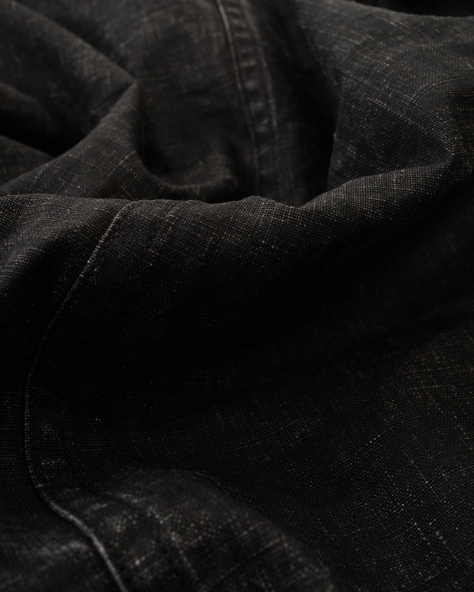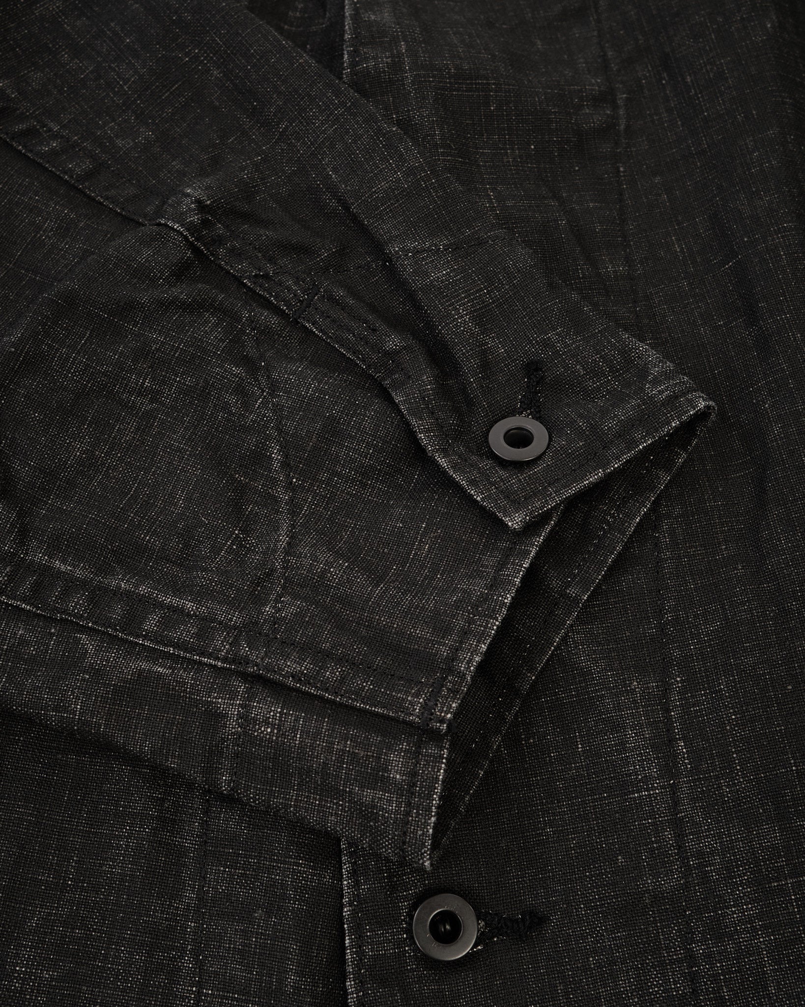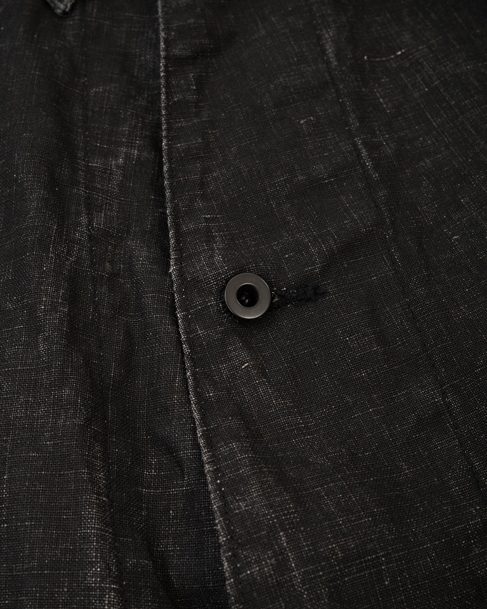 Cut in a classic coverall silhouette, the jacket features a relaxed, slightly boxy fit true to original wartime garments. The fabric is where this piece truly stands apart — a breathable linen base treated with a traditional sumi-inspired coating, giving the surface a deep, ink-like richness and subtle texture.