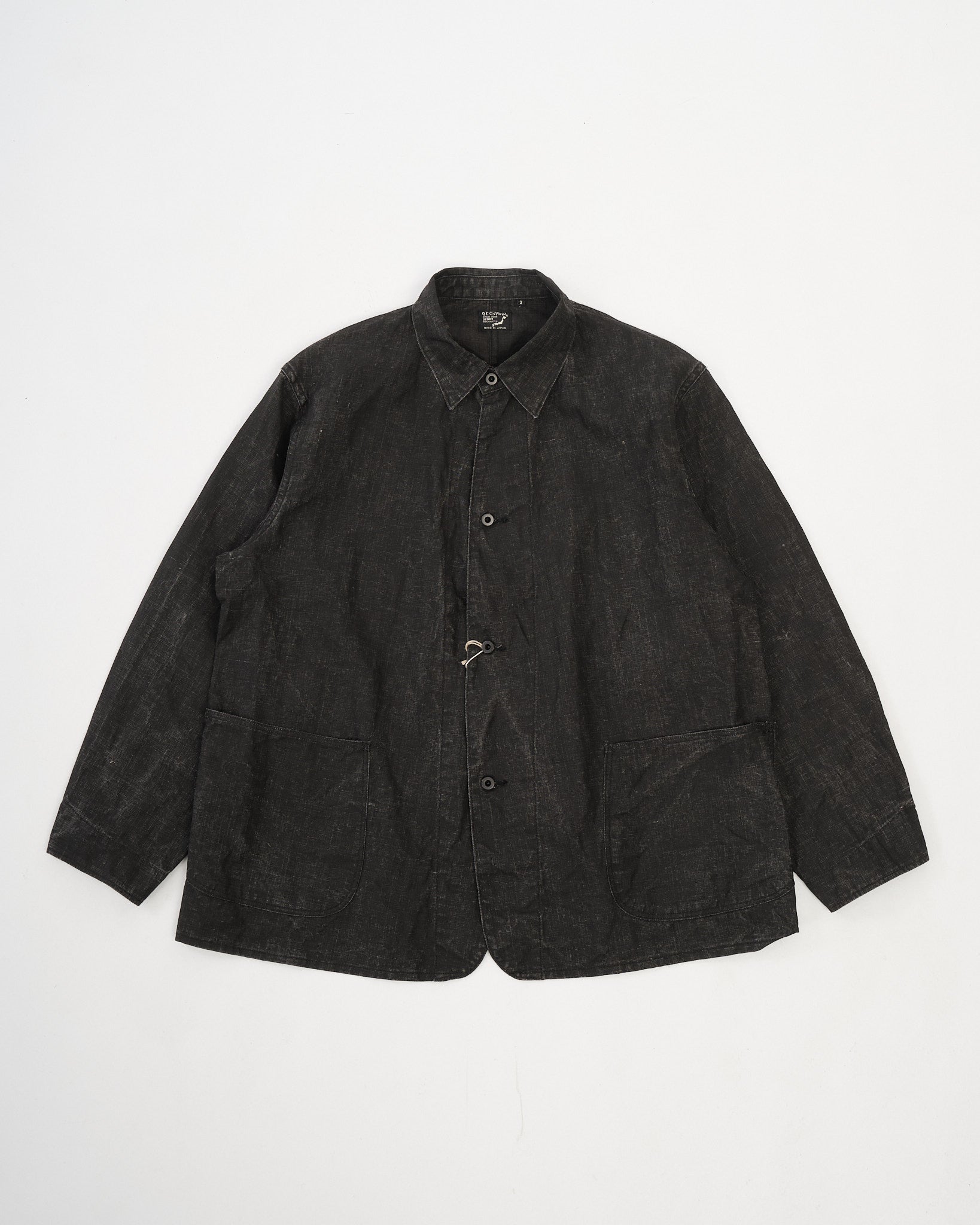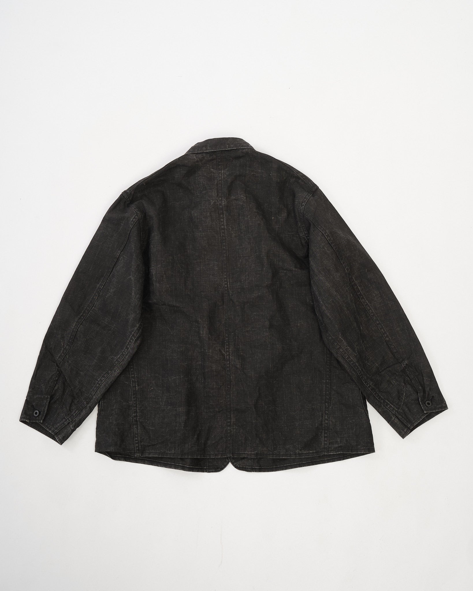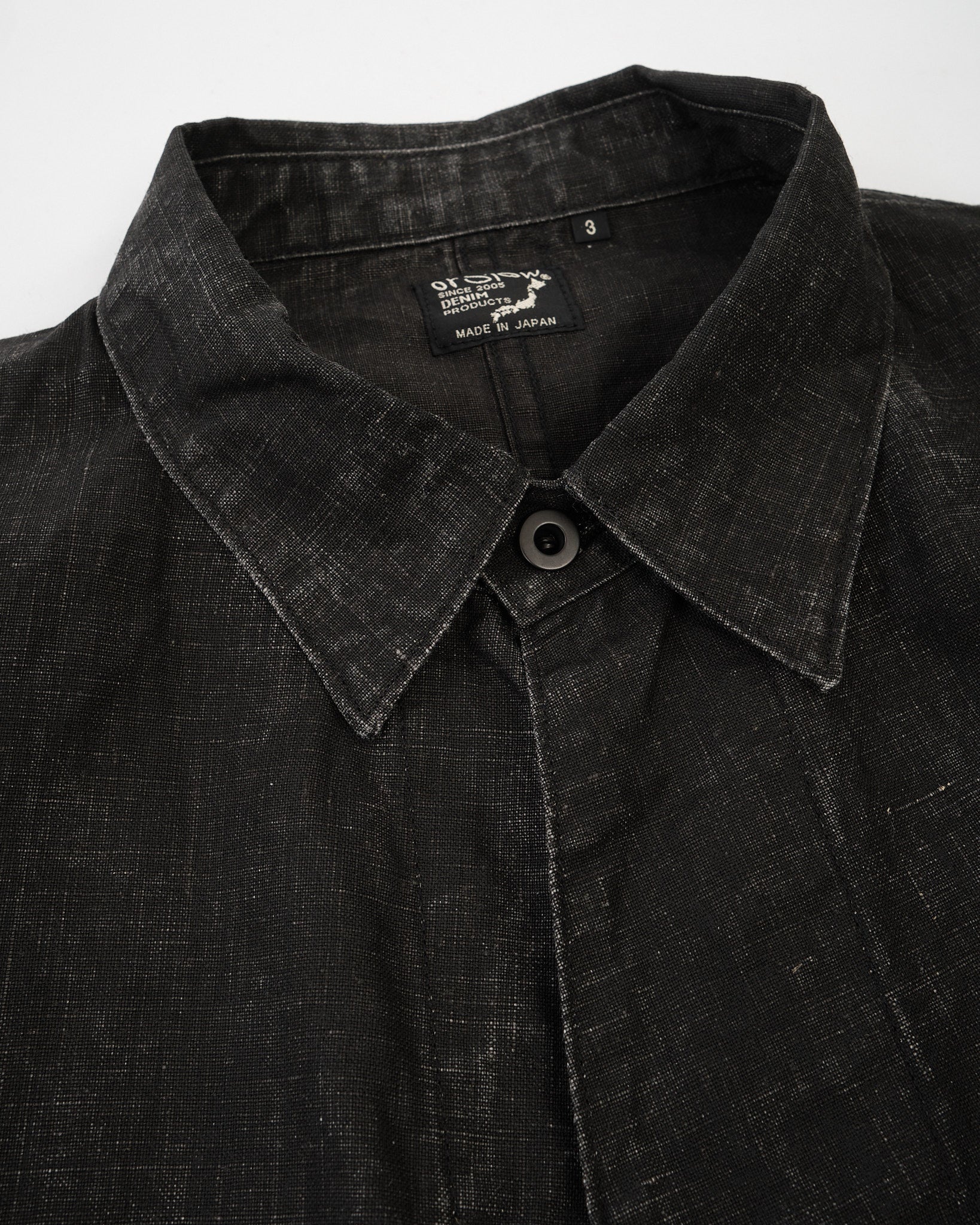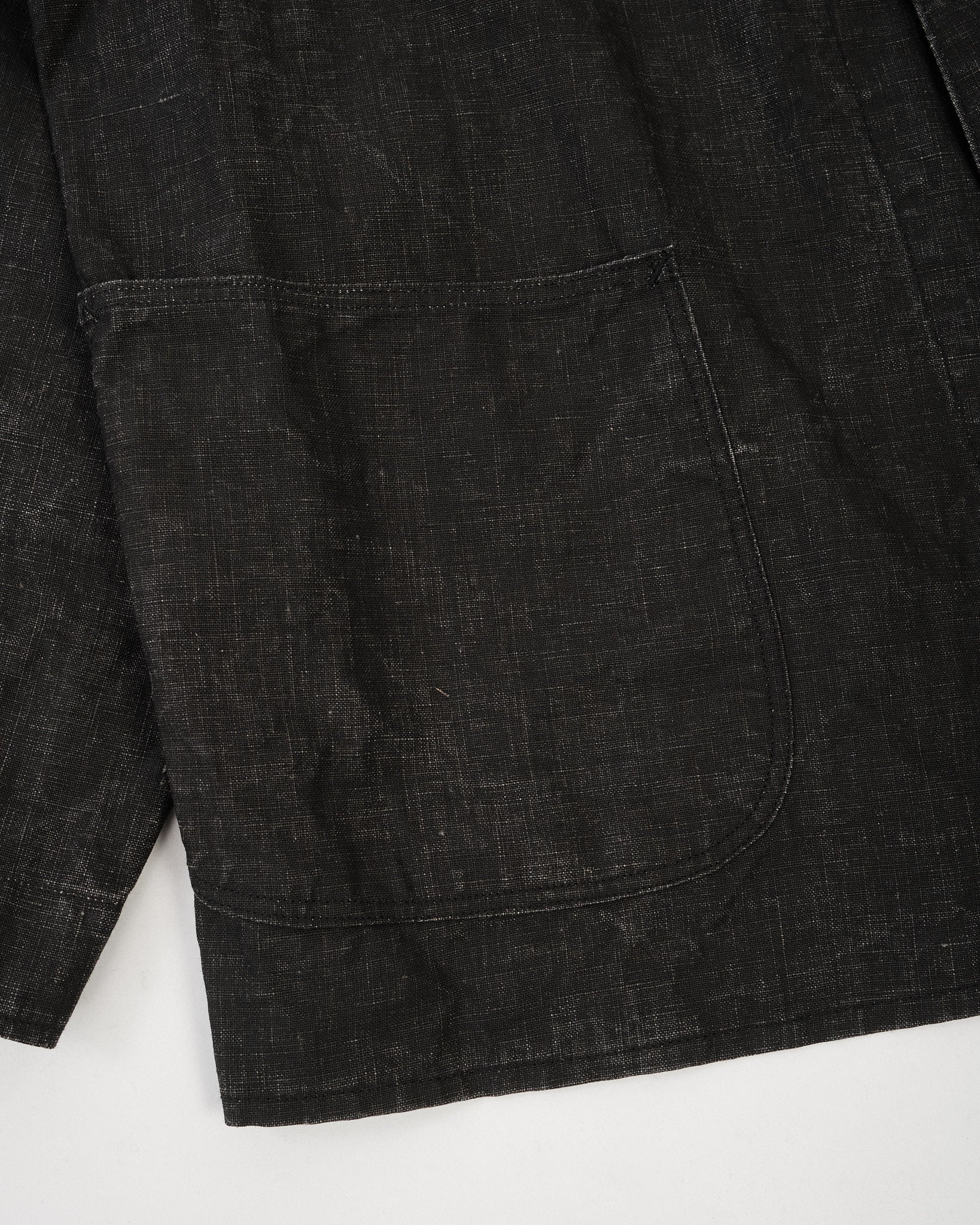 Cut in a classic coverall silhouette, the jacket features a relaxed, slightly boxy fit true to original wartime garments. The fabric is where this piece truly stands apart — a breathable linen base treated with a traditional sumi-inspired coating, giving the surface a deep, ink-like richness and subtle texture.