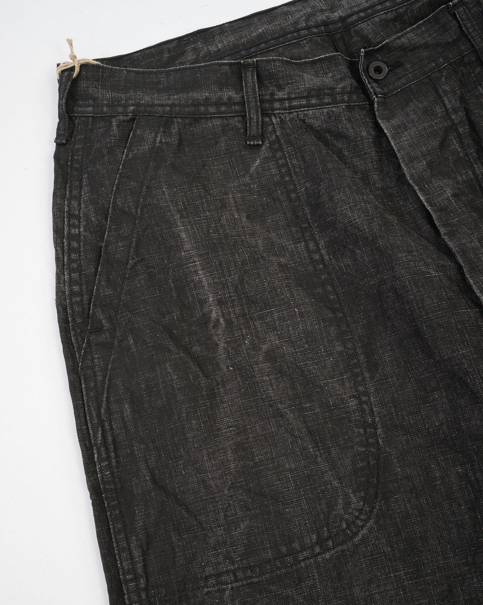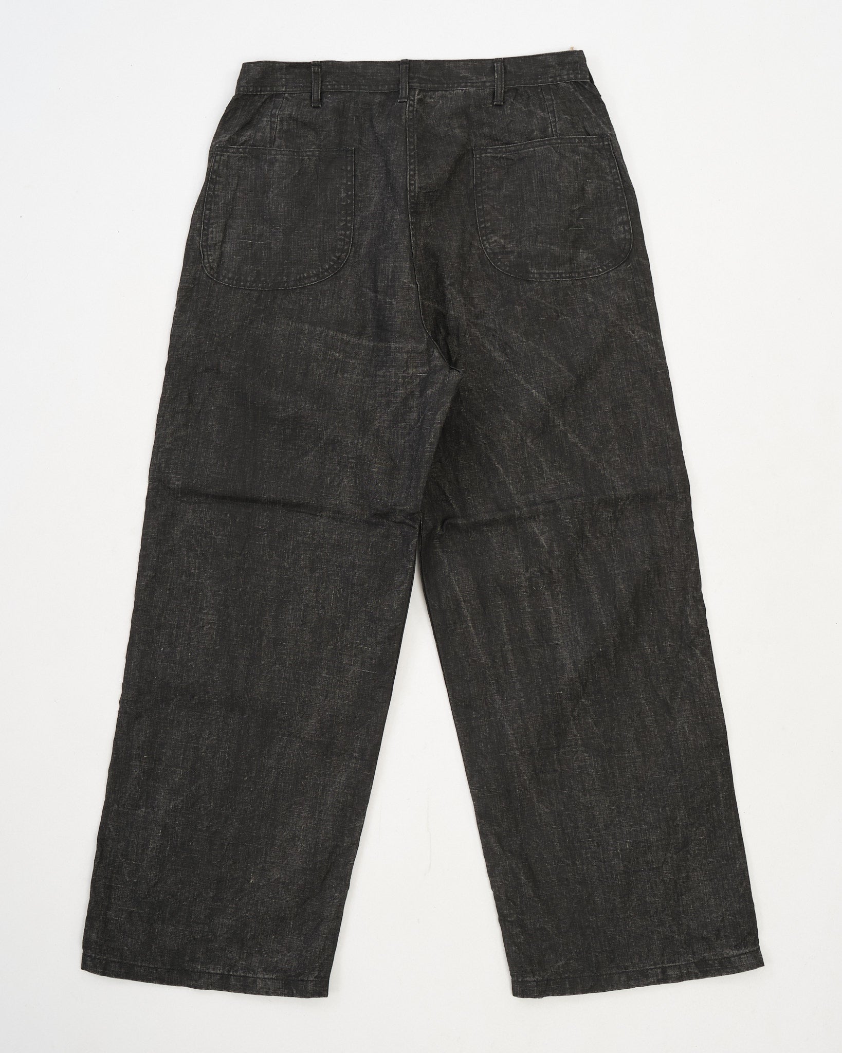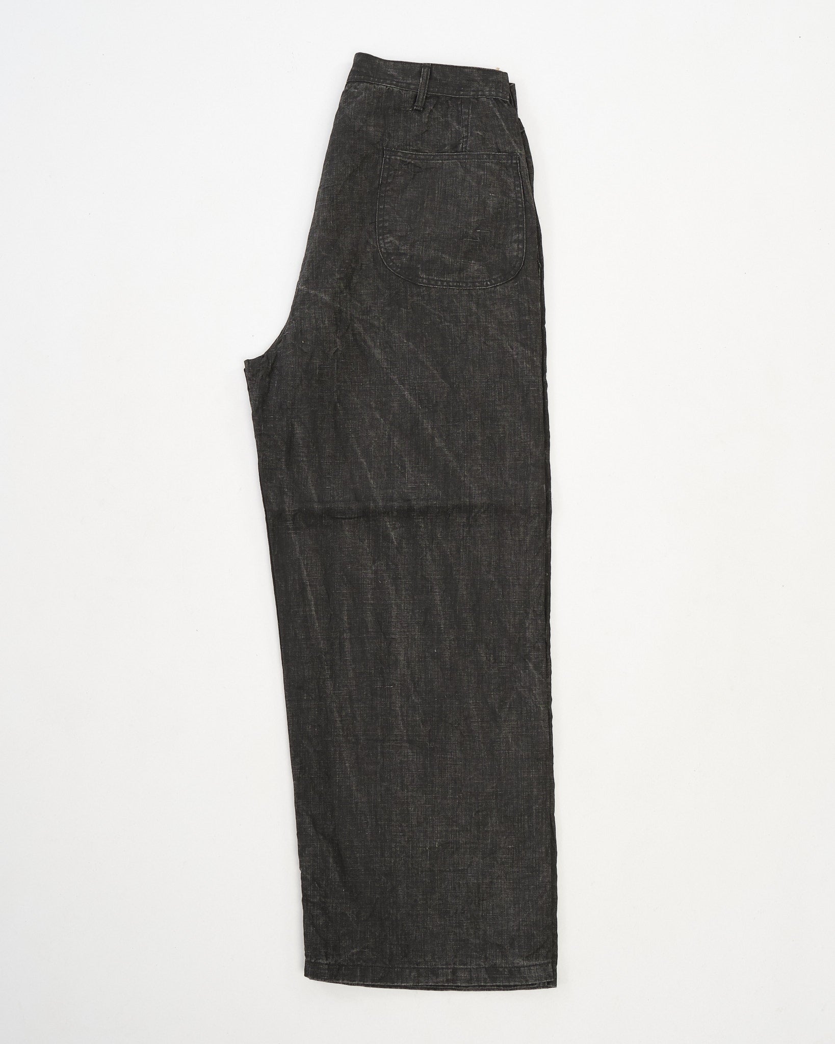 Constructed in Japan from a linen-based fabric and finished with a traditional sumi (Japanese ink) coating, these trousers feature a dry, matte texture and a lived-in, monochromatic look that deepens with wear. The fabric offers breathability thanks to its linen content while the sumi coating adds a subtle, structured body and a muted black tone.