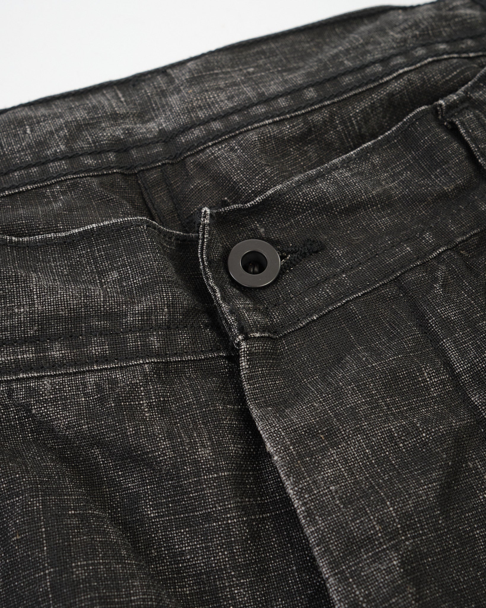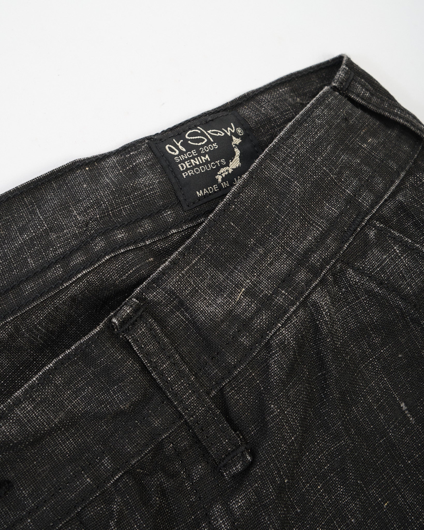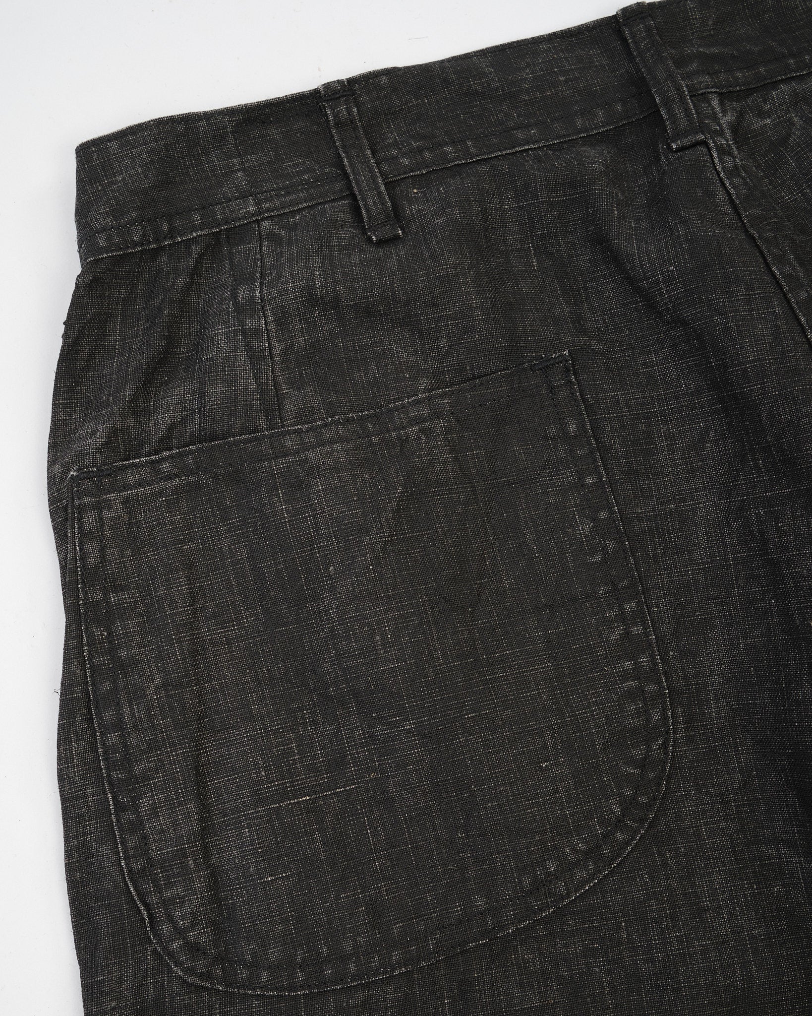 Constructed in Japan from a linen-based fabric and finished with a traditional sumi (Japanese ink) coating, these trousers feature a dry, matte texture and a lived-in, monochromatic look that deepens with wear. The fabric offers breathability thanks to its linen content while the sumi coating adds a subtle, structured body and a muted black tone.