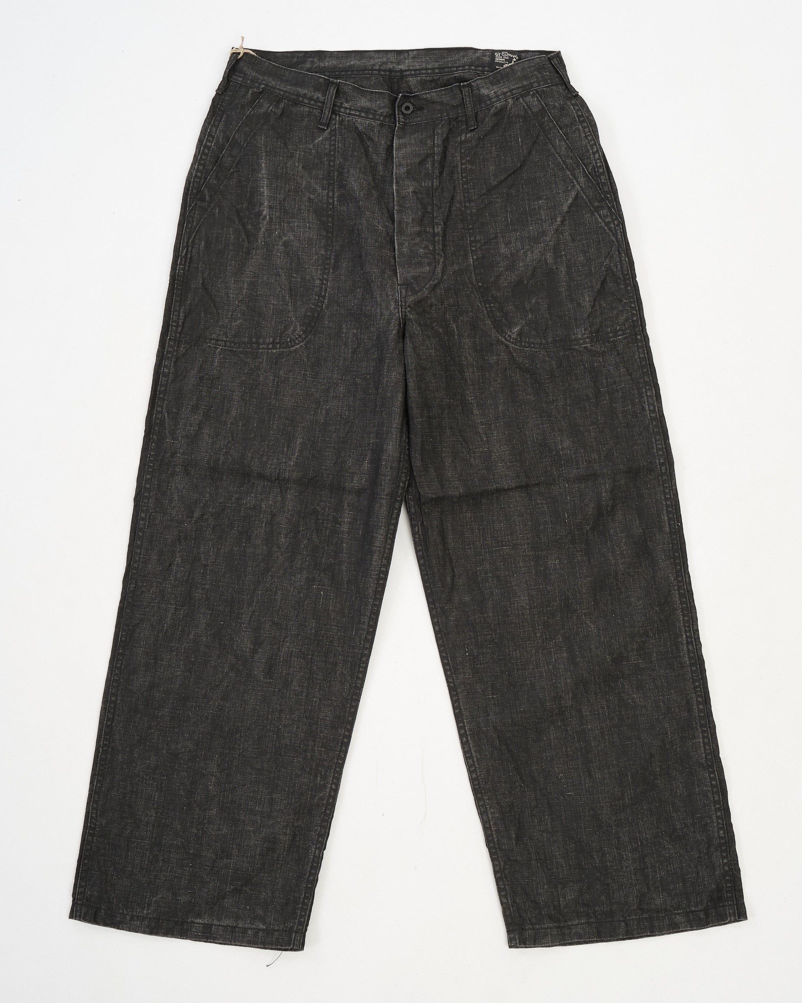 The wide-leg, high-rise silhouette stays true to the 1940s U.S. Navy work pant blueprint, with patch pockets, belt loops, and a button fly completing the utility-driven design. The look is distinctly archival, but the finish is entirely orSlow—quietly radical, deeply tactile, and unmistakably Japanese.